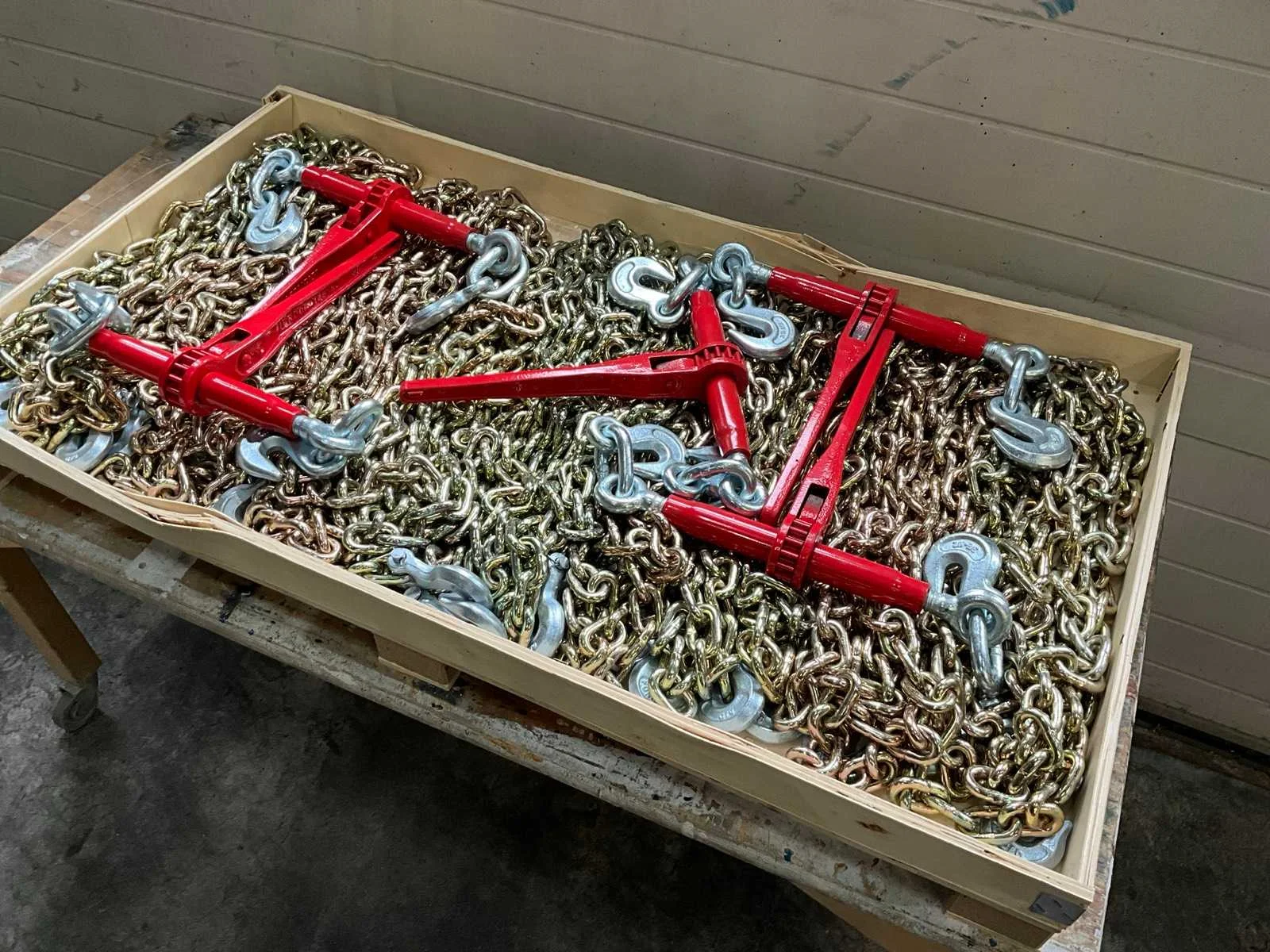 5 x lading spanner 4300 kg trekkracht per spanner, 10 x ketting 3/8” -1/2” 6 meter per stuk, ongebruikt