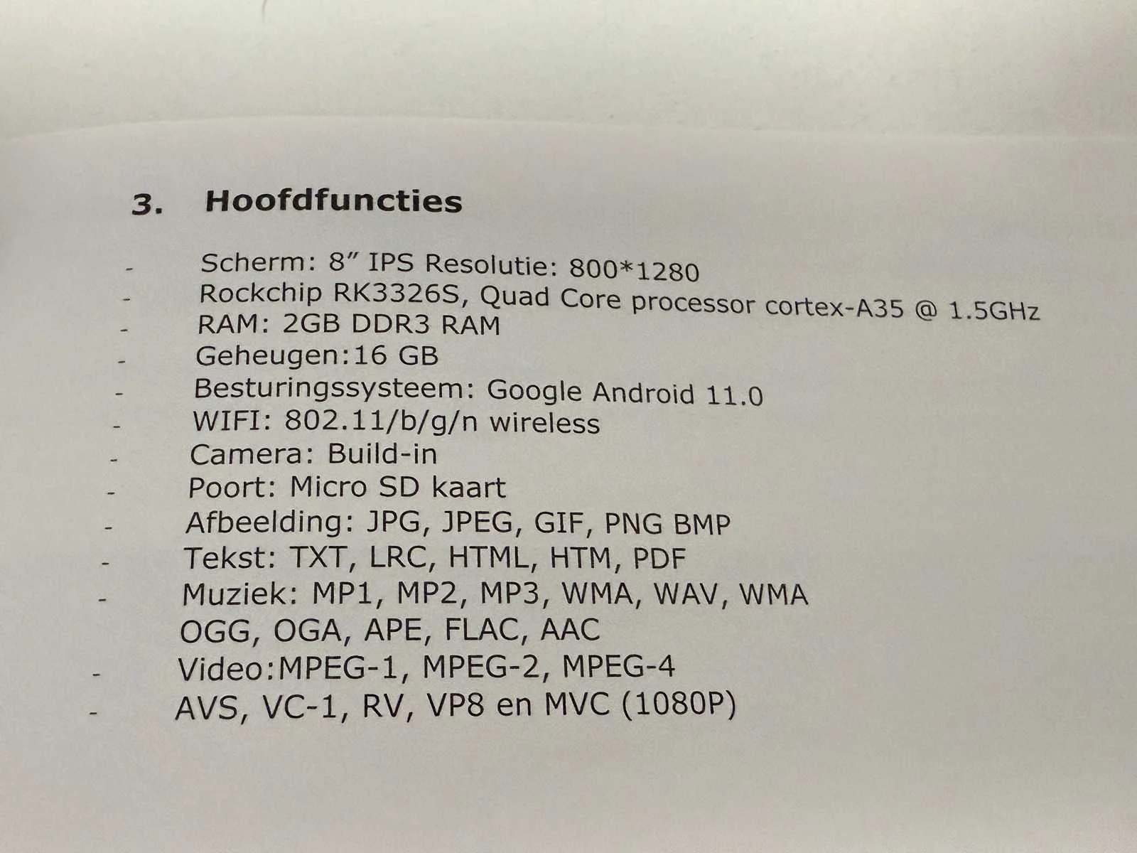 ONGEBRUIKT! in verpakking. 8'' Tablet + WIFI + bluetooth + Toetsenbord + Cover + Oordopjes + USB-kabel 2GB RAM + 16GB geheugen Extra Micro USB tot max 32GB mogelijk. + Camera +SD-Poort +Muziek MP1,MP2,MP3, WMA, WAV, WMA Video, MPEG-1 , MPEG-2, MPEG-4 Google Android besturing 11.0 Model: YC-83P Processor type: cortex-A35 Processorsnelheid Ghz: 1.5 SIM: true Camera: true Card reader: true Besturingssysteem: Google Android USB-Type: USB-C USB: 1 Wifi: true Bluetooth: true Touchscreen: true Capaciteit external geheugen: 32GB Geheugen: 16GB