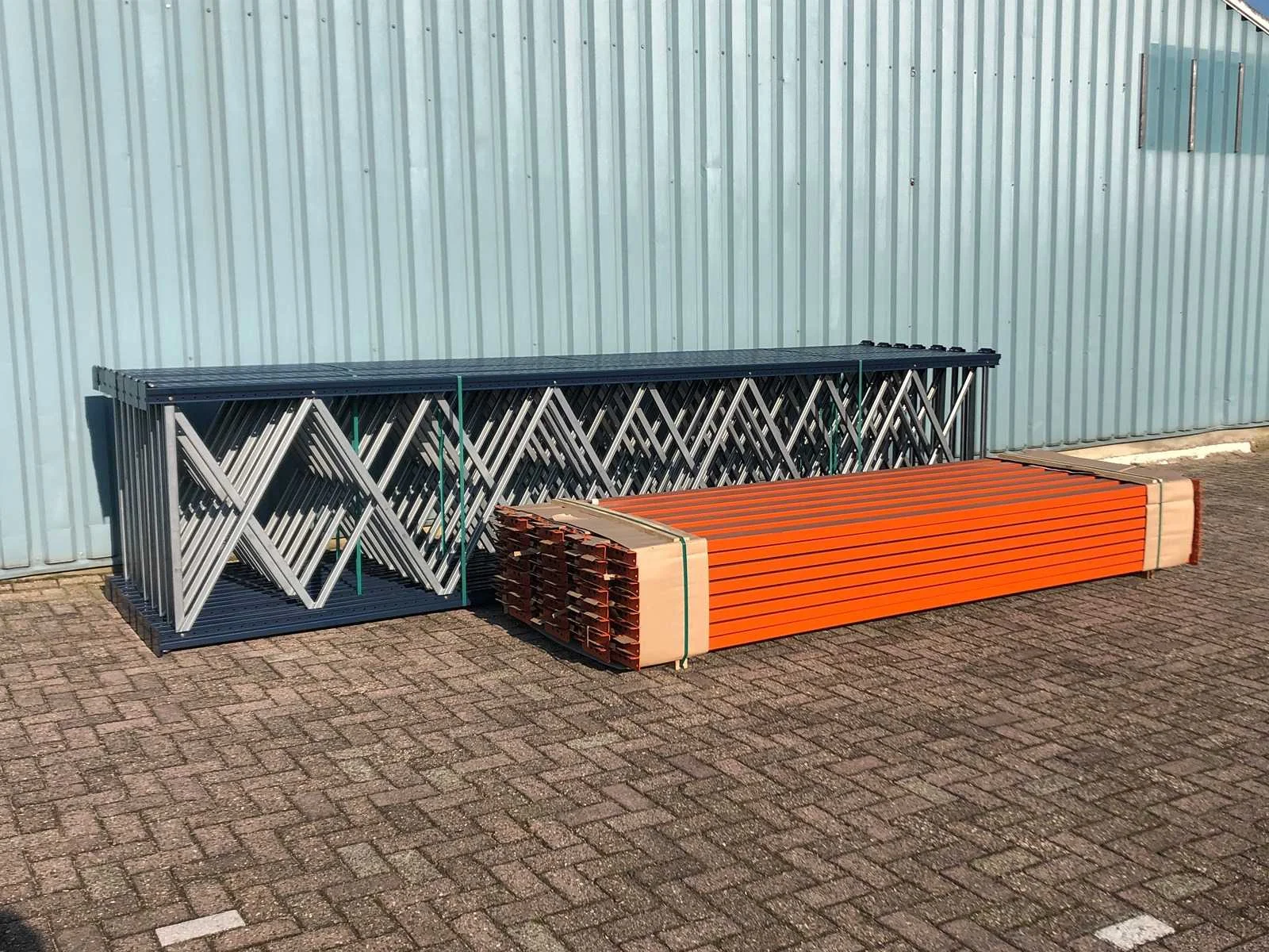 Palletstelling 39.0m lang met 2 niveaus en liggers 2.7m lang per vak. Ongebruikt super netjes Hoogte 500cm diepte 110cm 15 staanders 5000x1100 + 56 Liggers 2700mm Alles is gedemonteerd Incl voetplaten en borgpennen. (zonder de roosters op de laatste foto's, dit is een voorbeeld opgebouwd) Let op het juiste vervoer i.v.m. lengte en gewicht. Heftruck is aanwezig voor het laden. Sectie diepte: 2700mm Aantal staanders: 15 Aantal liggers: 56 Totale afmeting L: 3900cm Totale afmeting Hoogte: 500cm Lengte: 3900cm Breedte: 110cm Hoogte: 500cm