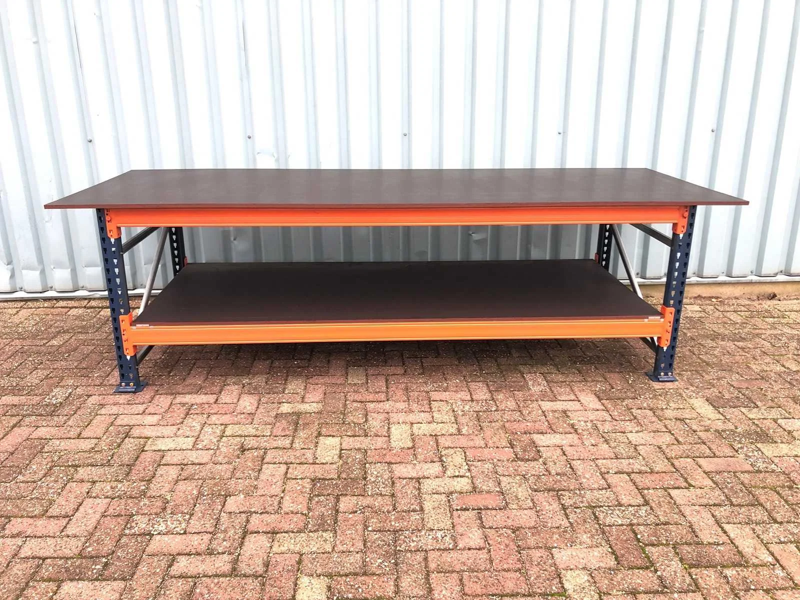 Zware werkbank uitgevoerd met gladde Betonplex platen van 18mm dik. LET OP, werkbank is ongebruikt! Bladmaat: 3276x1190x18mm Framemaat: 2860x1100mm Incl onderschap 2676x1190x18mm Goede en fijne werkhoogte: 965mm (bovenkant werkblad) Gemakkelijk in elkaar te zetten. Werkbank word in losse onderdelen meegegeven. Alles is op maat en is gemakkelijk in elkaar te zetten aan de hand van de aangegeven foto's Word netjes als pakket meegegeven zoals op laatste 2 foto's. Is met heftruck te laden.
