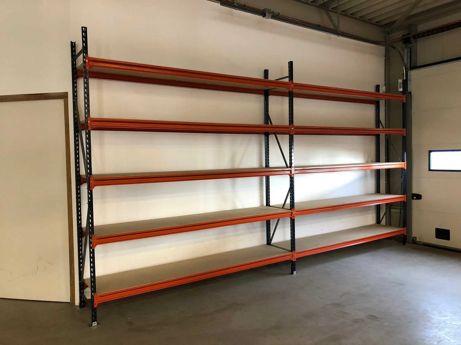 Nette legbordstelling / Grootvakstelling. Is al Gedemonteerd! 3 staanders 2500x500mm 20 liggers 1825mm incl 10 legborden Merk: Mecalux Aantal staanders: 3 Aantal legborden: 10 Demontabel: true Lengte: 380cm Breedte: 50cm Hoogte: 250cm