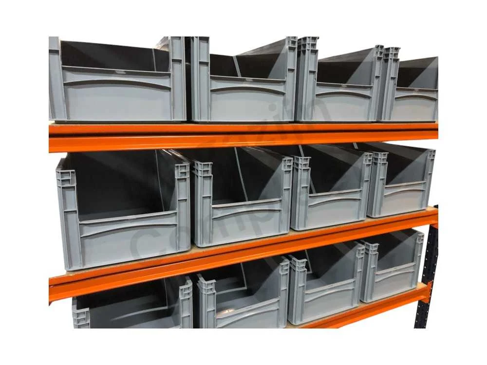 ONGEBRUIKT! Legbordstellingen incl 32 grijze magazijnbakken. Bakken schoon en ongebruikt Afmeting magazijnbakken 600x400x320 met grijpopening. Stelling totale lengte: 3800mm lang. ( 2 vakken van 1825mm ) Hoogte: 2000mm. Diepte: 600mm. Lengte per sectie: 1825mm. Geheel is ongebruikte en gedemonteerd, klaar om af te halen. Sectie afm. b: 1825mm Aantal staanders: 3 Aantal legborden: 10 Demontabel: true Lengte: 380cm Hoogte: 200cm