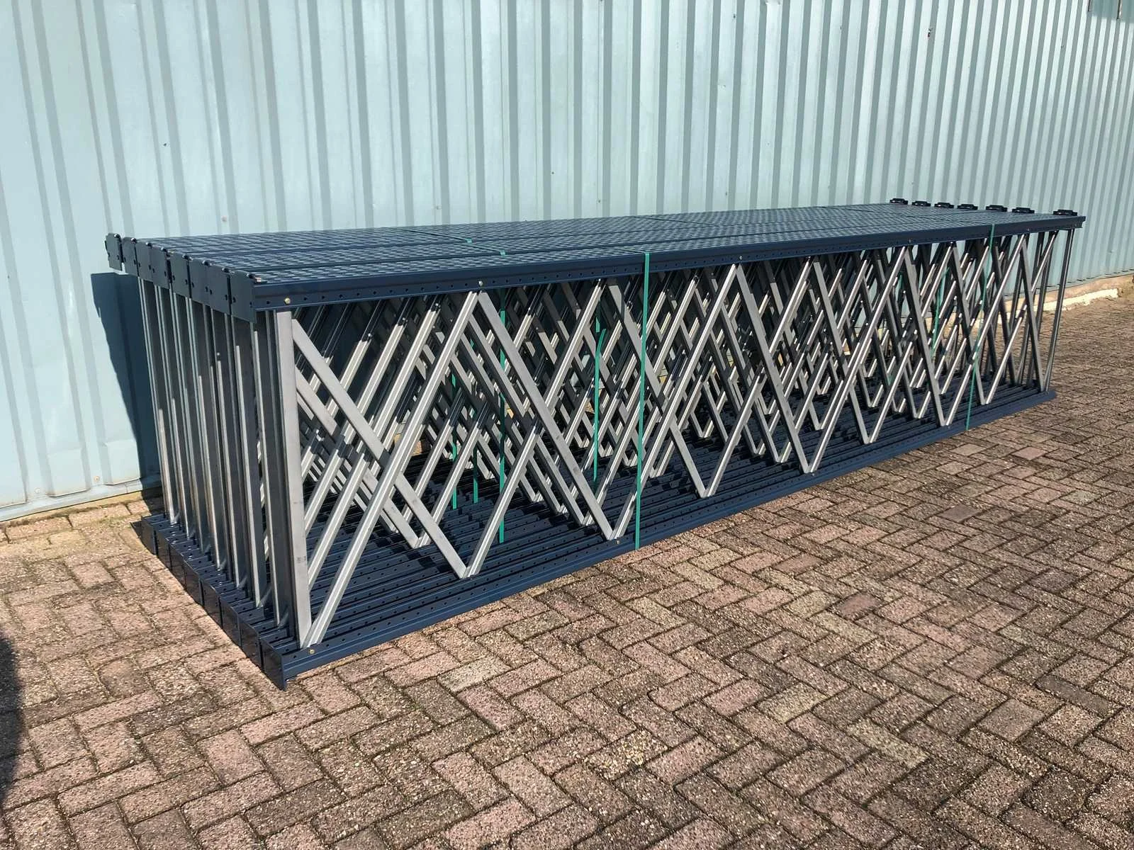 Palletstelling 39.0m lang met 2 niveaus en liggers 2.7m lang per vak. Ongebruikt super netjes Hoogte 500cm diepte 110cm 15 staanders 5000x1100 + 56 Liggers 2700mm Alles is gedemonteerd Incl voetplaten en borgpennen. (zonder de roosters op de laatste foto's, dit is een voorbeeld opgebouwd) Let op het juiste vervoer i.v.m. lengte en gewicht. Heftruck is aanwezig voor het laden. Sectie diepte: 2700mm Aantal staanders: 15 Aantal liggers: 56 Totale afmeting L: 3900cm Totale afmeting Hoogte: 500cm Lengte: 3900cm Breedte: 110cm Hoogte: 500cm
