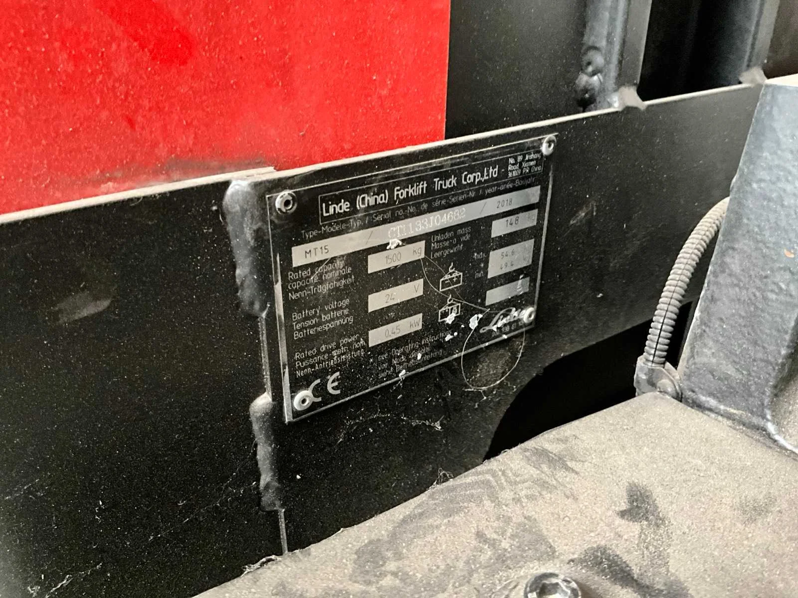 Ingebouwde 24 Volt acculader Merk: Linde Type: MT15 Bouwjaar: 2018 Hefvermogen: 1500kg Lepellengte: 1150mm Accu lader: true Eigen gewicht: 148kg Totale afmeting L: 1600mm Totale afmeting Breedte: 570mm Totale afmeting Hoogte: 1200mm