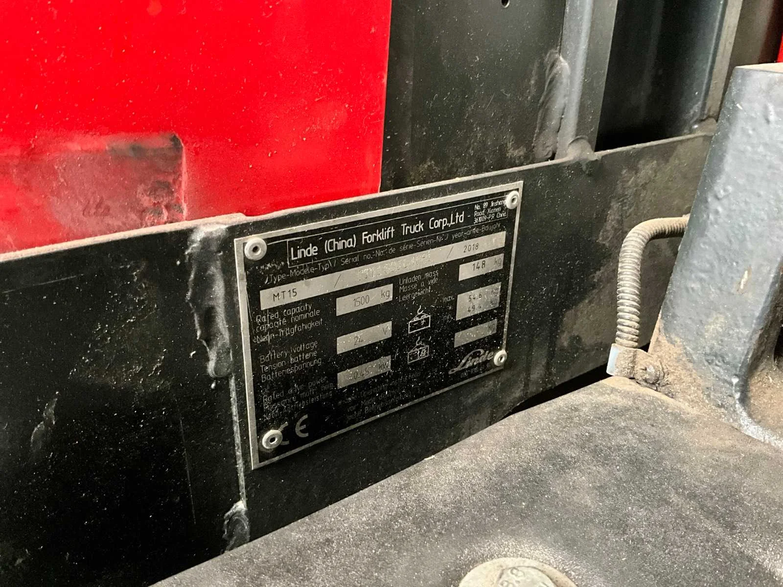 Ingebouwde 24 Volt acculader Merk: Linde Type: MT15 Bouwjaar: 2018 Hefvermogen: 1500kg Lepellengte: 1150mm Accu lader: true Eigen gewicht: 148kg Totale afmeting L: 1600mm Totale afmeting Breedte: 570mm Totale afmeting Hoogte: 1200mm