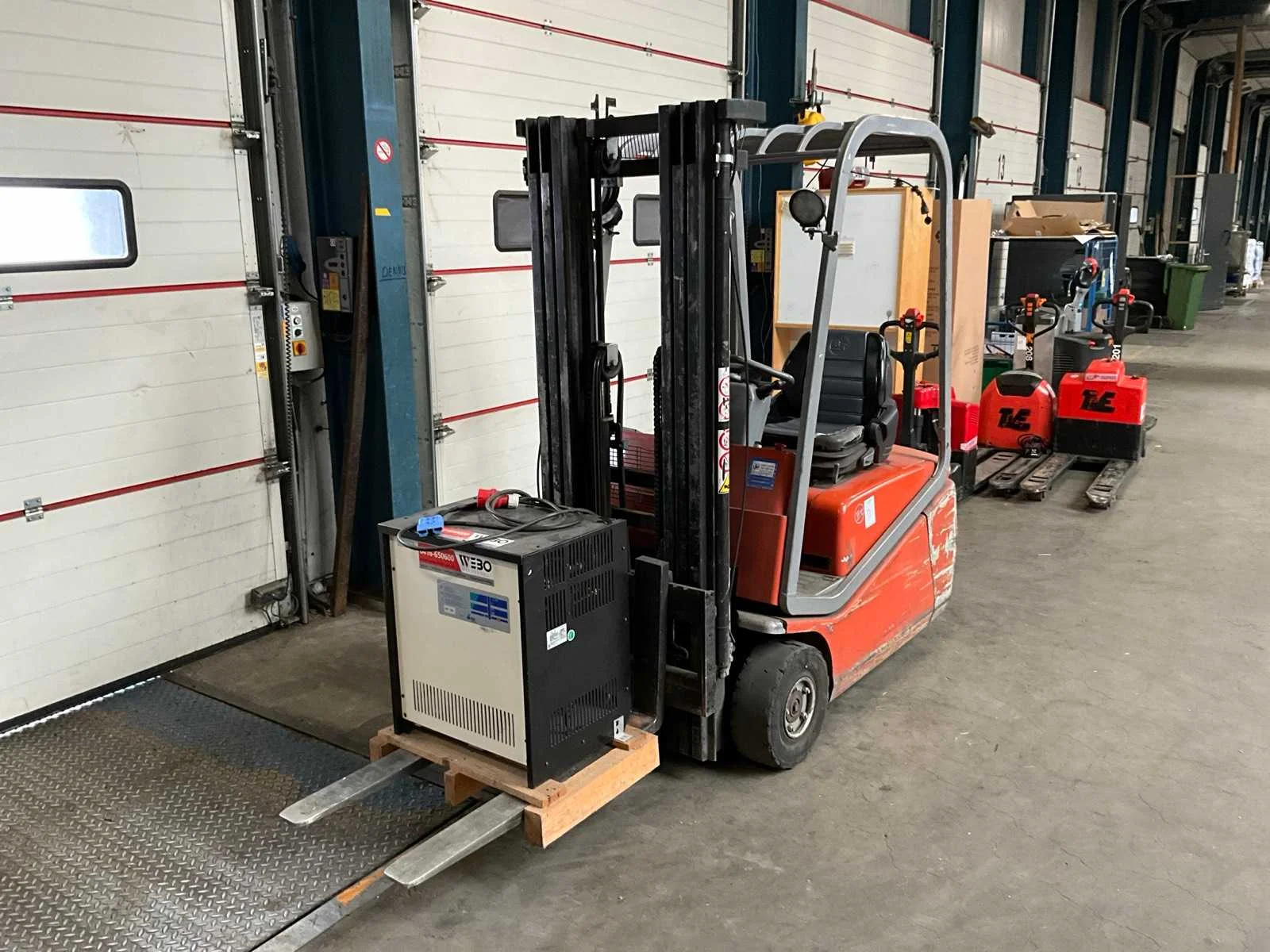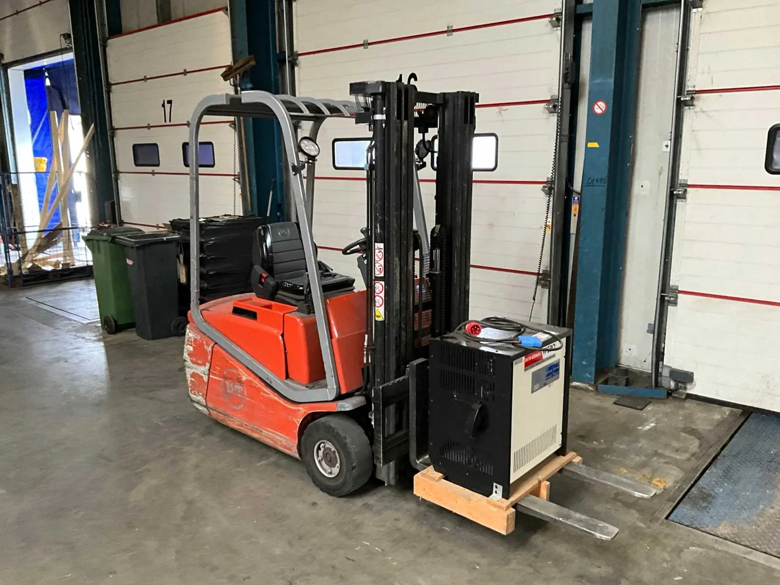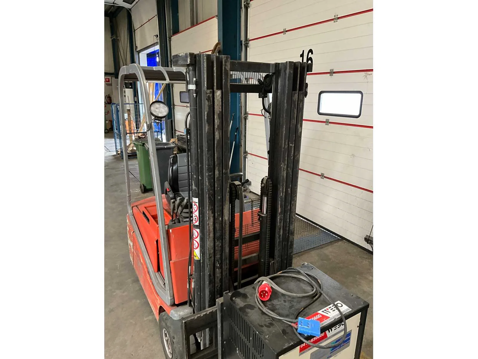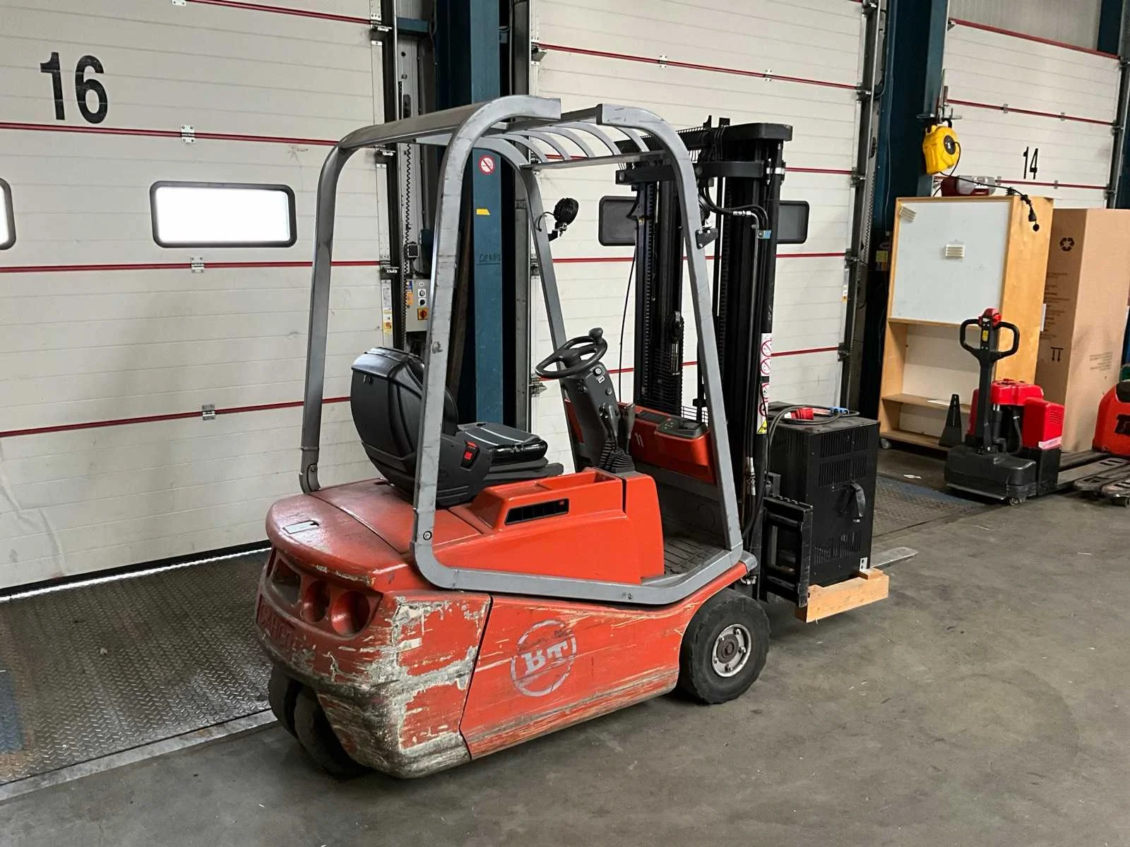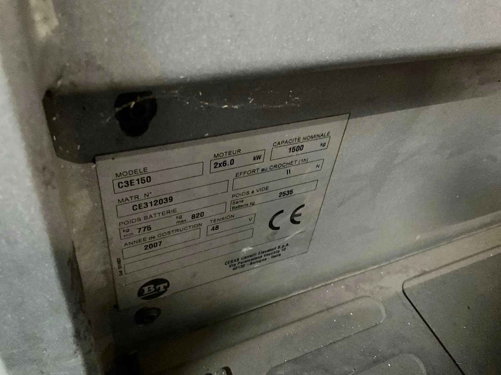 V.v. werkverlichting; Merk: BT Type: C3E150 Bouwjaar: 2007 Brandstof: Elektrisch Mast: Triple Soort band: Volrubber banden Aantal wielen: 3 Accu lader: true Free-lift: true Side-shift: true Triple mast: true Hefvermogen: 1500kg Lepellengte: 1000mm Max. hefhoogte: 4605mm Minimale doorrijhoogte: 2100mm Totale afmeting L: 3100mm Totale afmeting Breedte: 1010mm Totale afmeting Hoogte: 2100mm