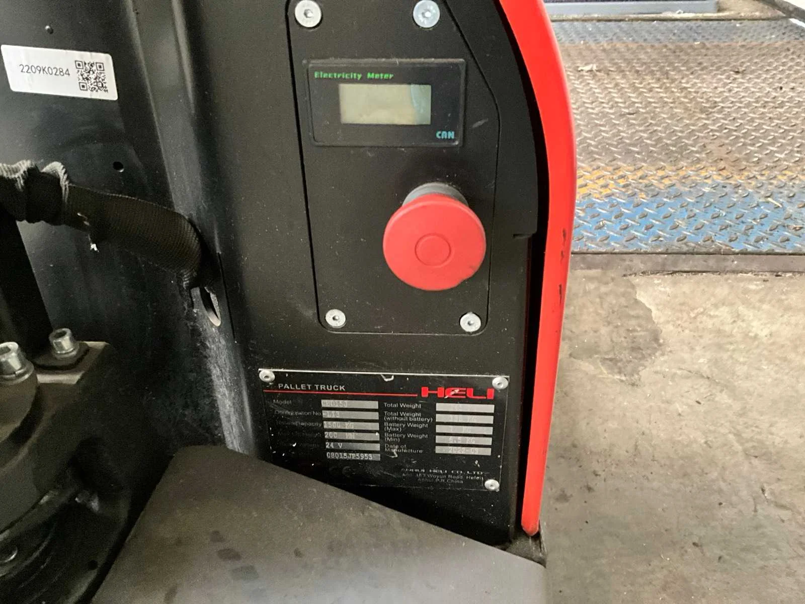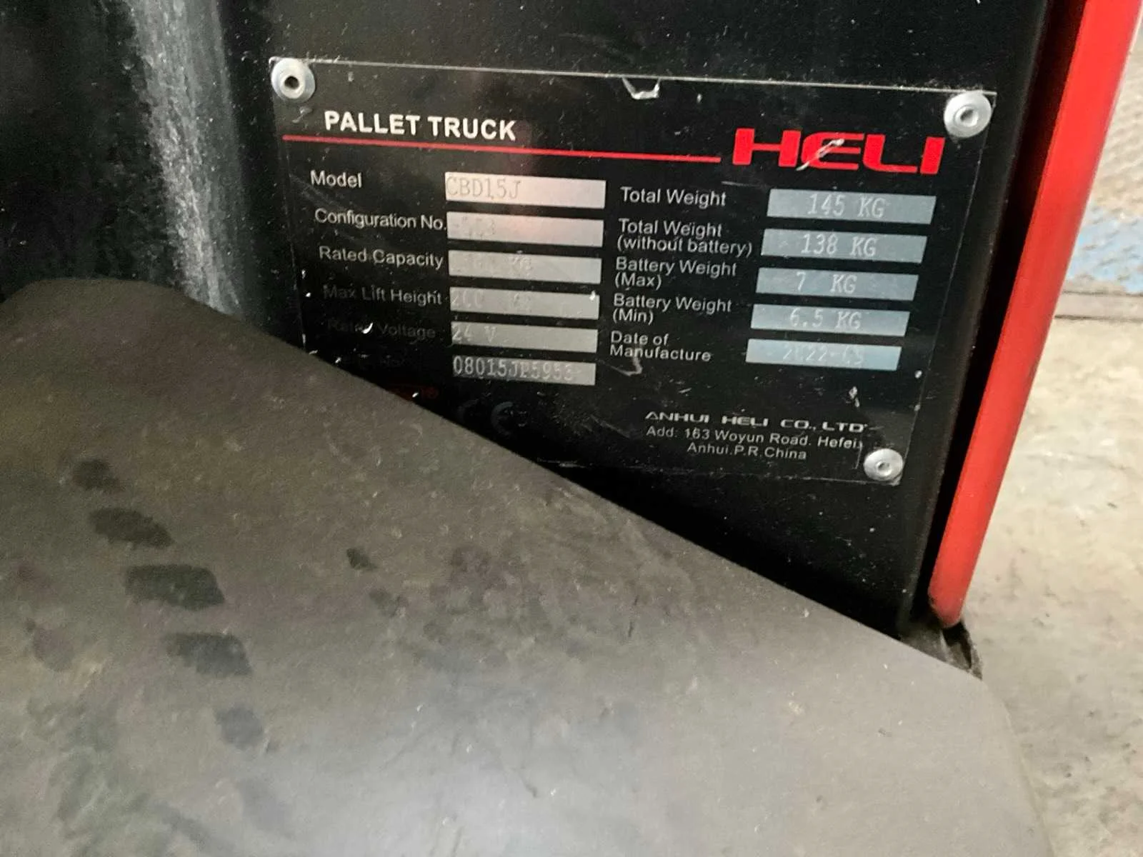 Accu leeg Merk: Heli Type: CBD15J Bouwjaar: 2022 Hefvermogen: 1500kg Lepellengte: 1150mm Accu lader: true Afgelezen urenstand: 68 Eigen gewicht: 145kg Totale afmeting L: 1550mm Totale afmeting Breedte: 550mm Totale afmeting Hoogte: 1250mm
