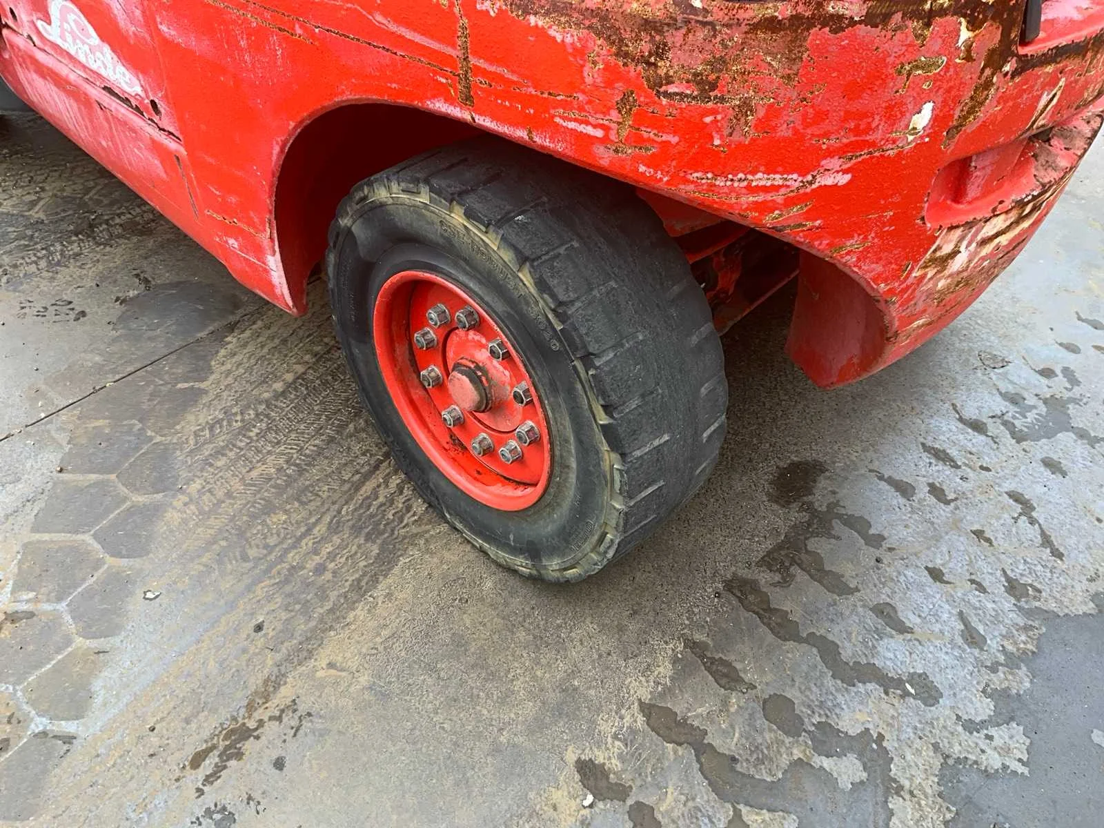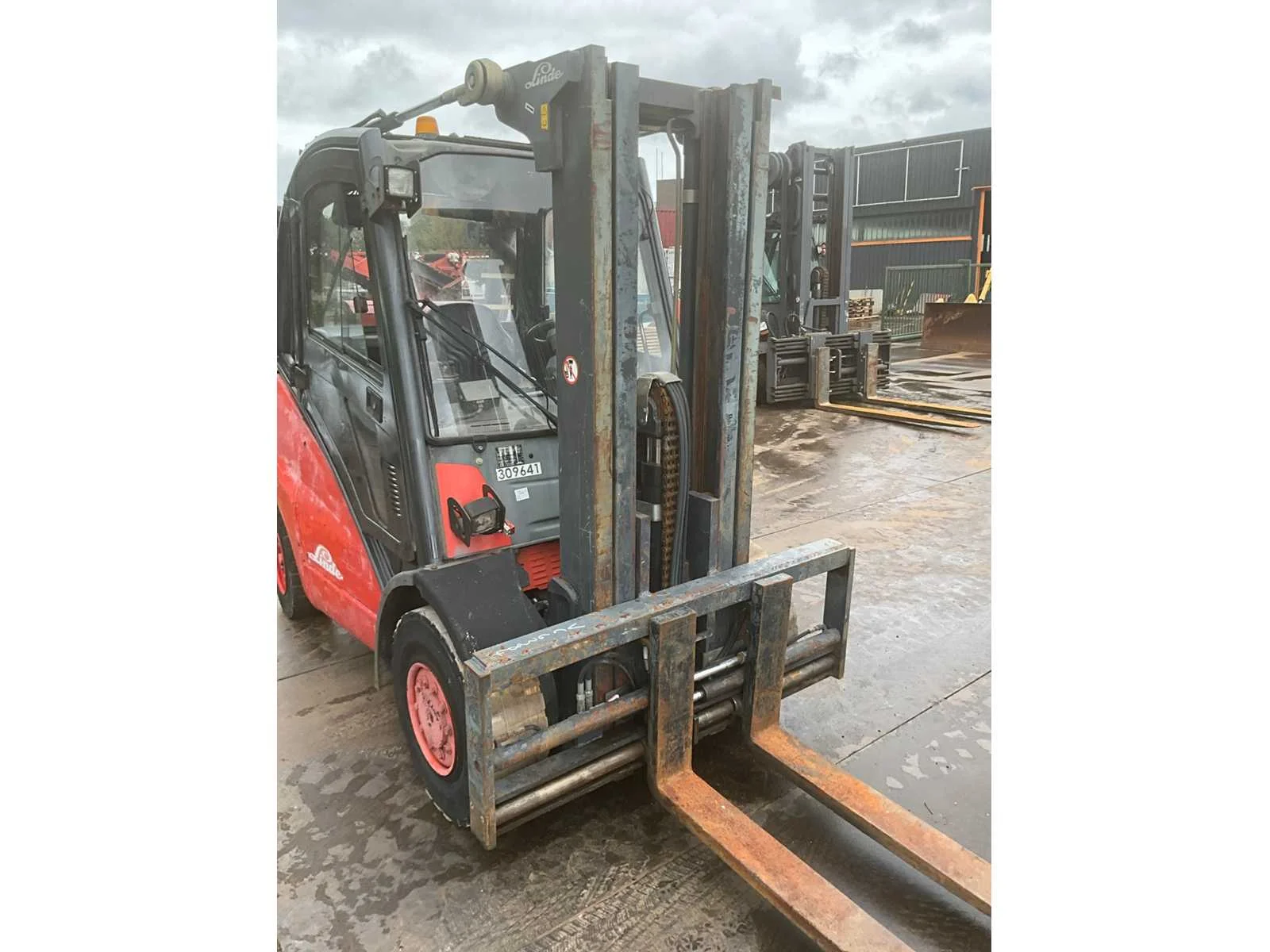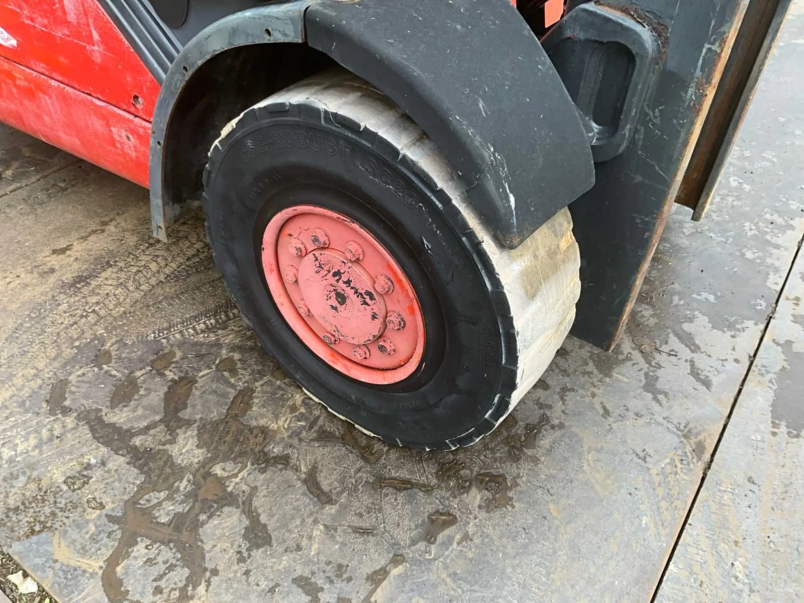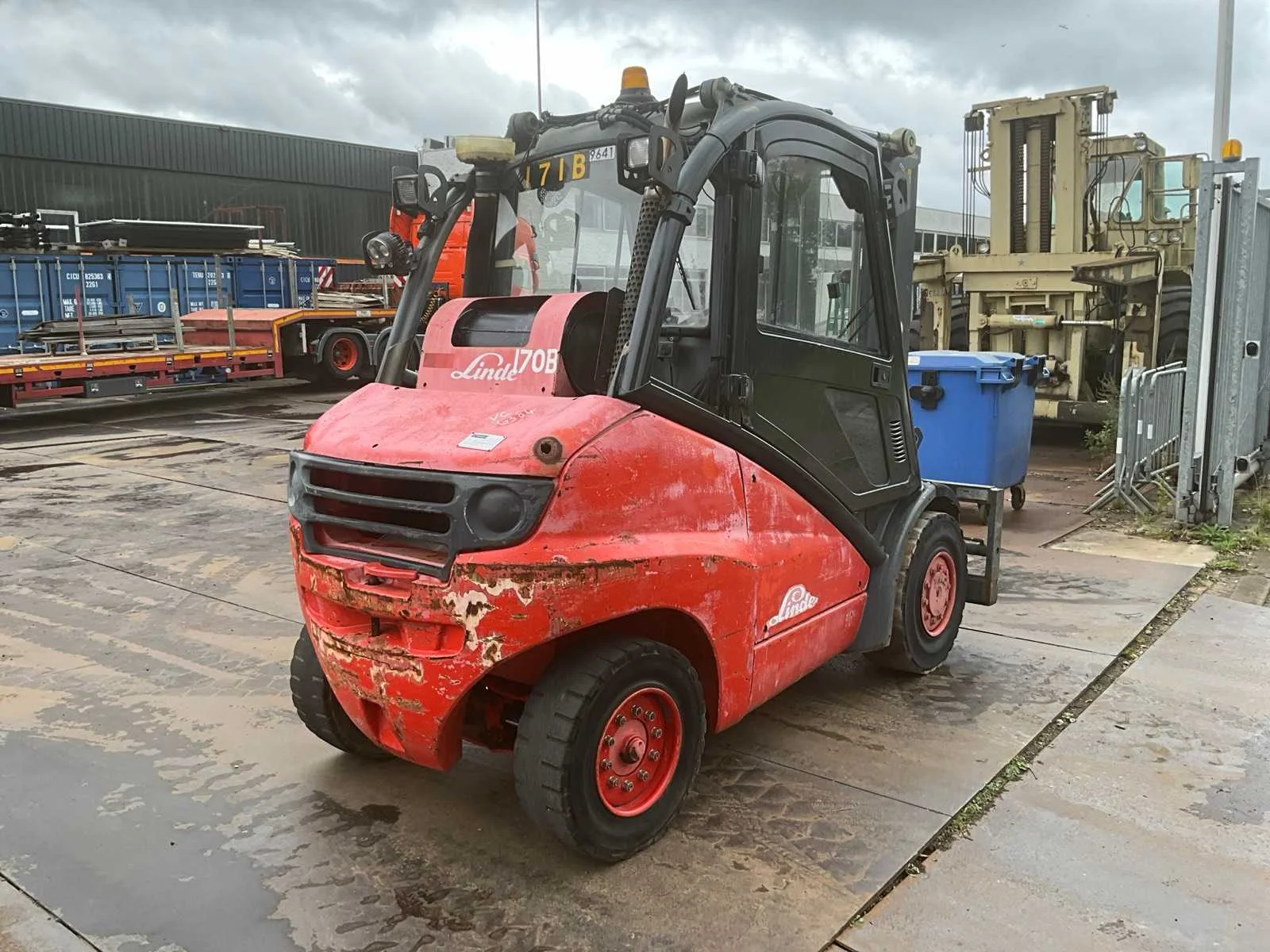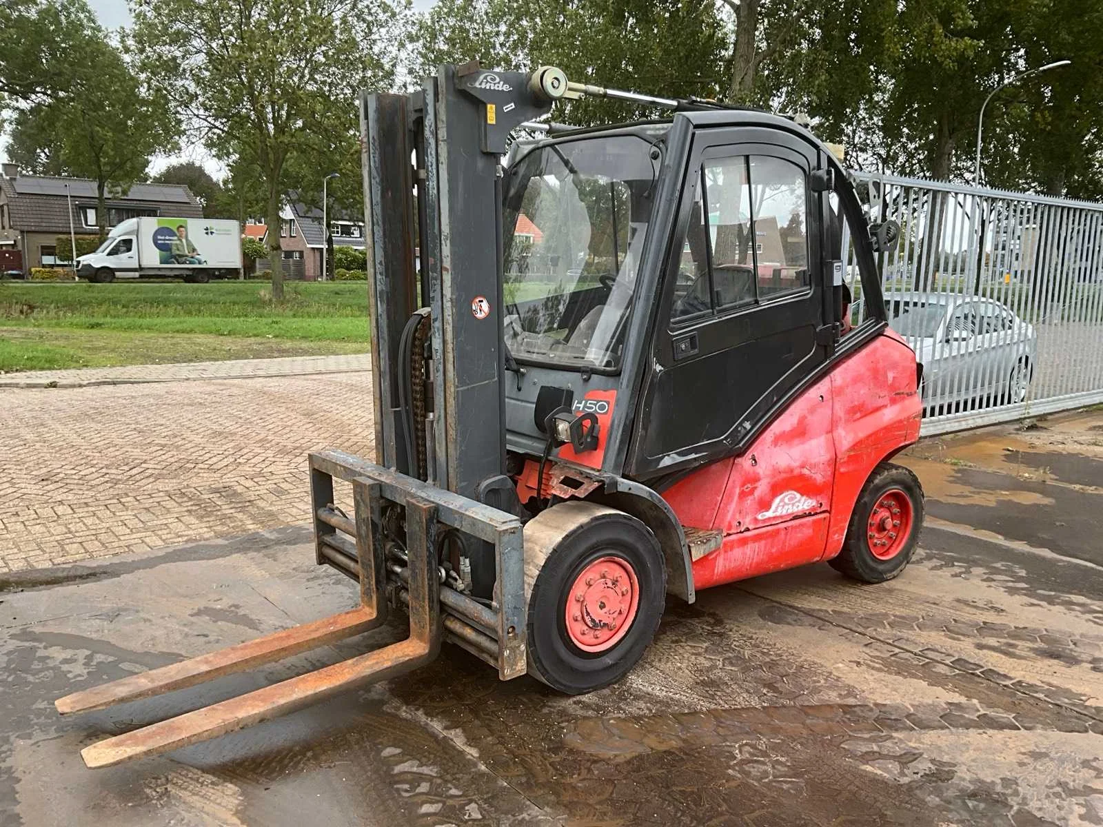 V.v. werkverlichting voor+ achterzijde; gesloten cabine; geeft geen gas; Merk: Linde Type: H50T Brandstof: Elektrisch Mast: Triple Soort band: Volrubber banden Aantal wielen: 4 Afgelezen urenstand: 7555 Free-lift: true Side-shift: true Hydraulisch verstelbare lepels: true Triple mast: true Eigen gewicht: 6680kg Hefvermogen: 5000kg Lepellengte: 1200mm Hefhoogte: 4600mm Vol rubber banden: true Minimale doorrijhoogte: 2400mm Totale afmeting L: 4400mm Totale afmeting Breedte: 1600mm Totale afmeting Hoogte: 2400mm LPG: true