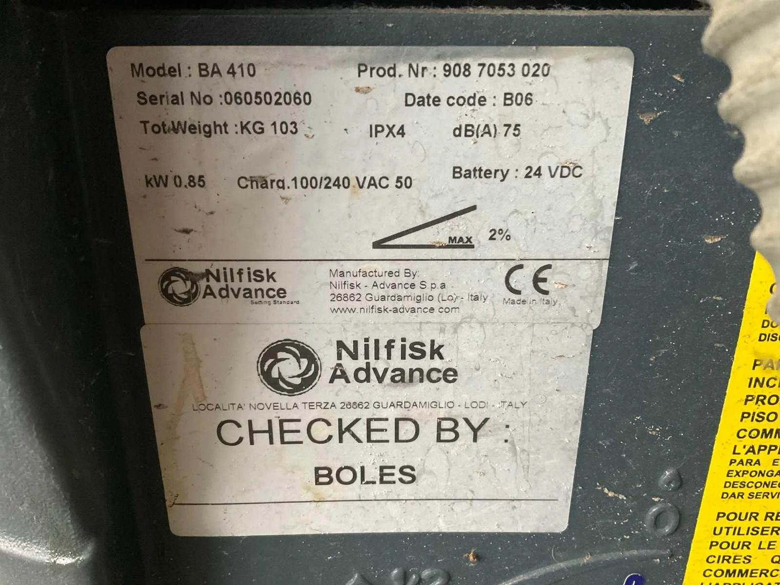Zonder borstel. Merk: Nilfisk Type: BA410 Bouwjaar: 2006 Serienummer: 064223038 Werkbreedte: 400mm Eigen gewicht: 103kg Totale afmeting L: 1000mm Totale afmeting Breedte: 600mm Totale afmeting Hoogte: 1000mm