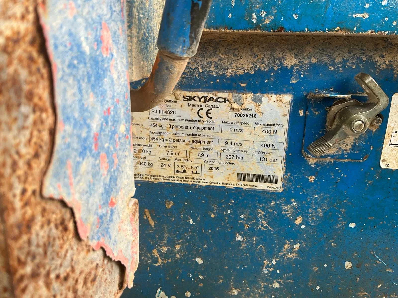 Accu leeg, niet getest Merk: Skyjack Type: SJ III 4626 Bouwjaar: 2015 Elektrisch: true Schaarhoogwerker: true Werkhoogte: 9900mm Plateau afm. l: 2150mm Plateau afm. b: 1100mm Platform capaciteit: 454kg Eigen gewicht: 2170kg Totale afmeting L: 2250mm Totale afmeting Breedte: 1160mm Totale afmeting Hoogte: 2330mm