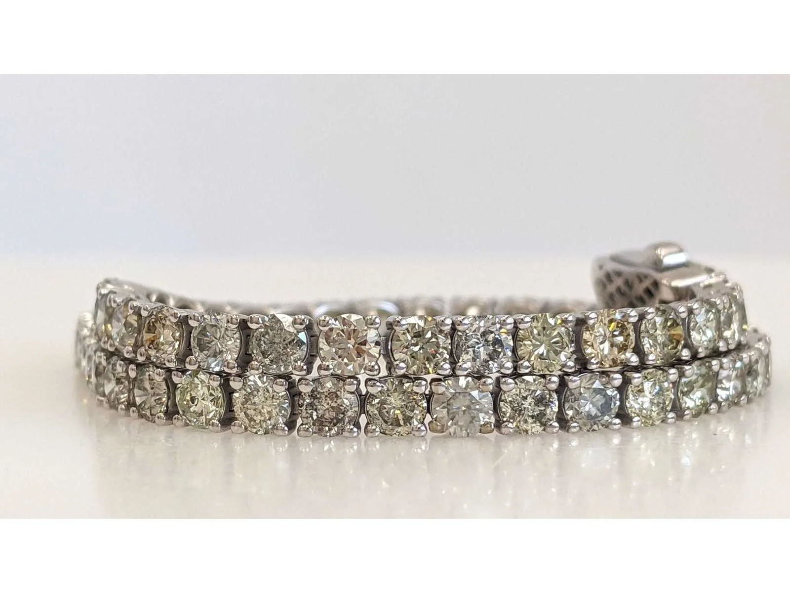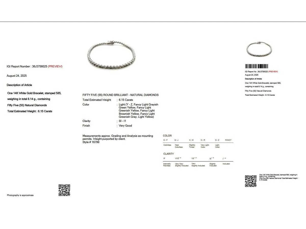 Natural Diamonds Geslepen: Rond Brilliant Carat: 6,15 cttw / 55 stenen Kleur: Natuurlijk gekleurd Helderheid: SI - I1 Grootte: 18 cm Bezichtiging op afspraak Materiaal: Witgoud Maten: 18 cm. Certificaat: Ja Lage schatting: 8100€