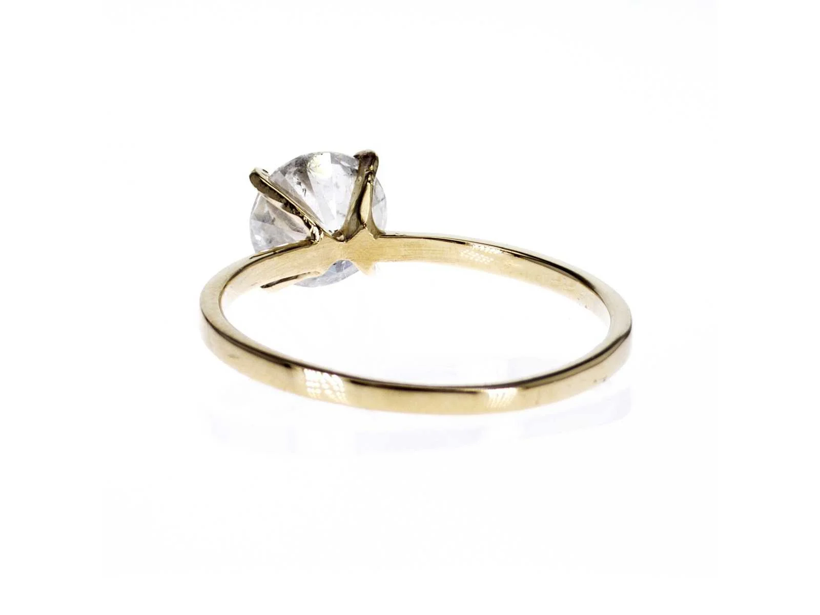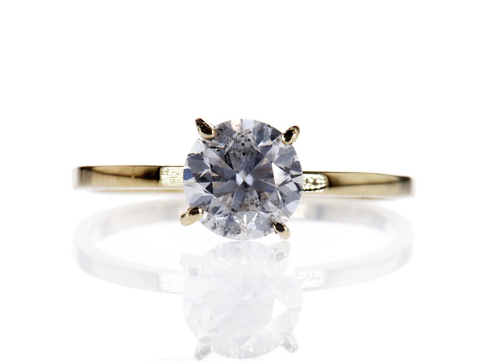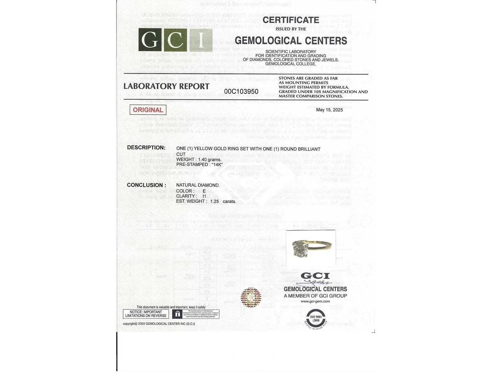 Type steen: natuurlijke diamant Vorm en snijstijl: Rond Brilliant Karaatgewicht: 1,25 ct Kleurgradatie E Helderheidsgraad I1 Metaal: Geel goud, 14 karaat / 585 Sieraadgewicht 1,40 g. Bezichtigen op afspraak Materiaal: Geelgoud Ringmaat : 53 Certificaat: Ja Lage schatting: 7500€