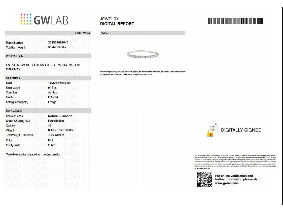 Natuurlijke diamanten Geslepen: Rond Brilliant Carat: 7,66cttw / 48 stenen Kleur: E-H Helderheid: SI1-I2 Totaalgewicht: 10,7 gram Lengte - 7 Inch / 18 cm Bezichtiging op afspraak Materiaal: Witgoud Certificaat: Ja Lage schatting: 14900€