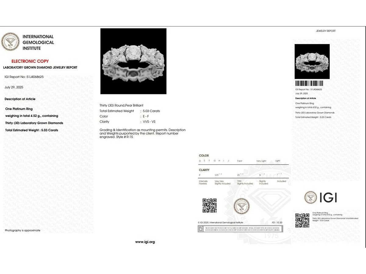 Platina 950 Eeuwigheidsring Carat- 5.03 Carat Ronde - 3,09 karaat Parel - 1,94 karaat Kleur - E, F Clarity - VVS-VS Gewicht - 4,52 g Aantal diamanten - 30 IGI NO.- 51J4068325 Ringmaat - 53 EU / 13 IT / 6.25 US Bezichtiging op afspraak Materiaal: Platina Ringmaat : 53 Certificaat: Ja Lage schatting: 3800€