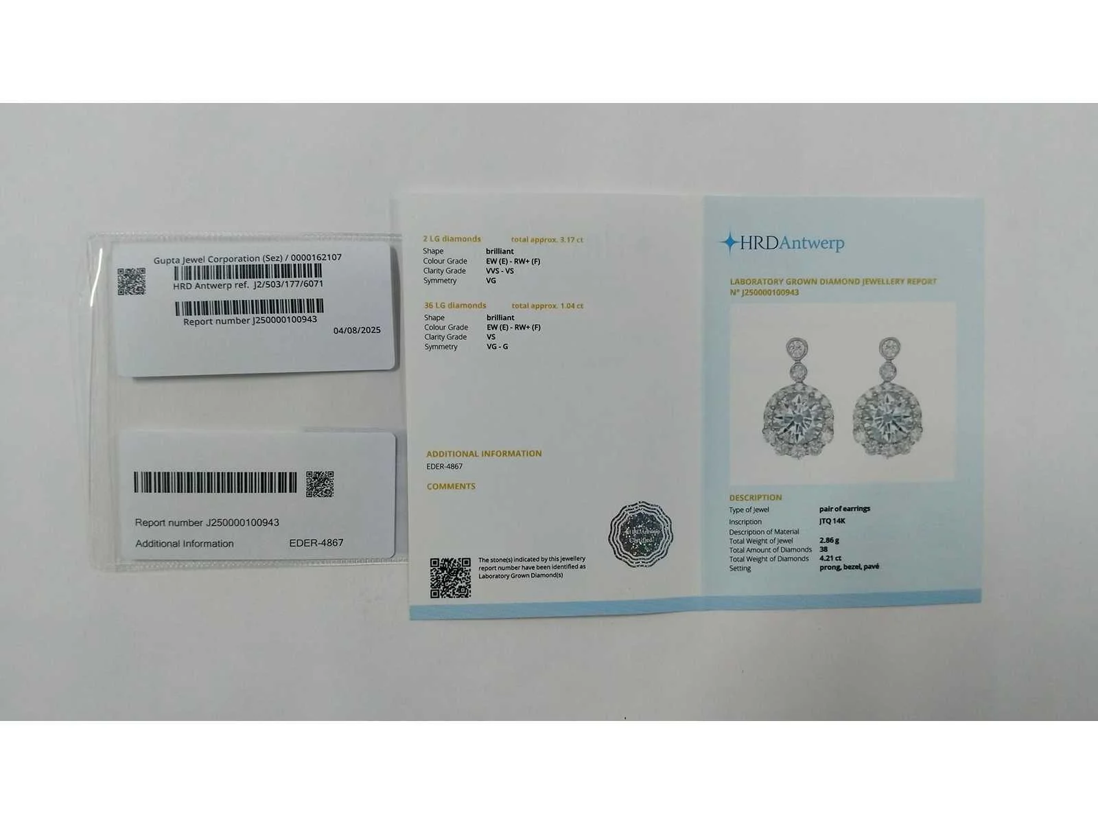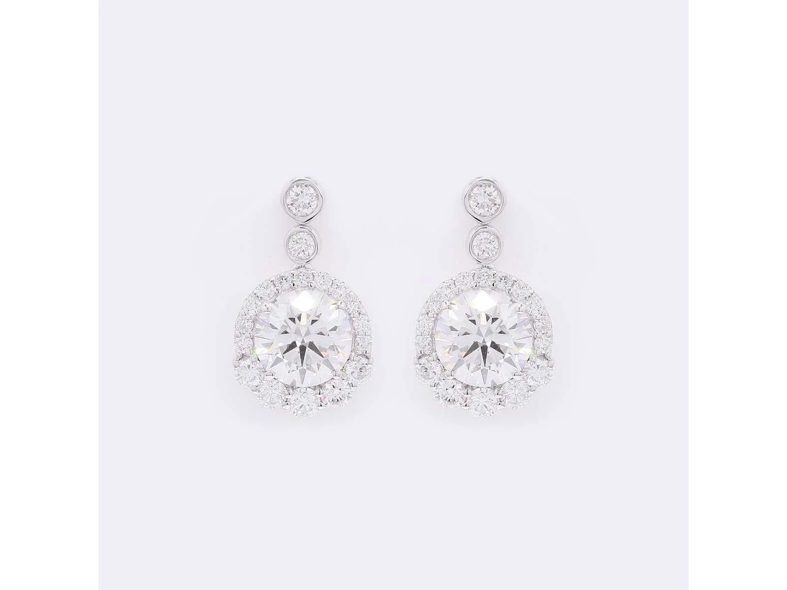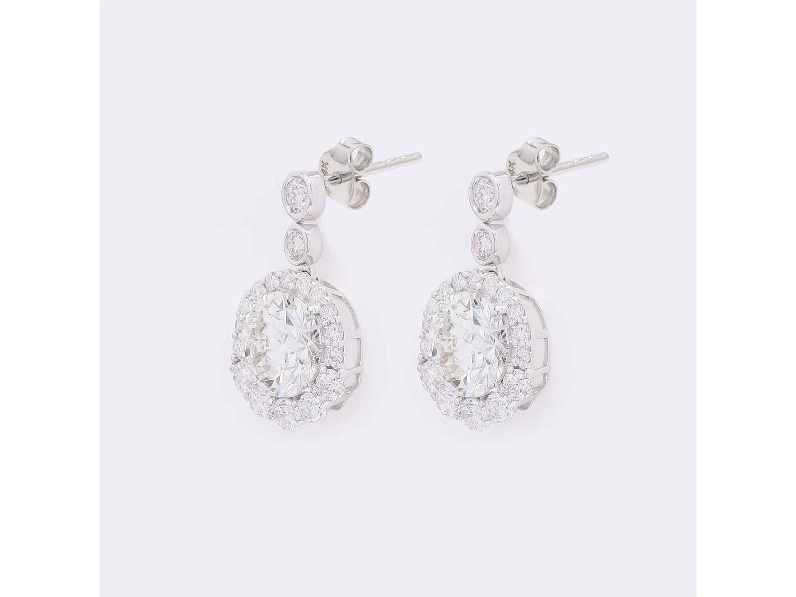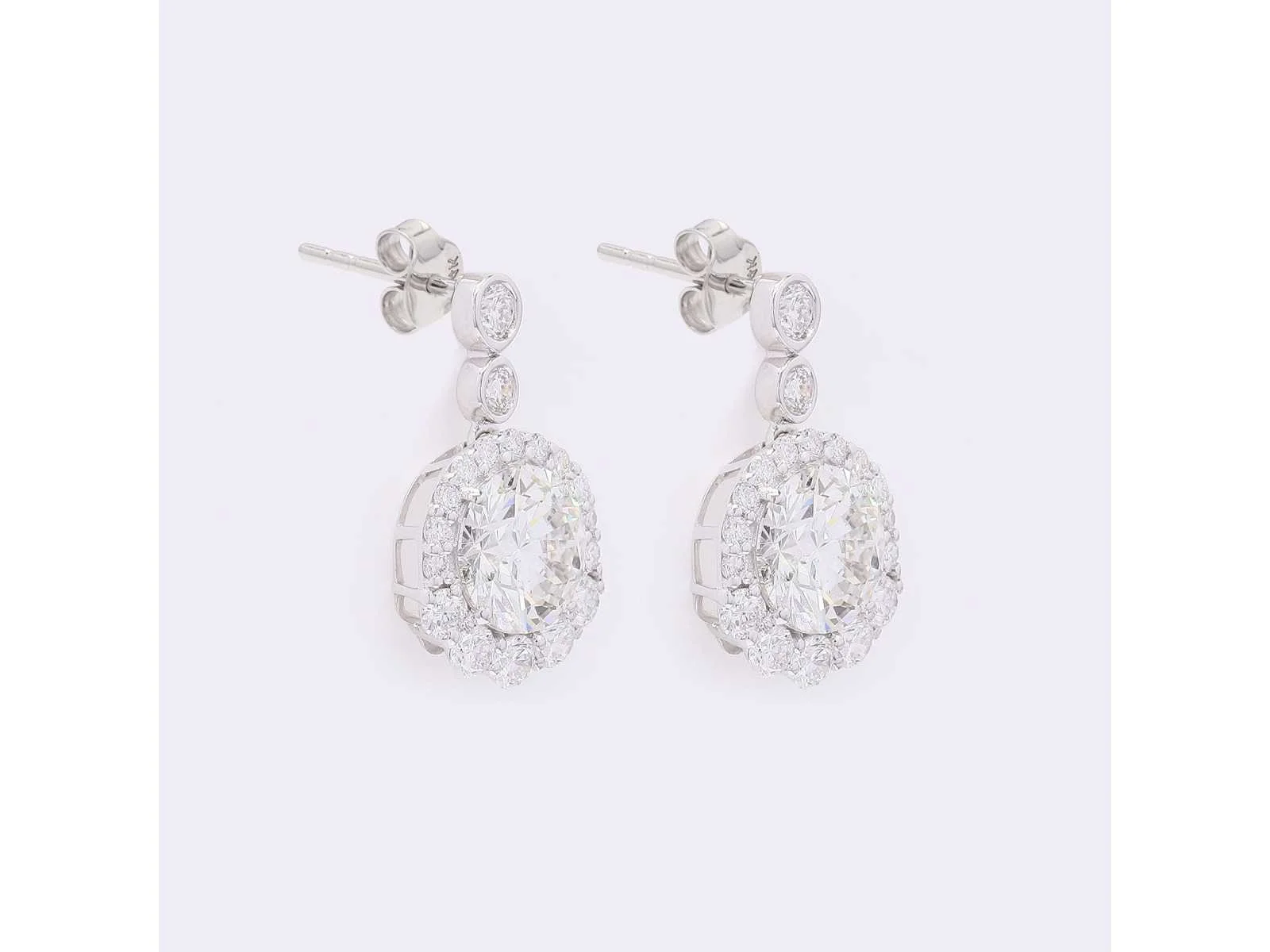 14K witgouden oorbellen Totaal gewicht diamanten: 4,21. Totaal productgewicht: 2,86 Productafmetingen: 0,15x0,74x0,43 inch Hoofddiamanten - Aantal stuks: 2 - Vorm: Rond briljant geslepen - Certificaatnummer: J250000100943 Lab: HRD Antwerpen - Helderheid: VVS-VS Kleur: E-F Omringende diamanten: - Karaatgewicht: 1,04 - Aantal stuks: 36 Bezichtiging op afspraak Materiaal: Witgoud Certificaat: Ja Lage schatting: 5100€