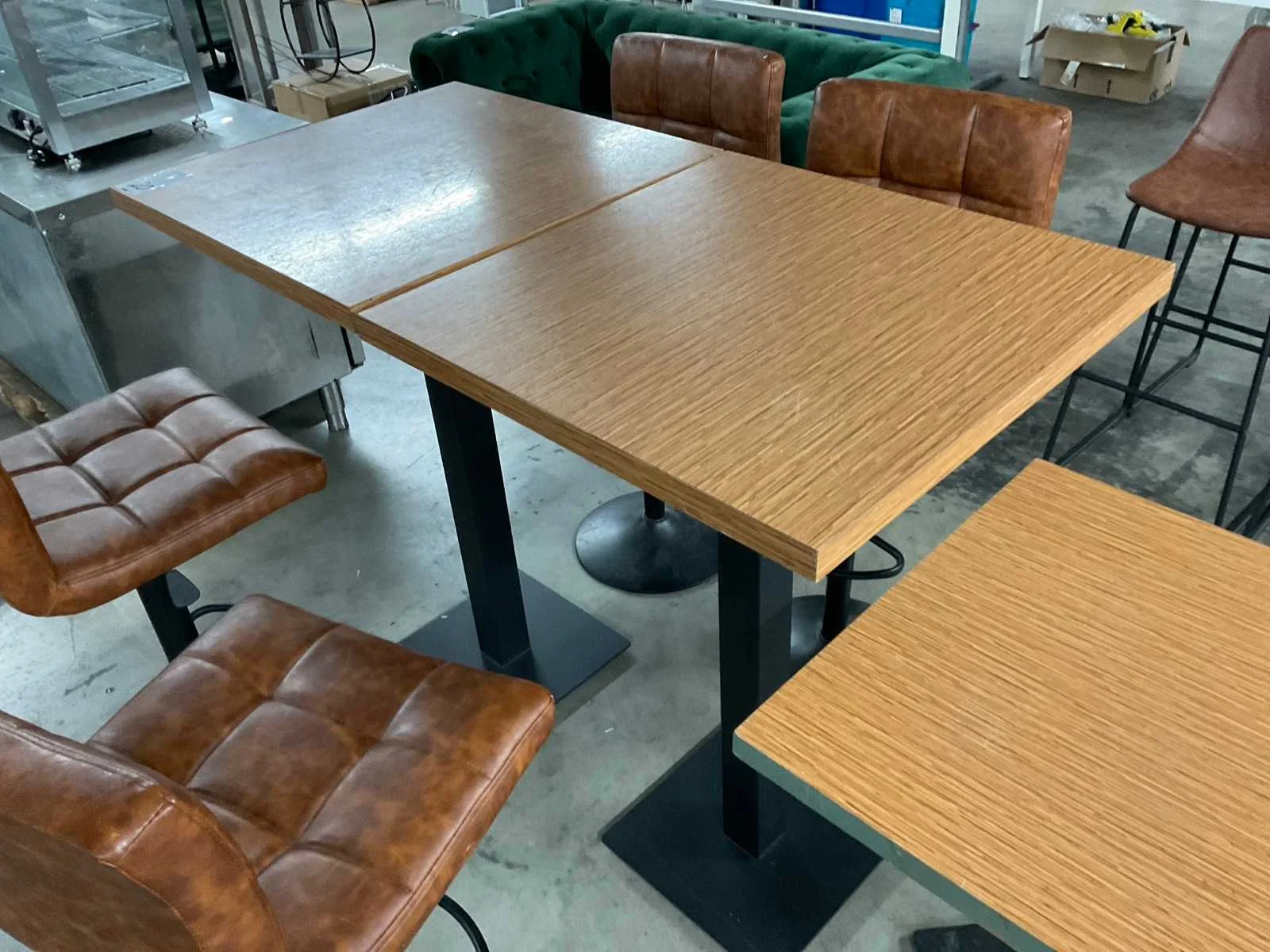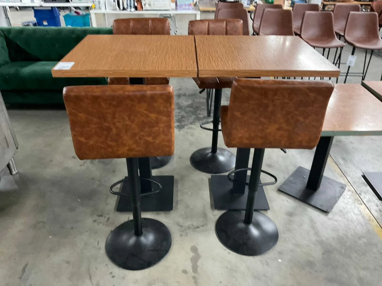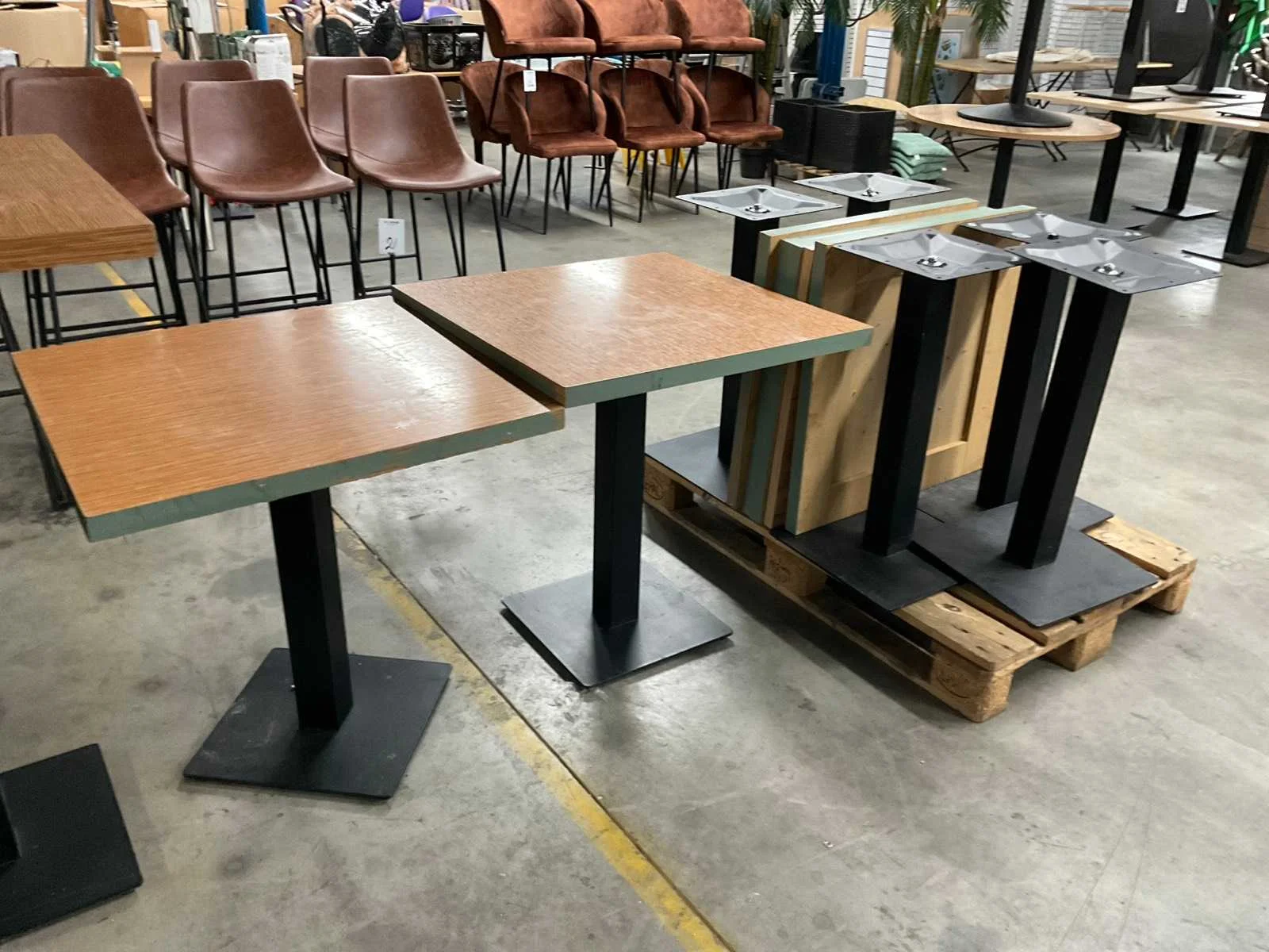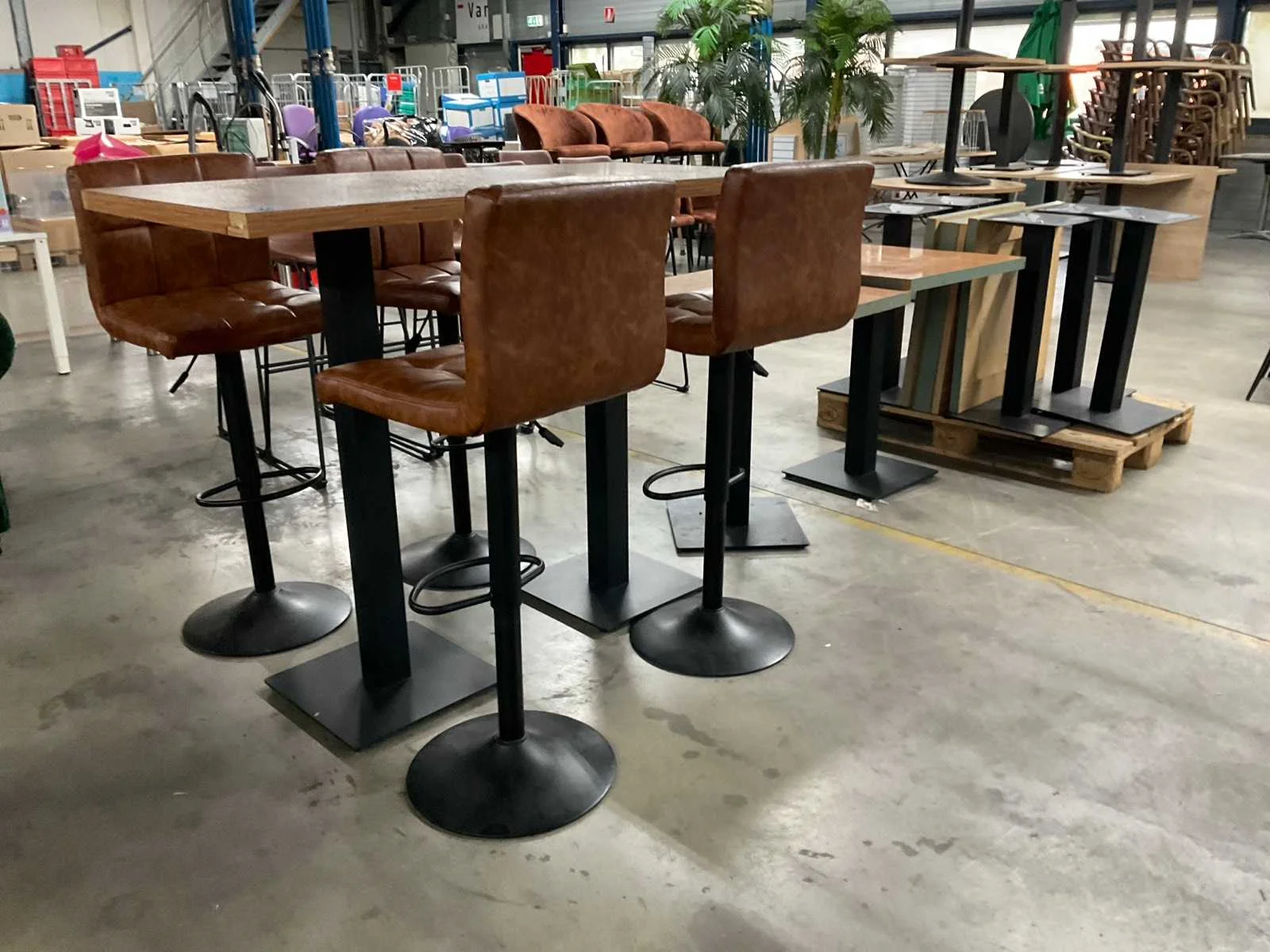 Bestaande uit: (4x) barkrukken, Lederlook, (2x) bartafels 70x70x110cm, (7x) tafels 70x70x76cm, deel gedemonteerd.