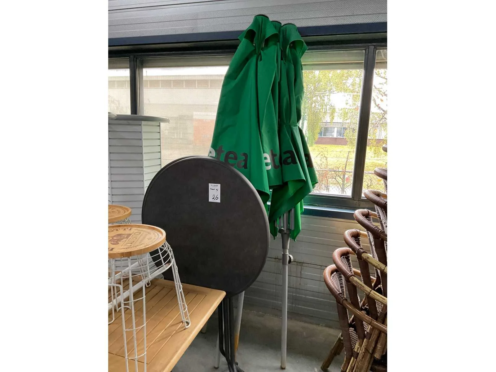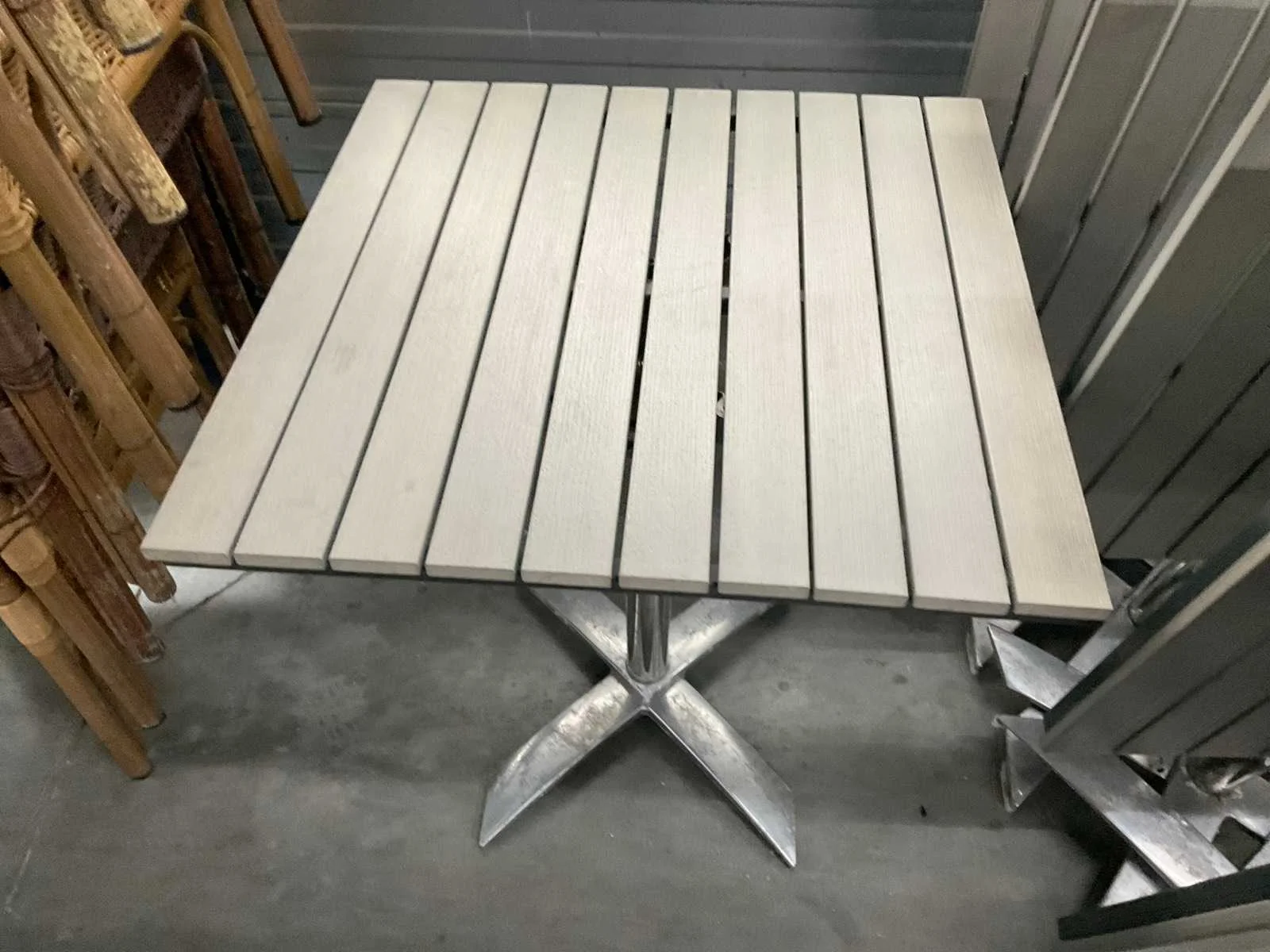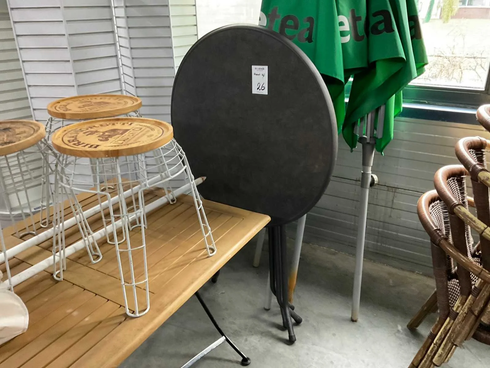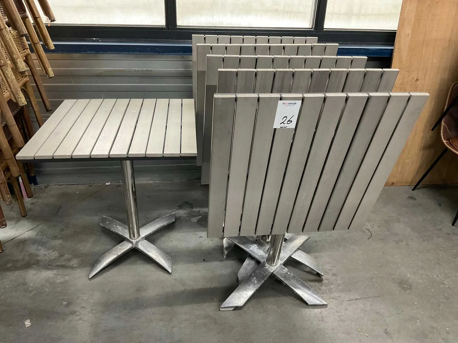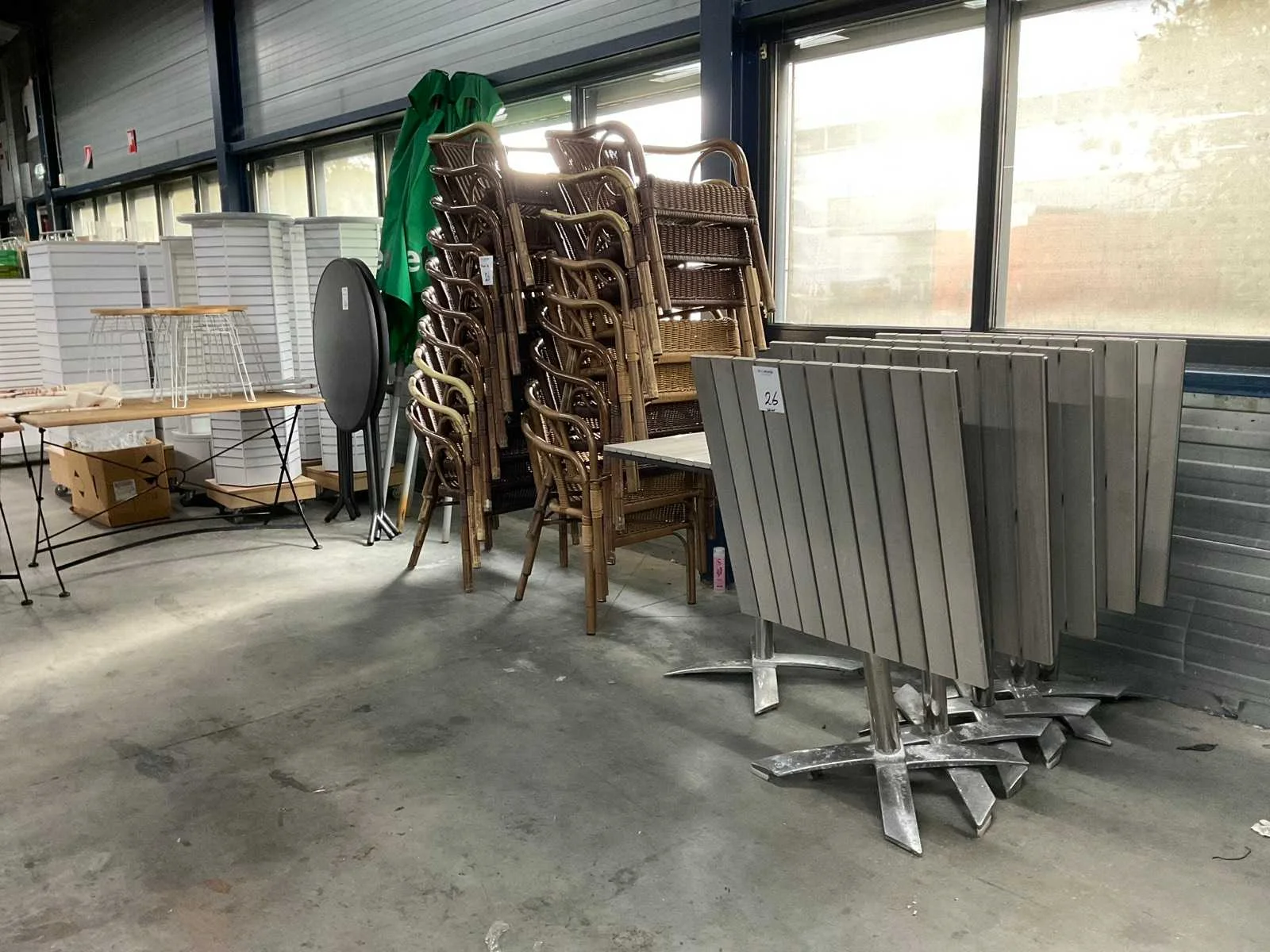 1e: (6x) klaptafels 70x70 2e: (2x) klaptafels 120x80 3e: (6x) parasols 4e: (3x) bijzettafels 5e: (2x) kunstplanten 6e: Kussens 7e: (19x) terasstoelen 8e: (2x) statafels