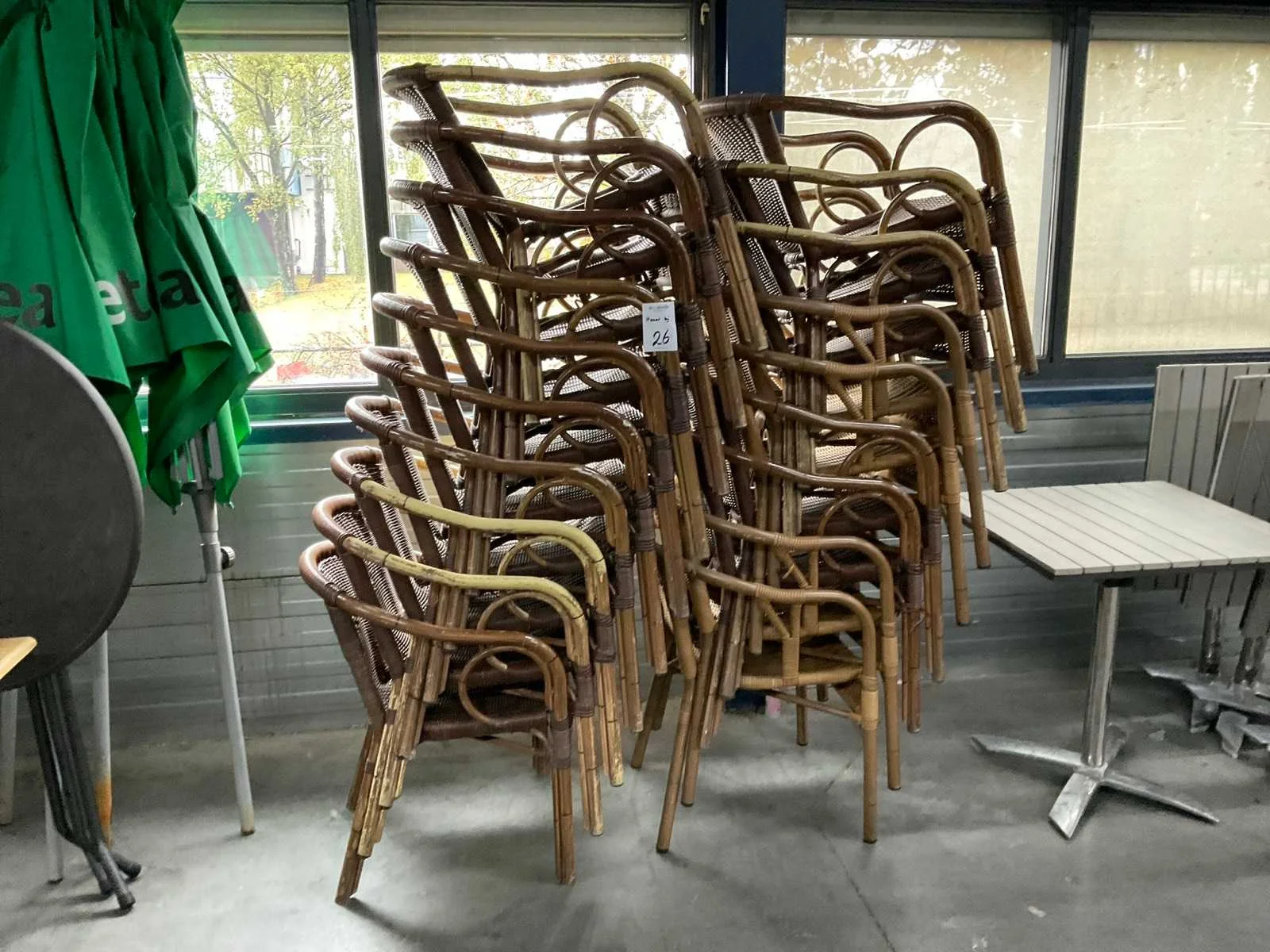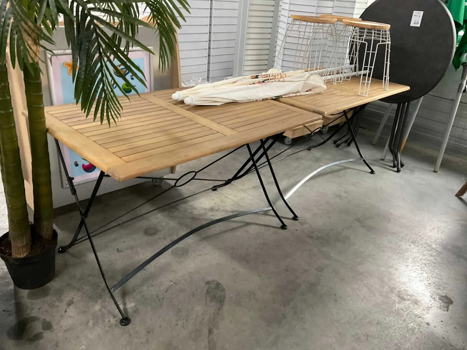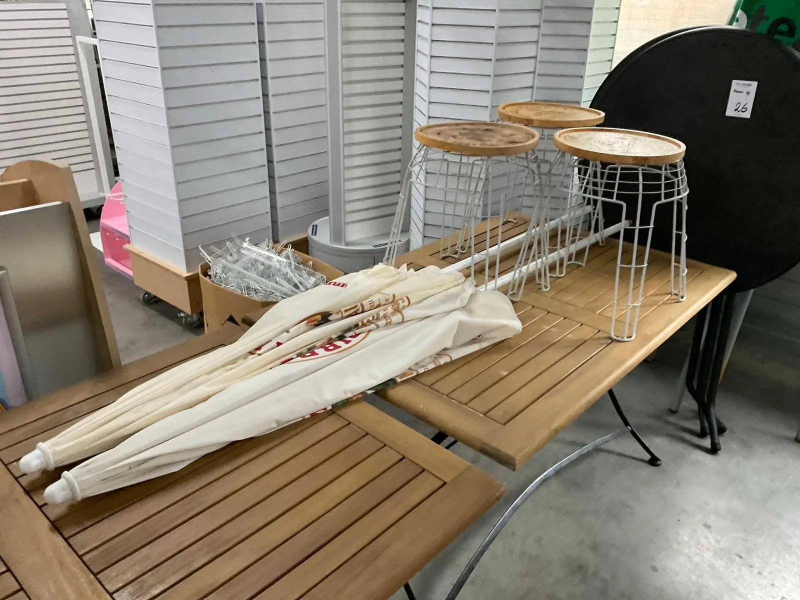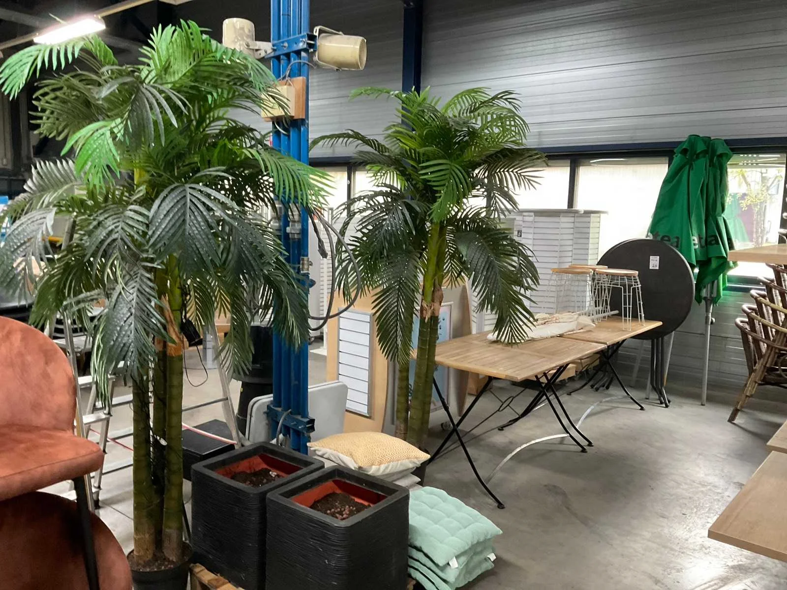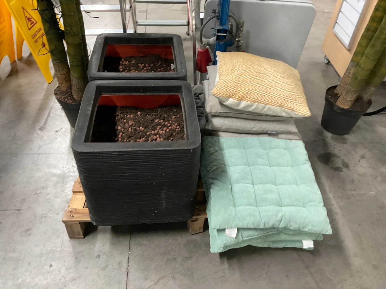 1e: (6x) klaptafels 70x70 2e: (2x) klaptafels 120x80 3e: (6x) parasols 4e: (3x) bijzettafels 5e: (2x) kunstplanten 6e: Kussens 7e: (19x) terasstoelen 8e: (2x) statafels