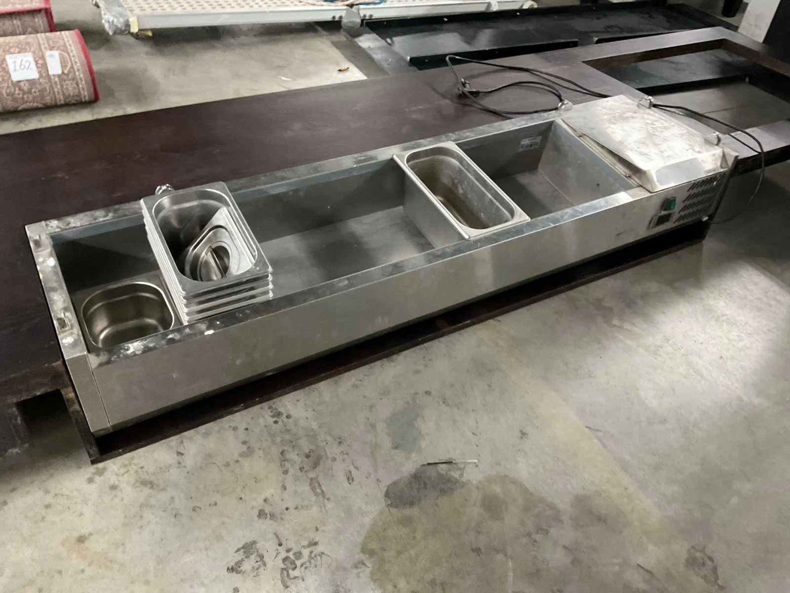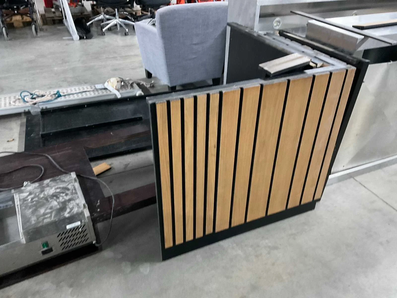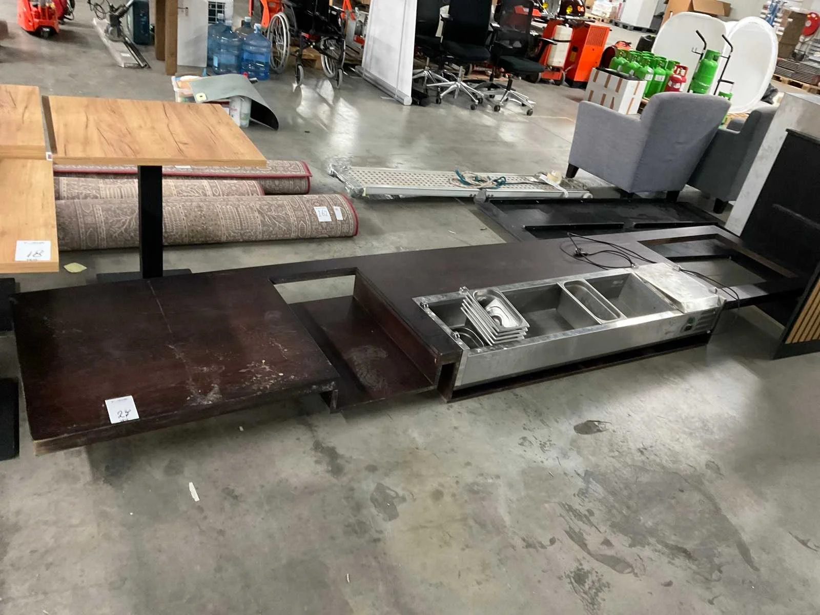 Inclusief: saladette 160cm, meubel is gedemonteerd, compleetheid is onbekend. Totale afmeting L: 4000mm Totale afmeting Breedte: 800mm Hout: true