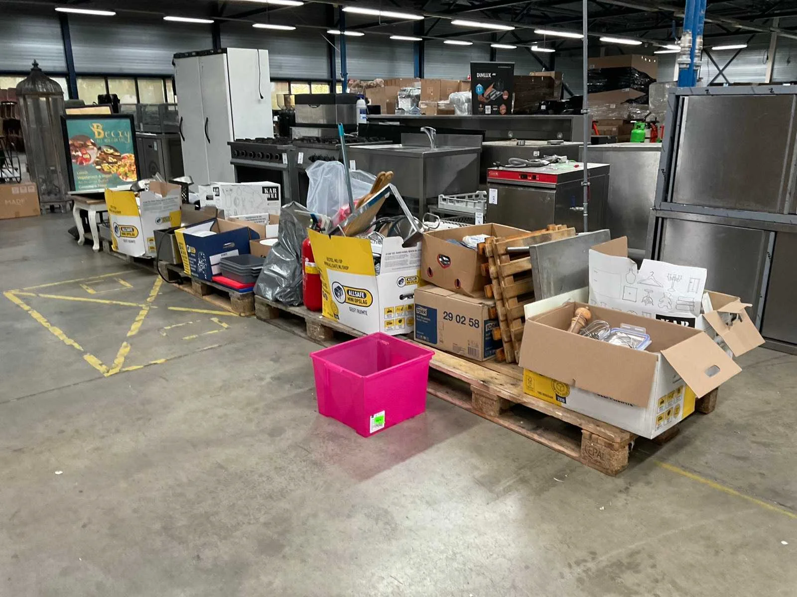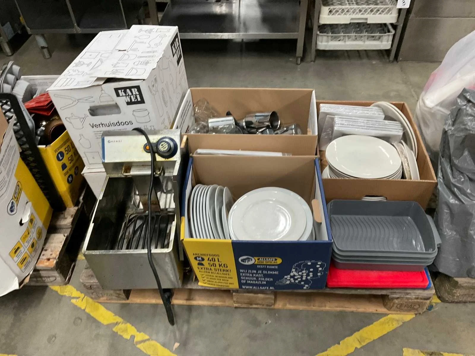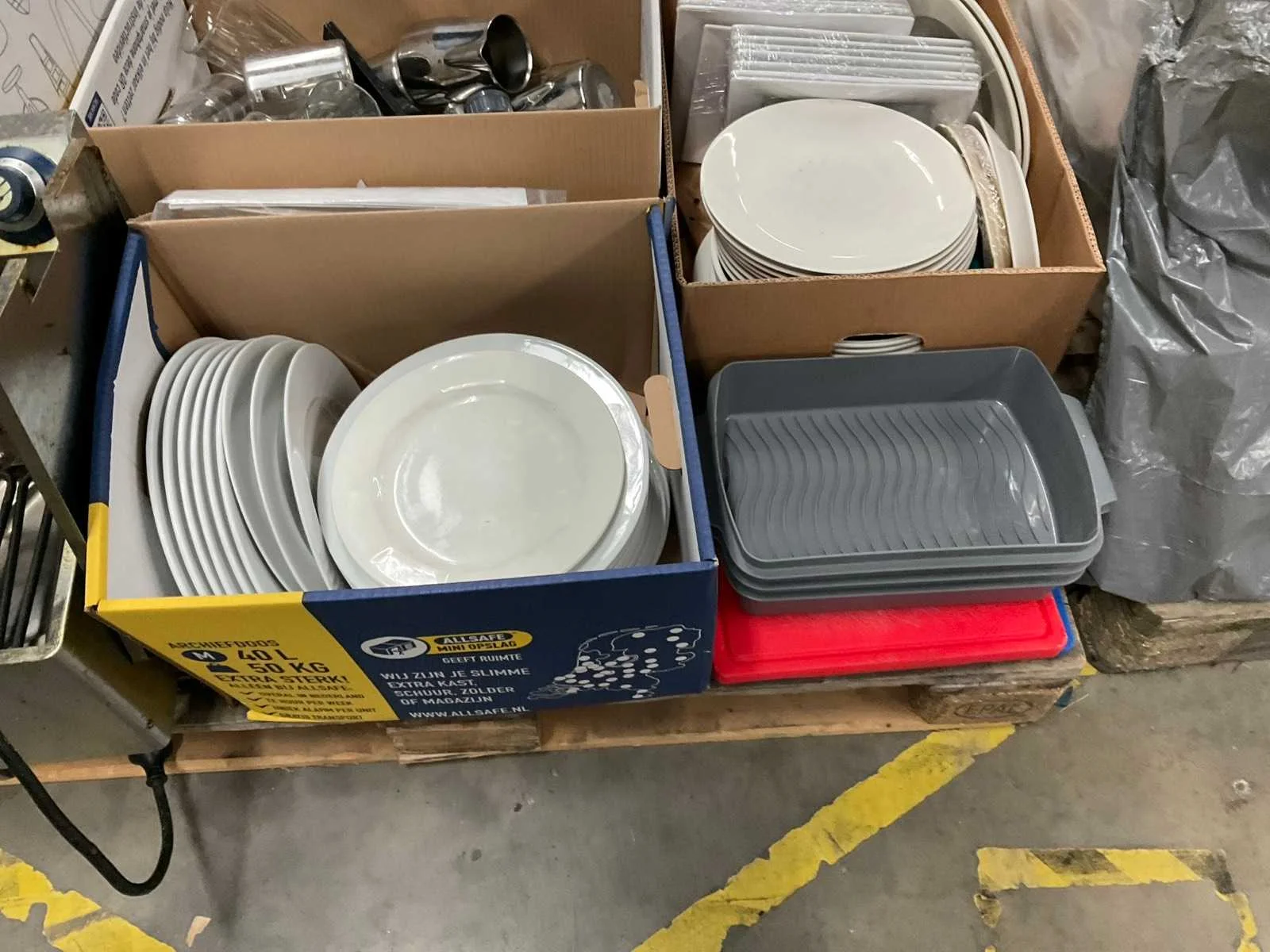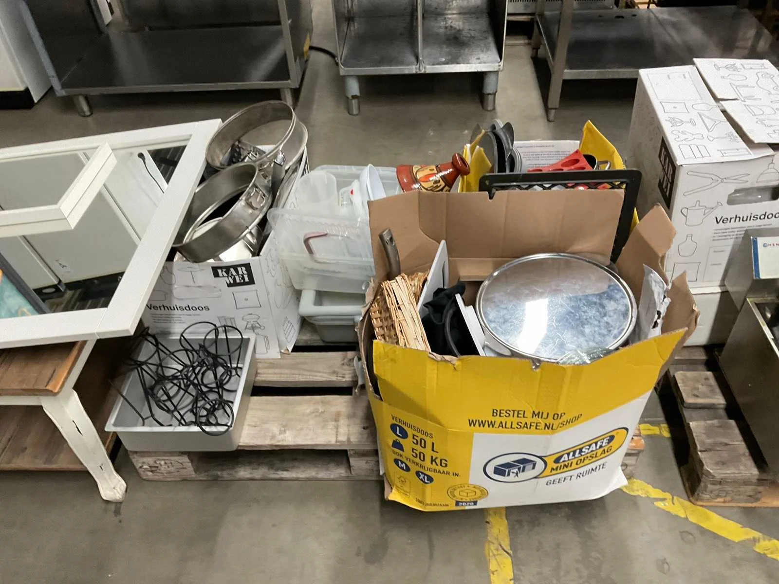 Op 4 pallets 1e: Spiegels 2e: Glazen 3e: Borden 4e: Schoonmaakartikelen 5e: Stoepbord 6e: Bakvormen