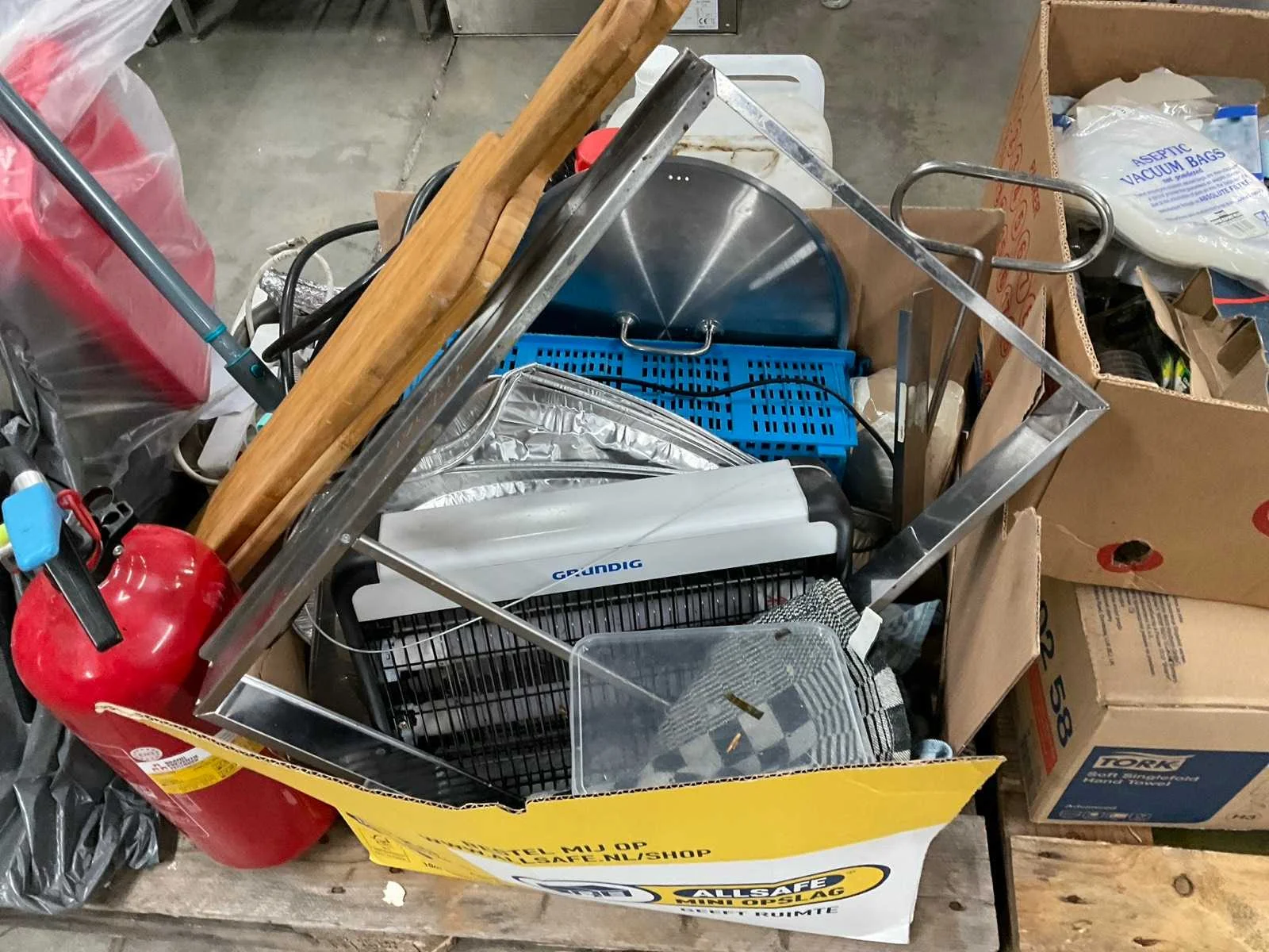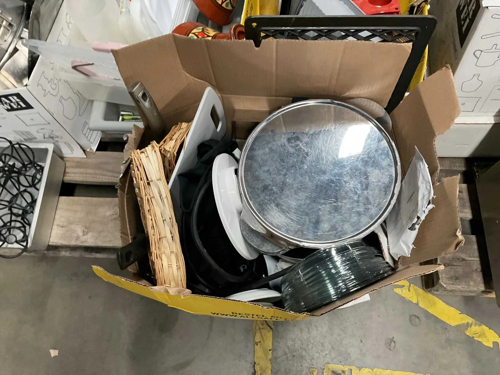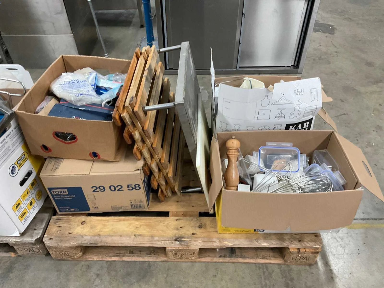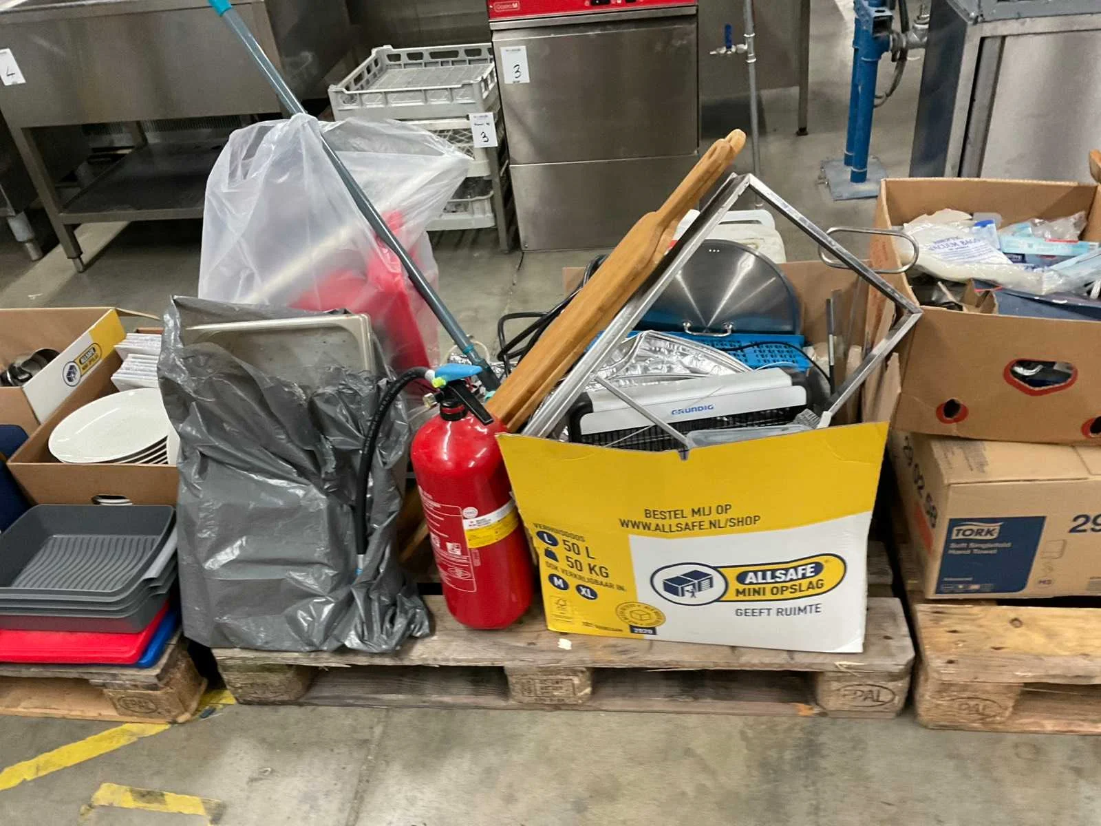 Op 4 pallets 1e: Spiegels 2e: Glazen 3e: Borden 4e: Schoonmaakartikelen 5e: Stoepbord 6e: Bakvormen