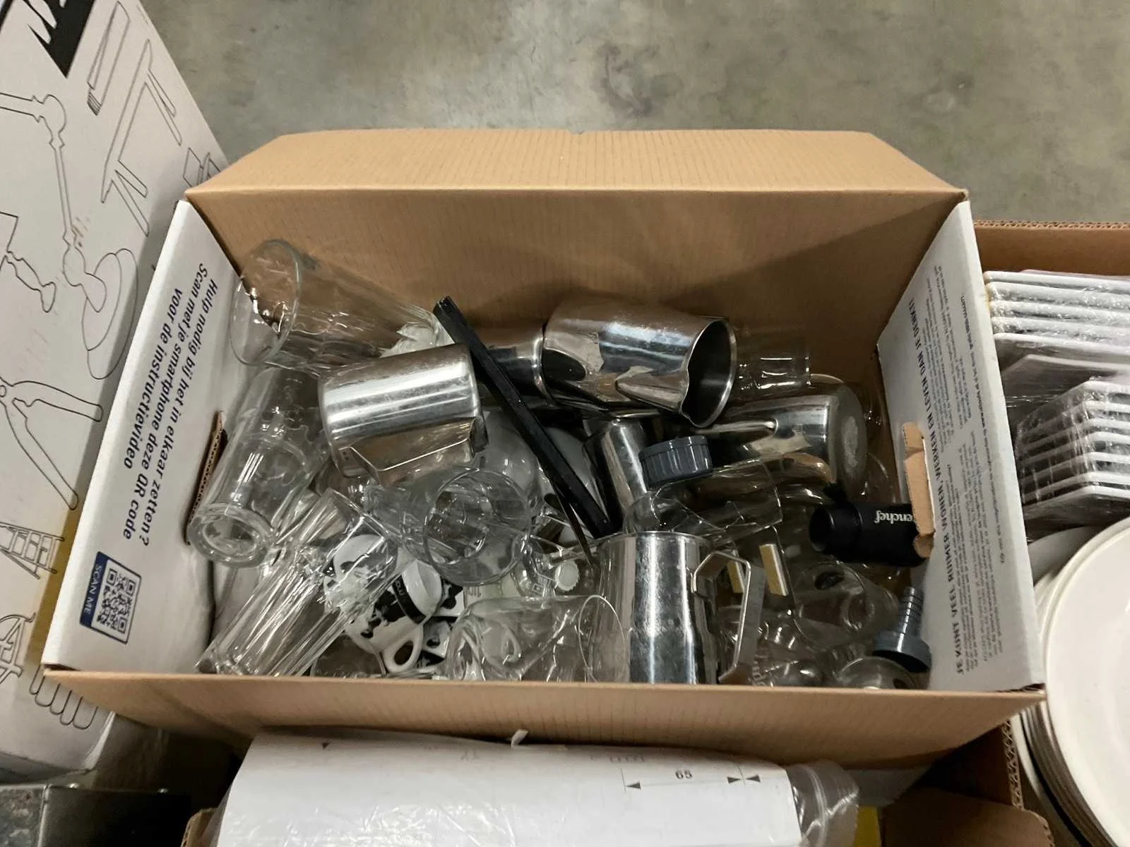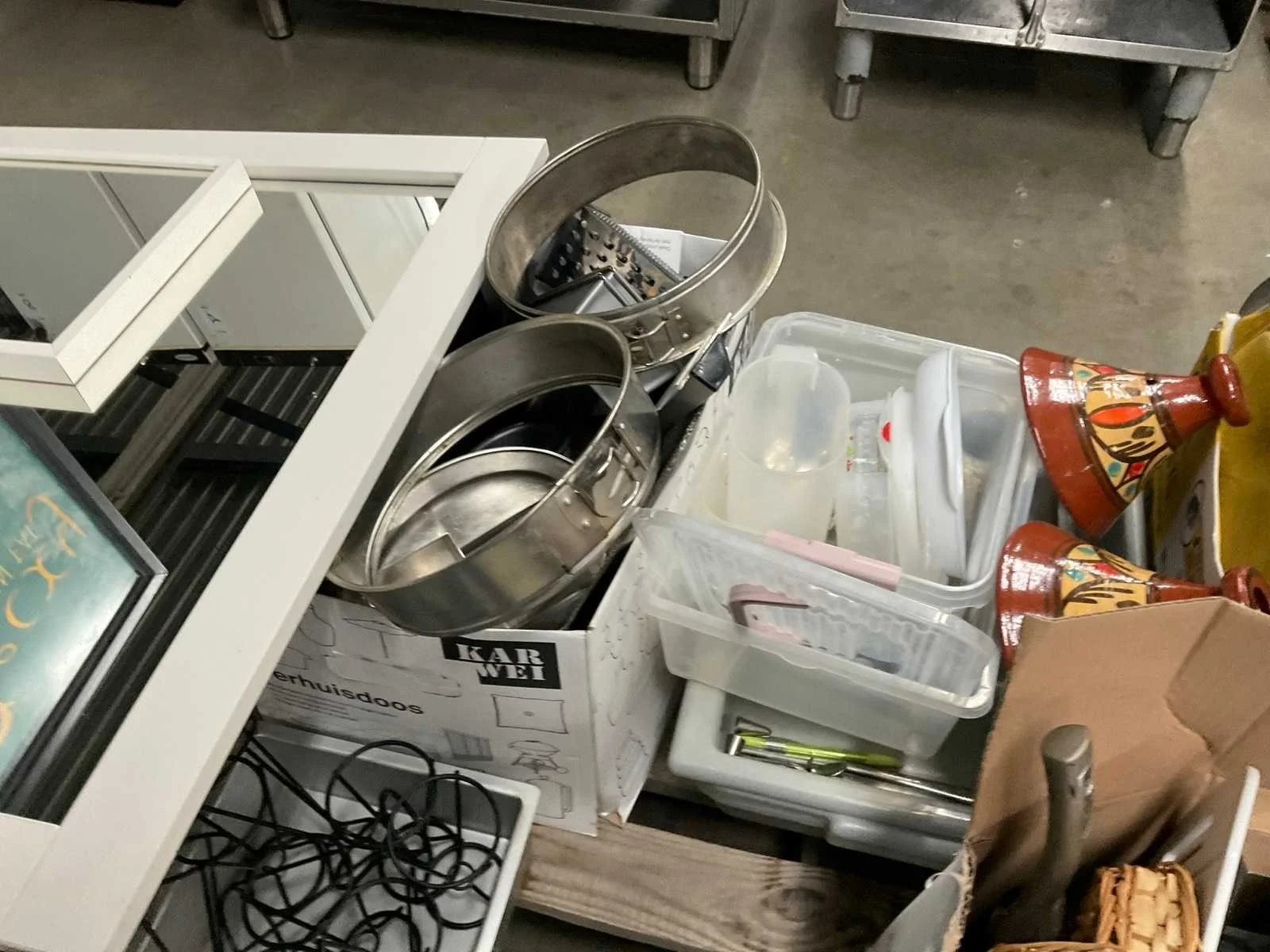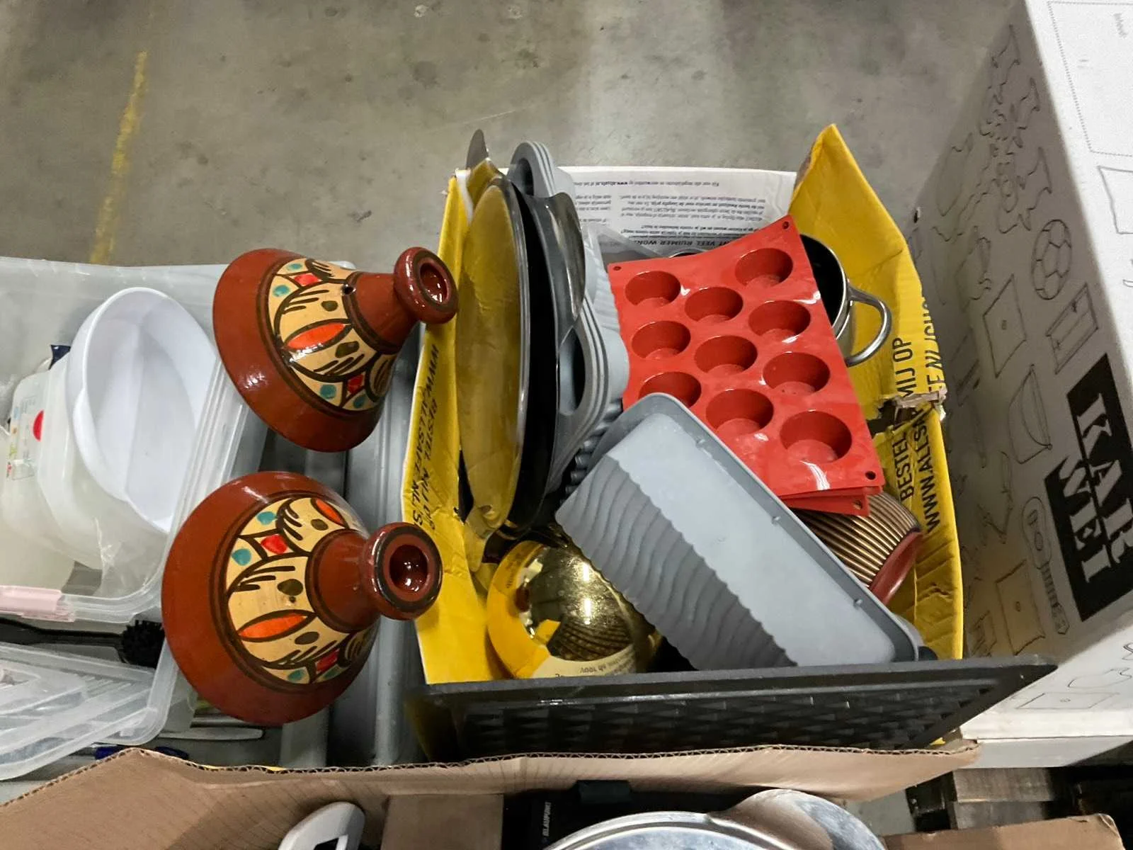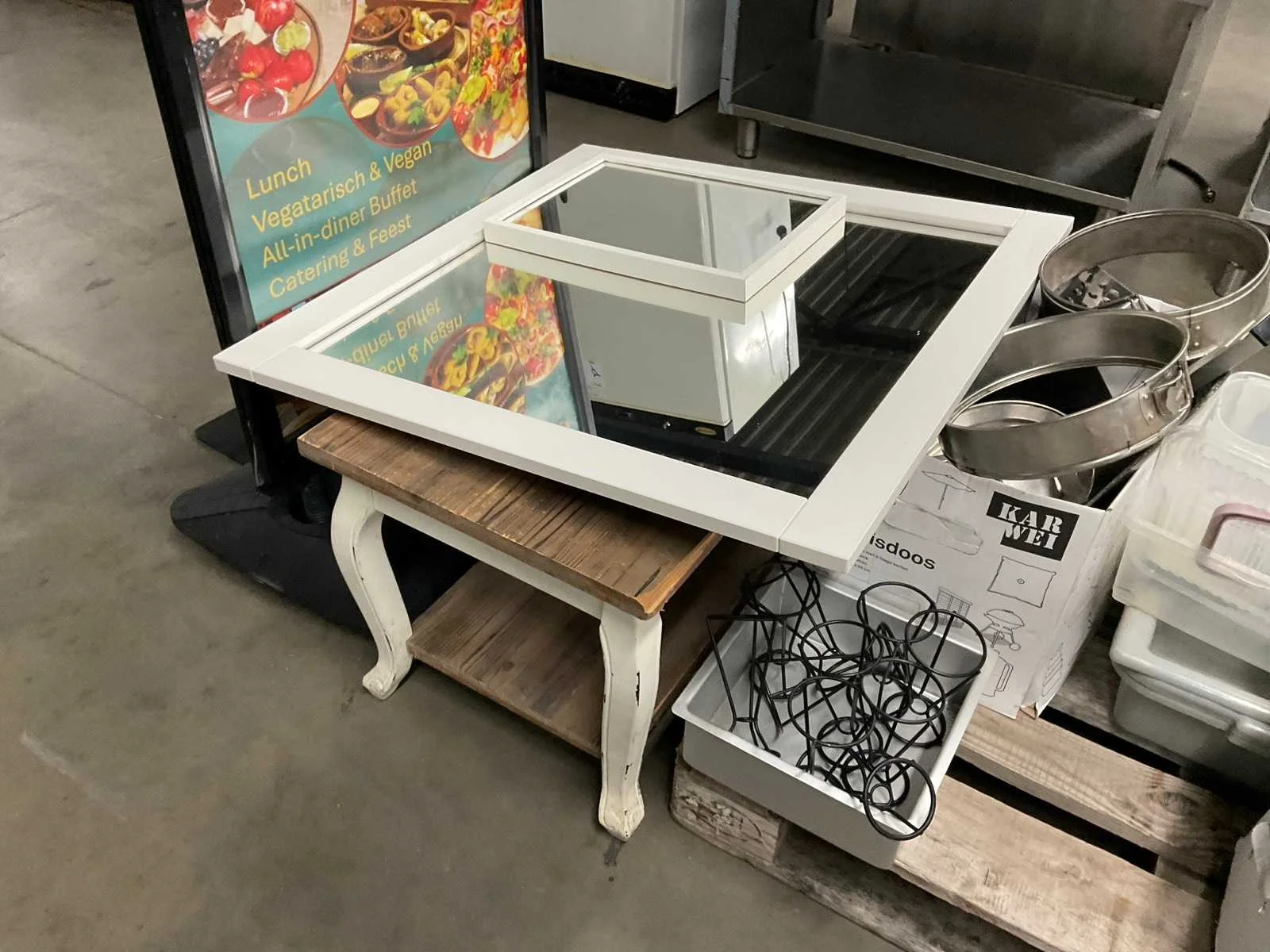 Op 4 pallets 1e: Spiegels 2e: Glazen 3e: Borden 4e: Schoonmaakartikelen 5e: Stoepbord 6e: Bakvormen