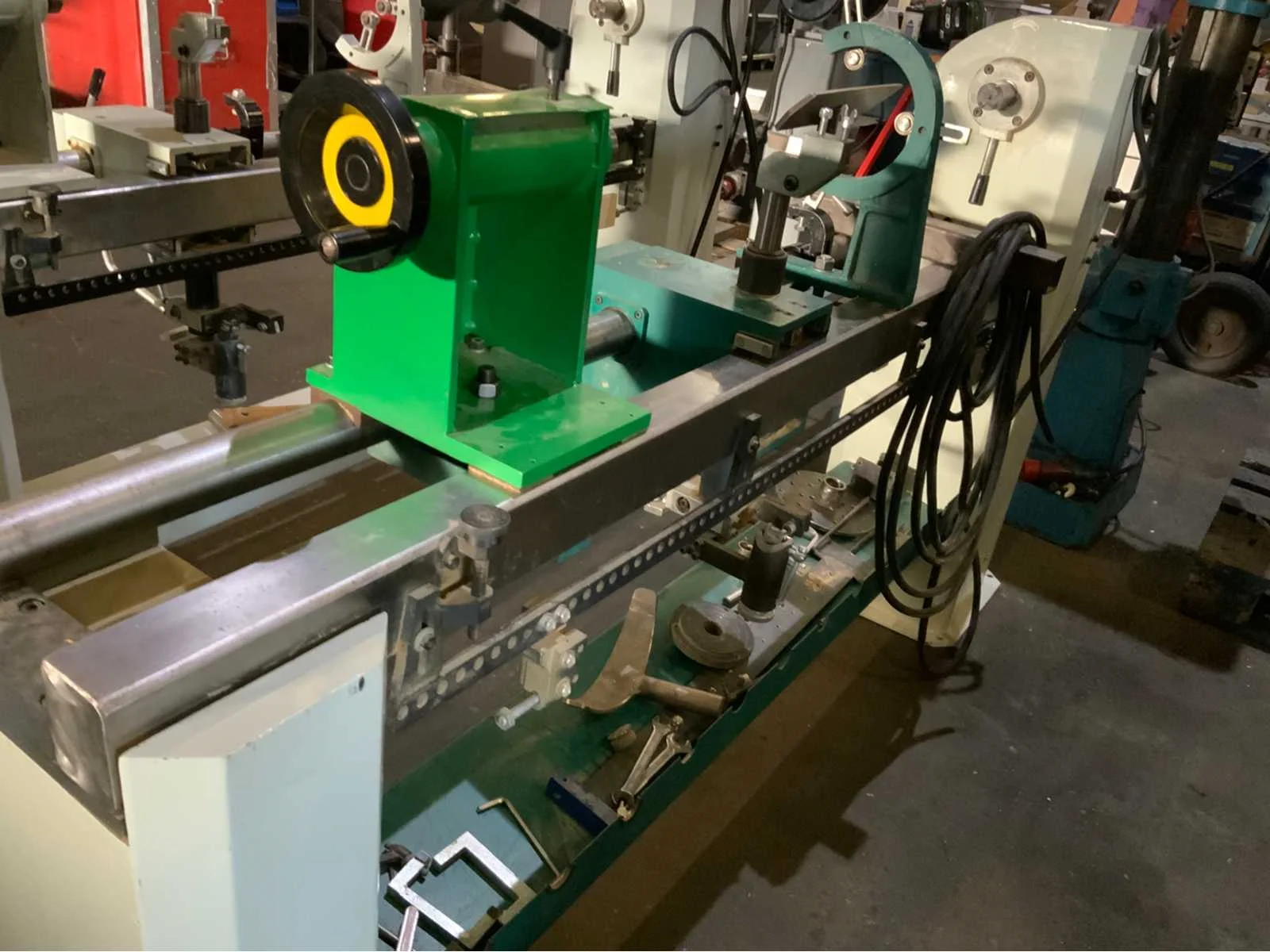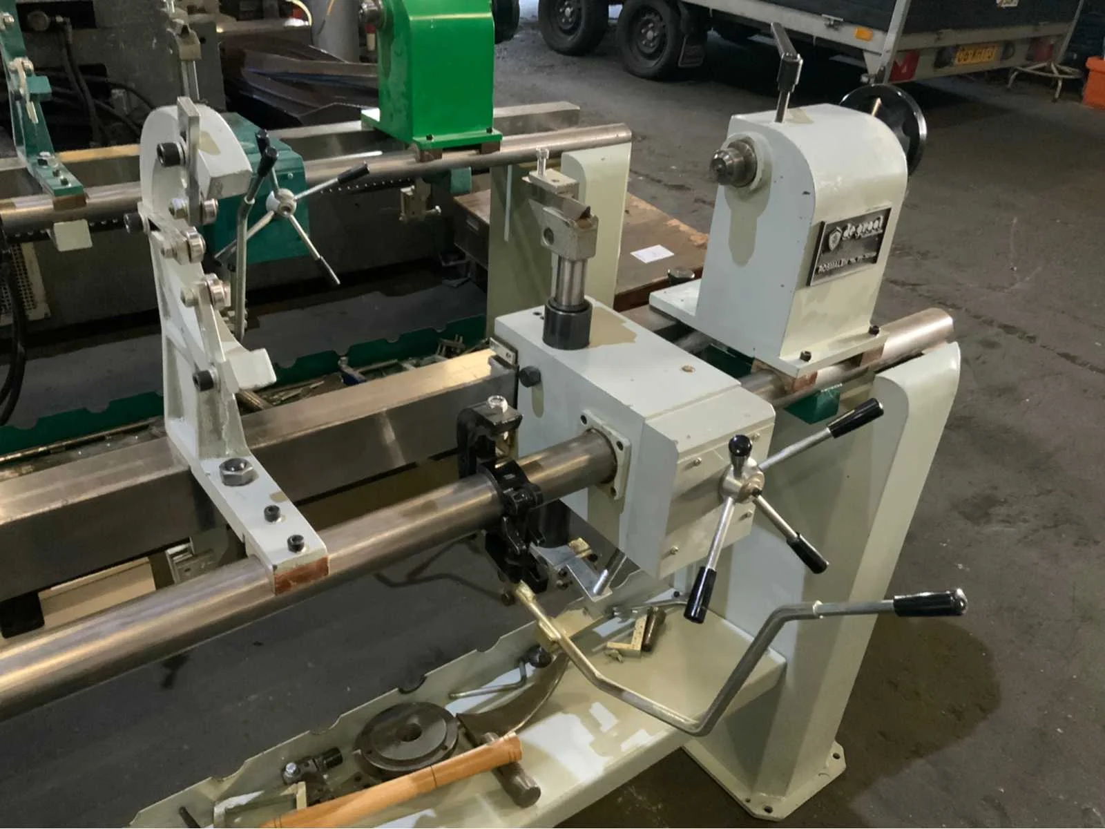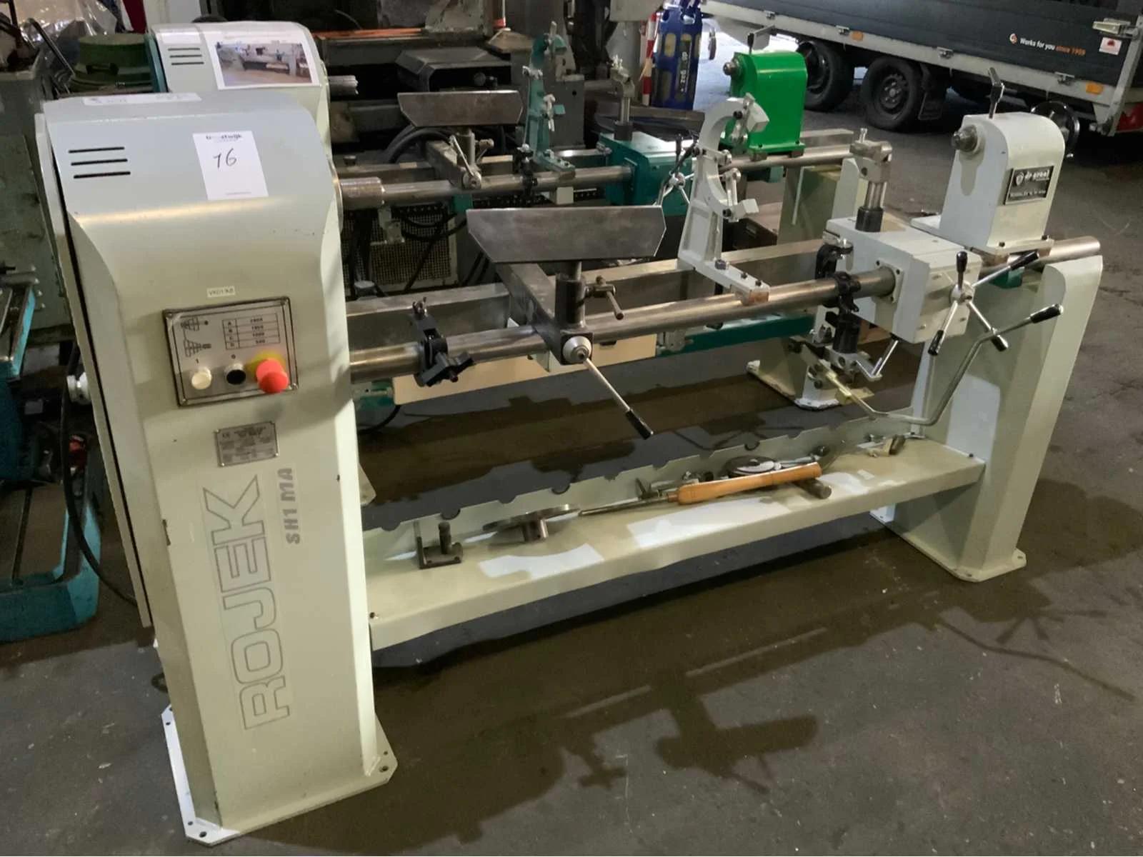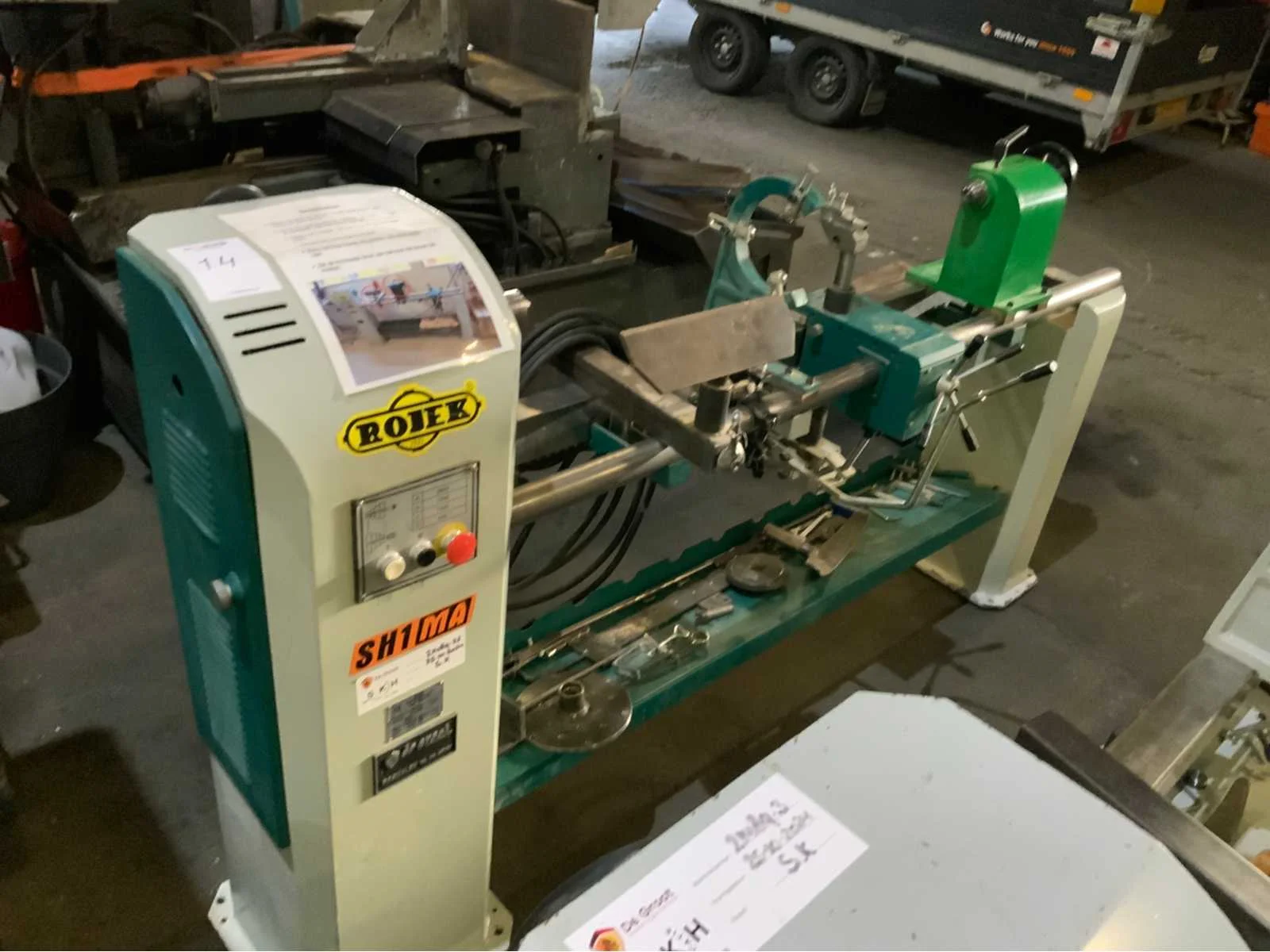 Copier inrichting-2 x stelplaat-Vaste Bril-2x Achterplaat Merk: ROJEK Copier draaibank Type: SH1 MA-1300 Bouwjaar: 2014 Serienummer: 130013008 Draailengte: 1300mm Draai: 450mm Aantal snelheden: 4 Snelheid van n =: 500rpm Snelheid tot n =: 2800rpm Motorvermogen (kW): 1.1kW Aansluiting: 400V Machinegewicht: 250kg Afmeting l: 2000mm Afmeting b: 500mm Afmeting h: 1200mm