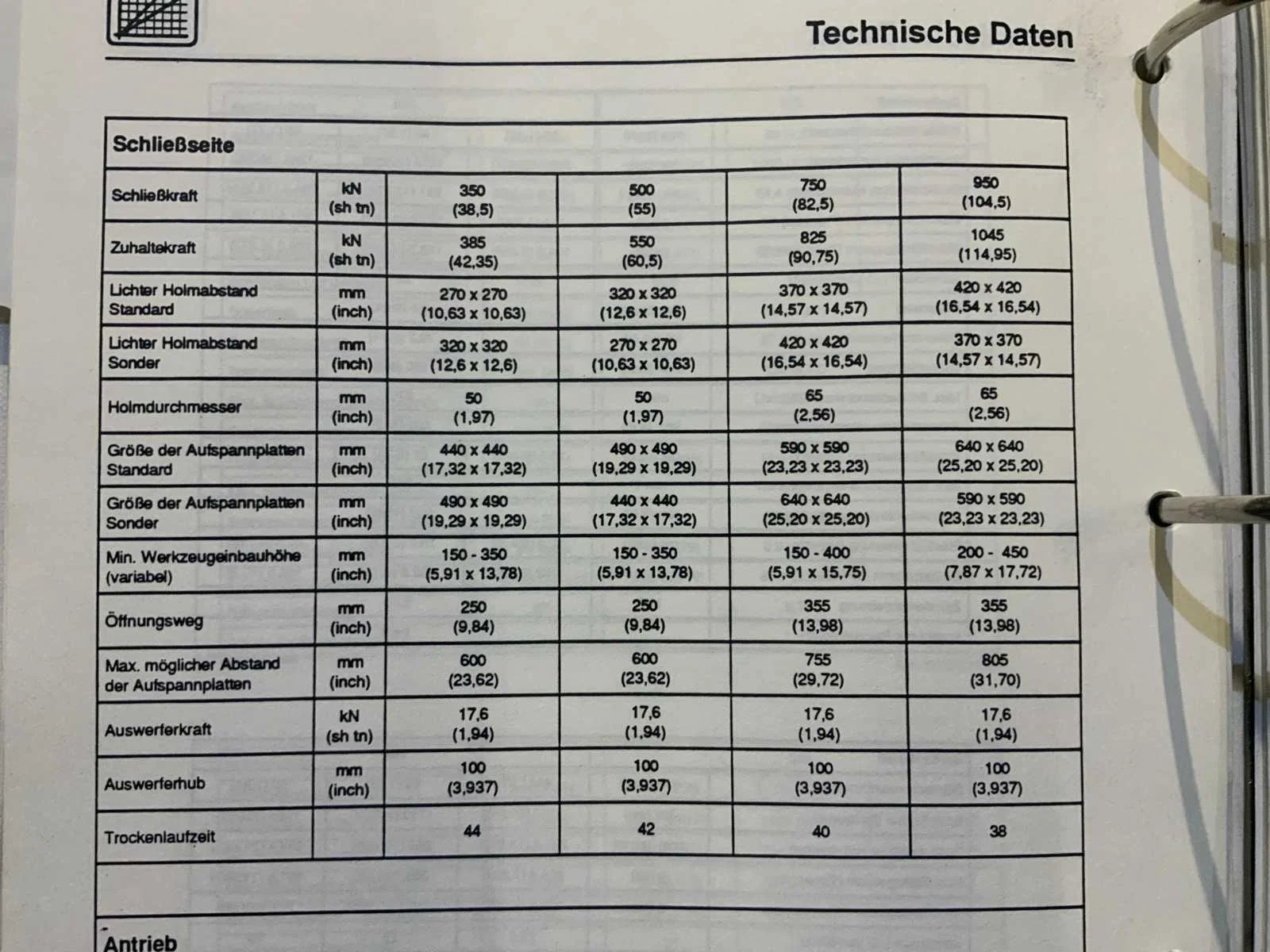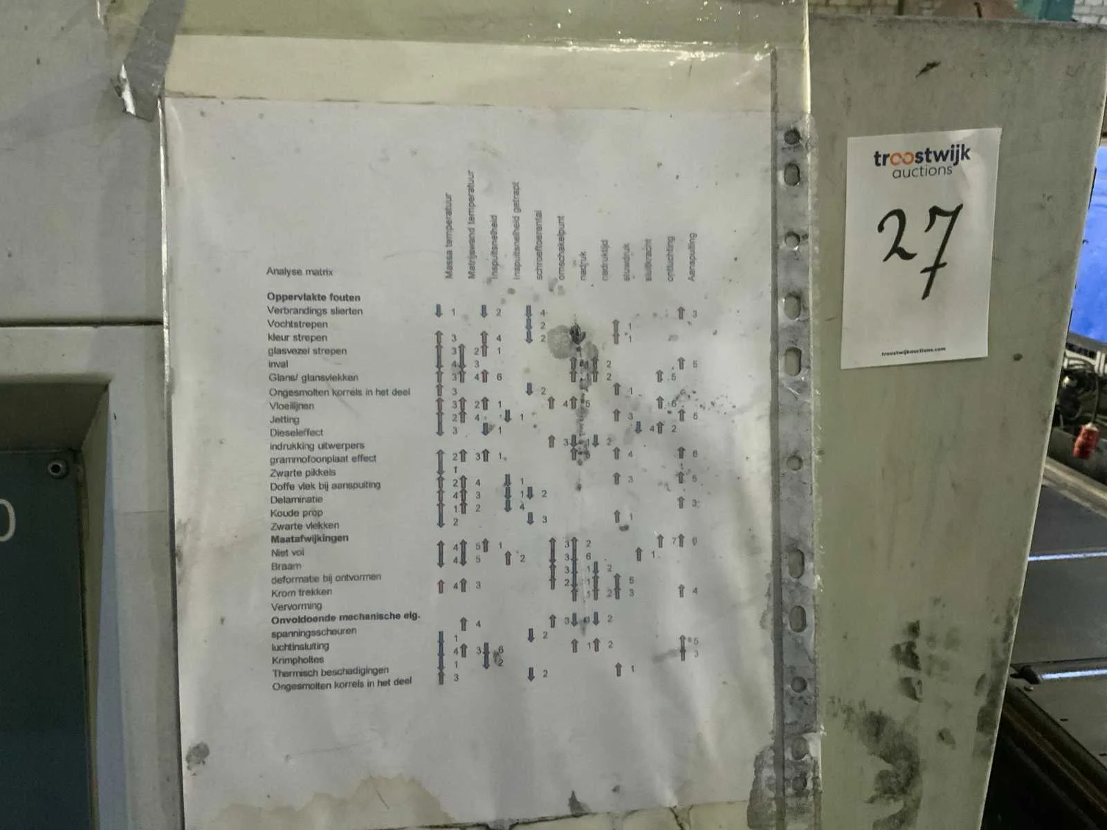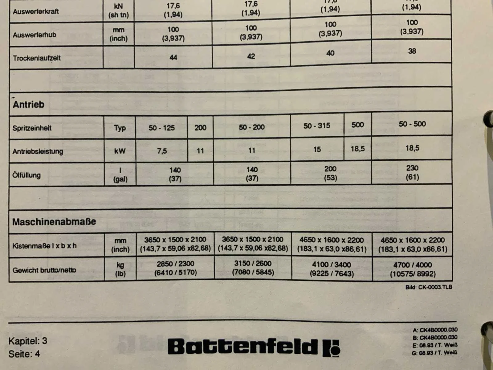 Merk: Battenfeld Type: BA 500 CDK Bouwjaar: 1994 Serienummer: Ck 50926416636 Schroefdiameter: 50mm Sluitkracht: 550kN Uitwerpslag: 100mm Uitwerpkracht: 17.5kN Matrijs afm. l: 320mm Matrijs afm. b: 600mm Matrijs afm. h: 320mm Digitale besturing: true Afgelezen urenstand: 61087 Aansluiting: 380V Machinegewicht: 2500kg Totale afmeting L: 3500mm Totale afmeting Breedte: 1550mm Totale afmeting Hoogte: 1750mm