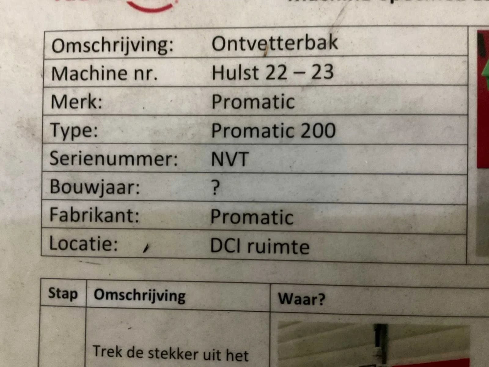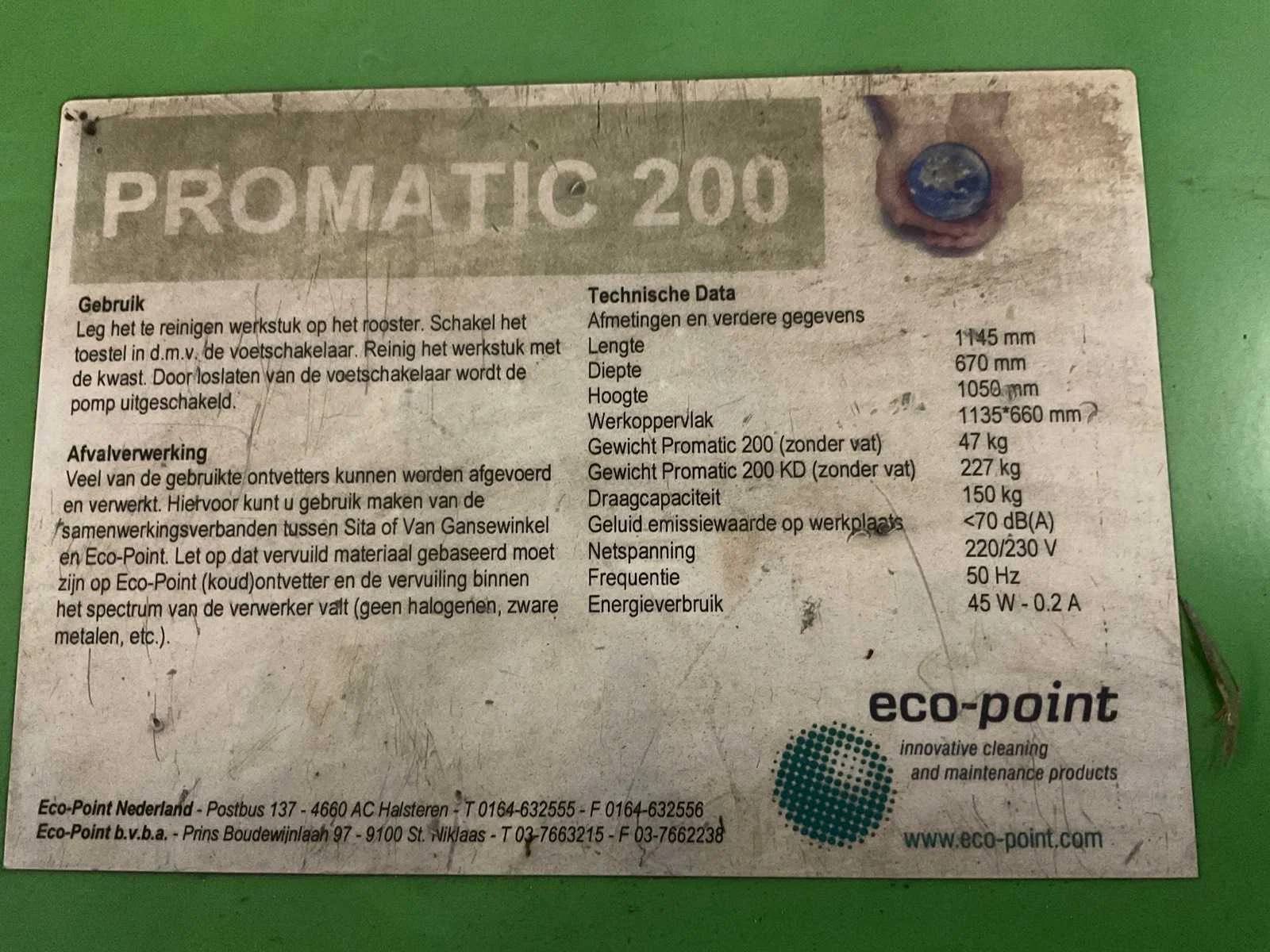 Ontvetterbak, incl. vat met schoonmaakmiddel Merk: Promatic Type: 200 Totale afmeting L: 1170mm Totale afmeting Breedte: 700mm Totale afmeting Hoogte: 1050mm