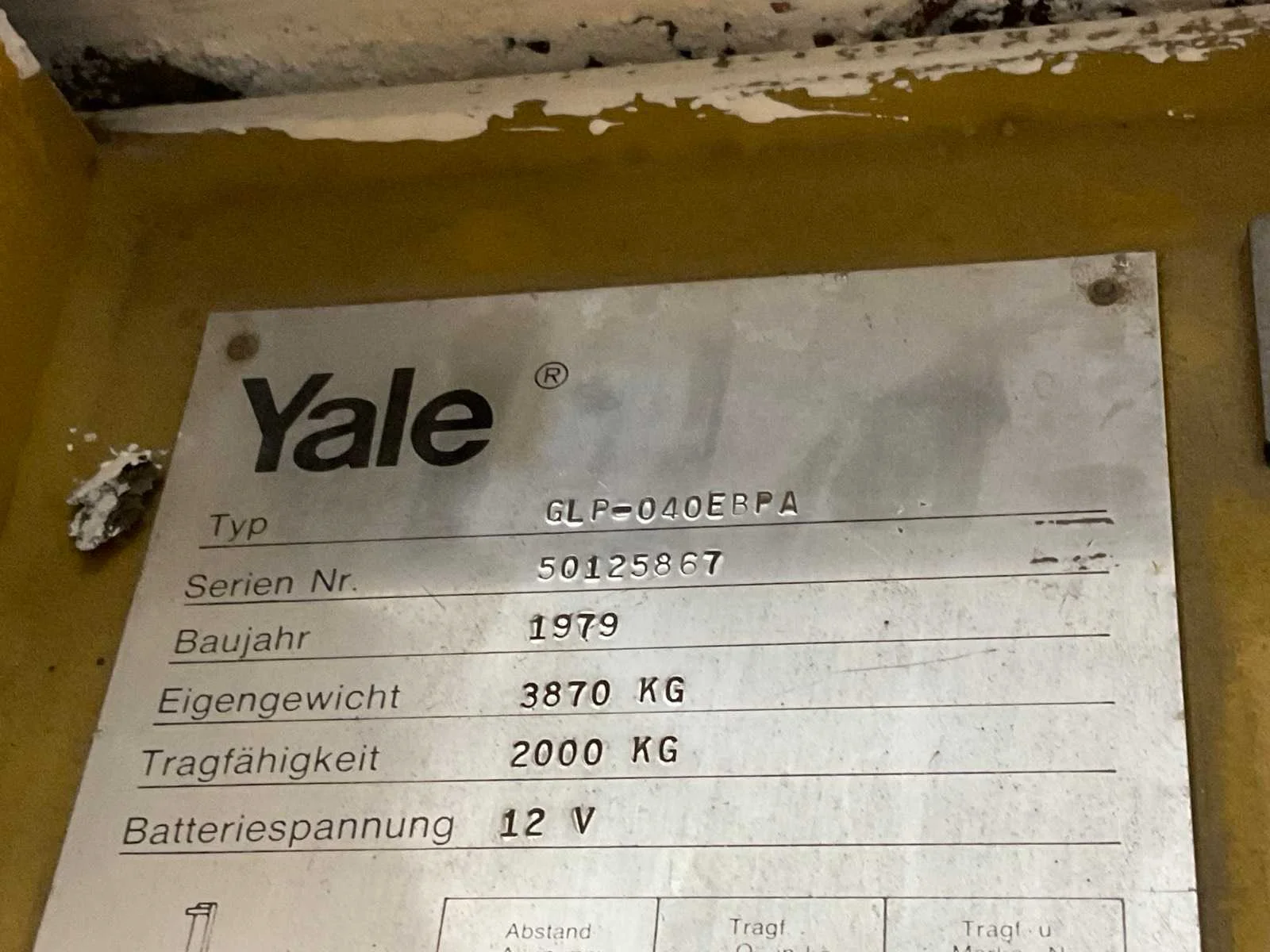 Met lepels, niet getest, gas verdamper is defect Merk: Yale Type: GLP-040EBPA Bouwjaar: 1979 Serienummer: 50125867 Brandstof: LPG Aantal wielen: 4 Afgelezen urenstand: 7748 Eigen gewicht: 3870kg Vol rubber banden: true Totale afmeting L: 2600mm Totale afmeting Breedte: 1230mm Totale afmeting Hoogte: 2100mm LPG: true