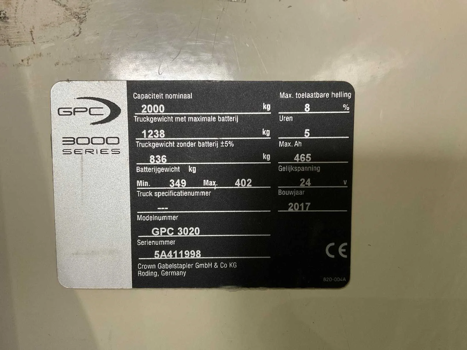 Merk: Crown Type: GPC3020 Bouwjaar: 2017 Serienummer: 5A411998 Hefvermogen: 2000kg Lepellengte: 2400mm Meerij palletwagen: true Accu lader: true Totale afmeting L: 3700mm Totale afmeting Breedte: 830mm Totale afmeting Hoogte: 2300mm