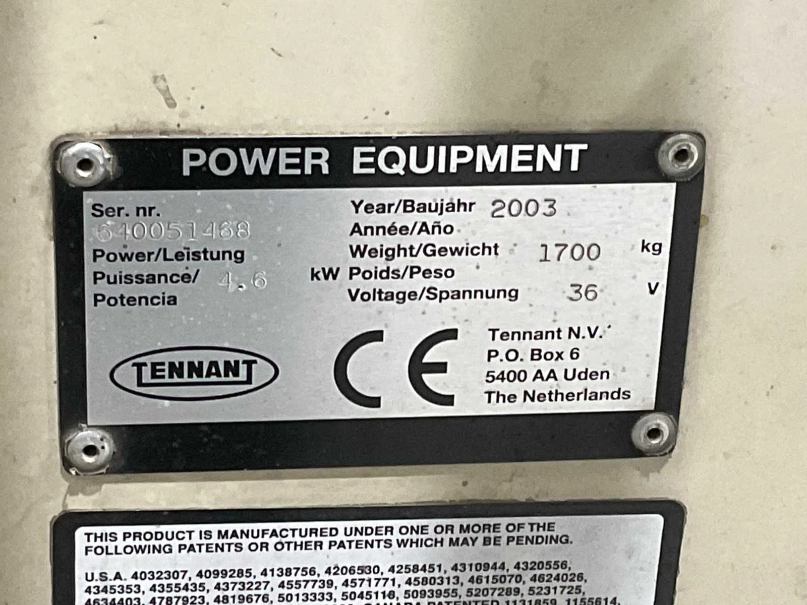 Werkend met acculader Merk: Tennant Type: 6400 Bouwjaar: 2003 Serienummer: 640051488 Elektrisch: true Afgelezen urenstand: 1709hr Accu lader: true Eigen gewicht: 1700kg Totale afmeting L: 2070mm Totale afmeting Breedte: 1300mm Totale afmeting Hoogte: 1500mm