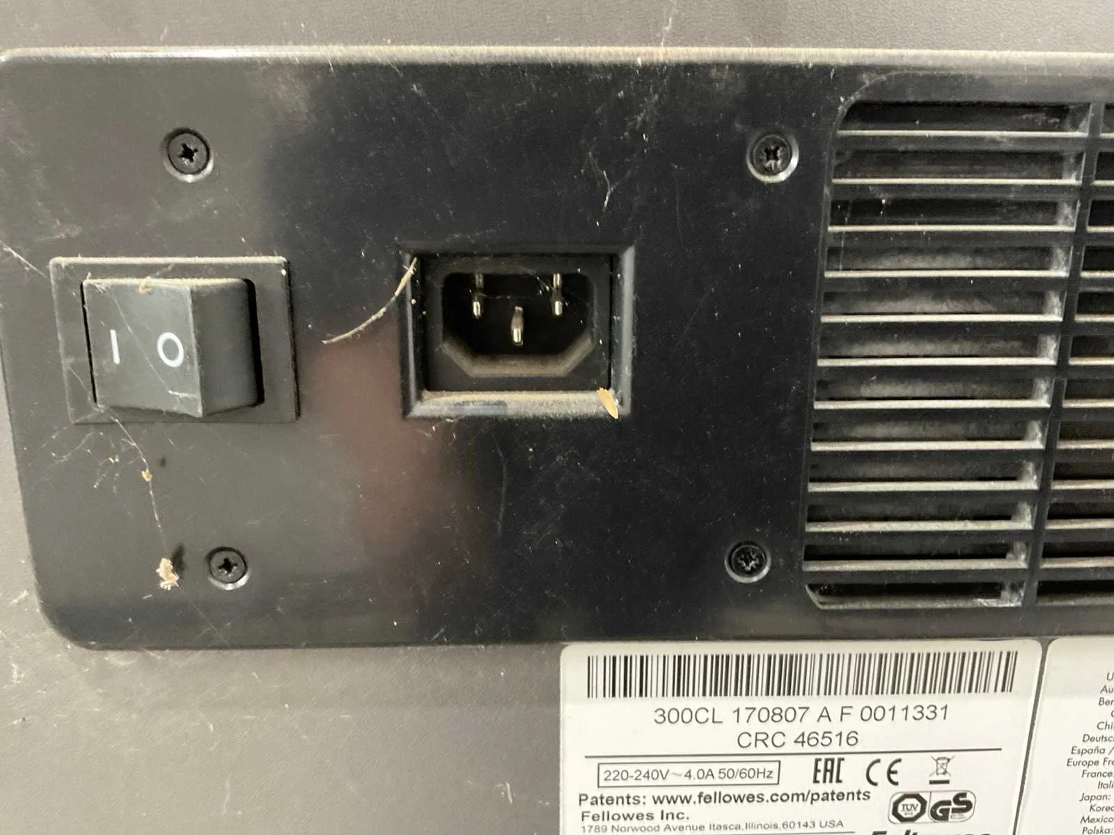 Merk: Fellowes Type: 300CL Aansluiting: 220V Totale afmeting L: 650mm Totale afmeting Breedte: 420mm Totale afmeting Hoogte: 820mm