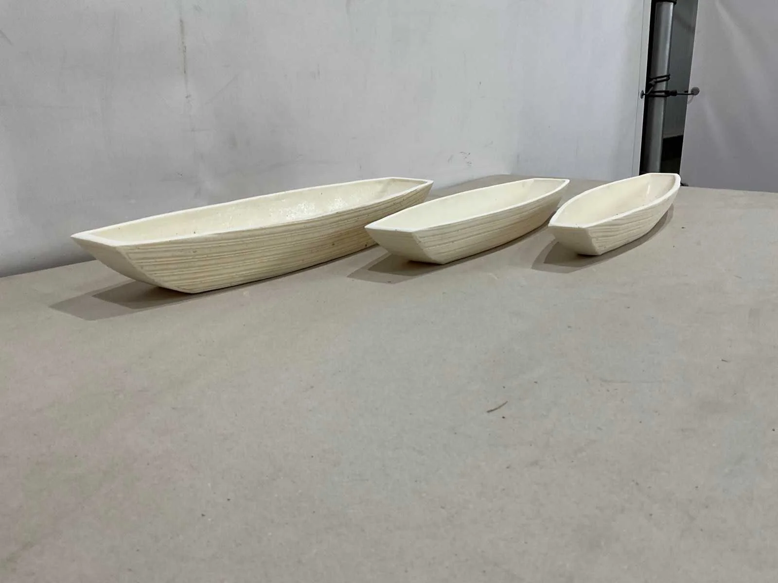 Kavel bestaat uit 1 doos met 12 sets; per set 3 schalen; 1 x circa 47 cm lang; 14 cm breed ; 6 cm hoog; 1x circa 44 cm lang ; 11 cm breed; 5 cm hoog; 1x circa 43 cm lang; 10 cm breed; 5 cm hoog; ongebruikt