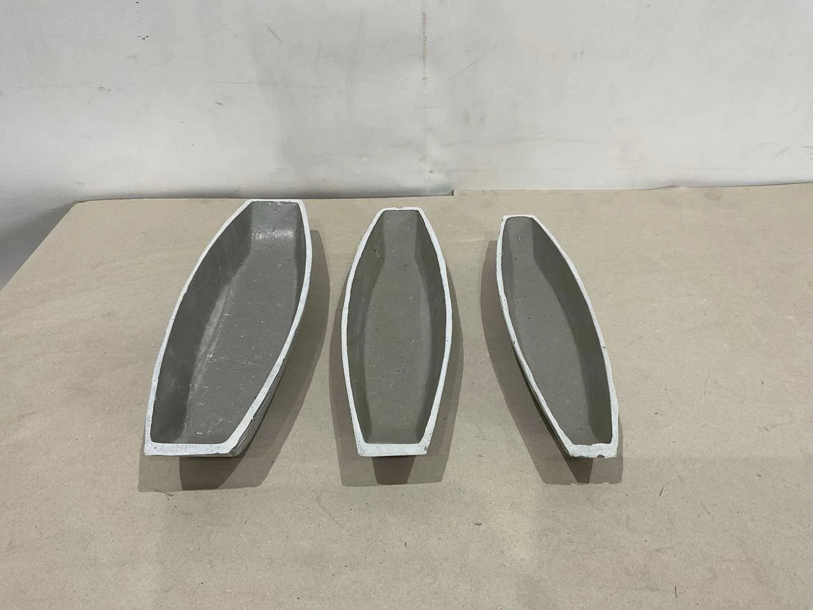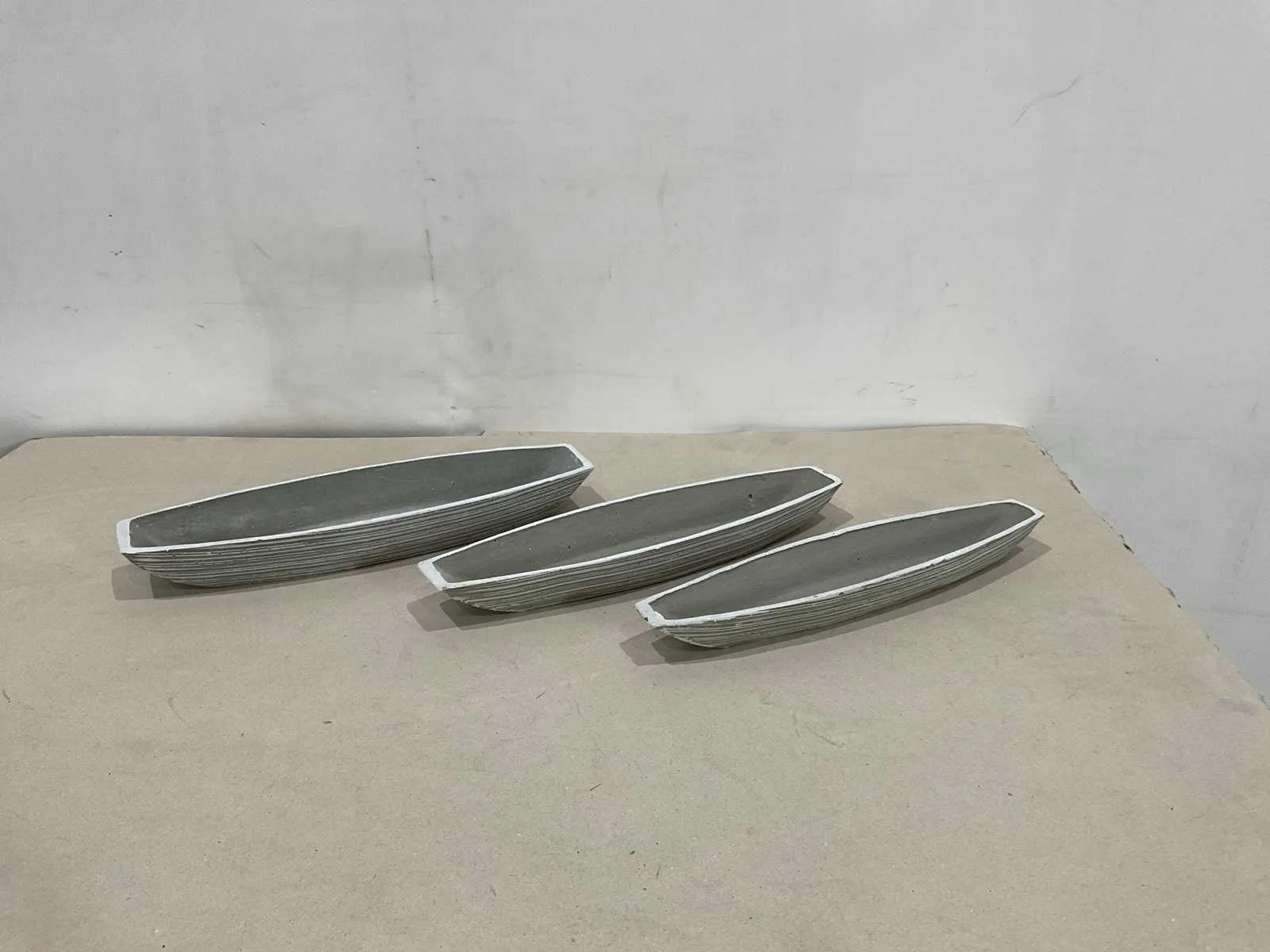 Kavel bestaat uit 1 doos met 12 sets; per set 3 schalen; 1 x circa 47 cm lang; 14 cm breed ; 6 cm hoog; 1x circa 44 cm lang ; 11 cm breed; 5 cm hoog; 1x circa 43 cm lang; 10 cm breed; 5 cm hoog; ongebruikt