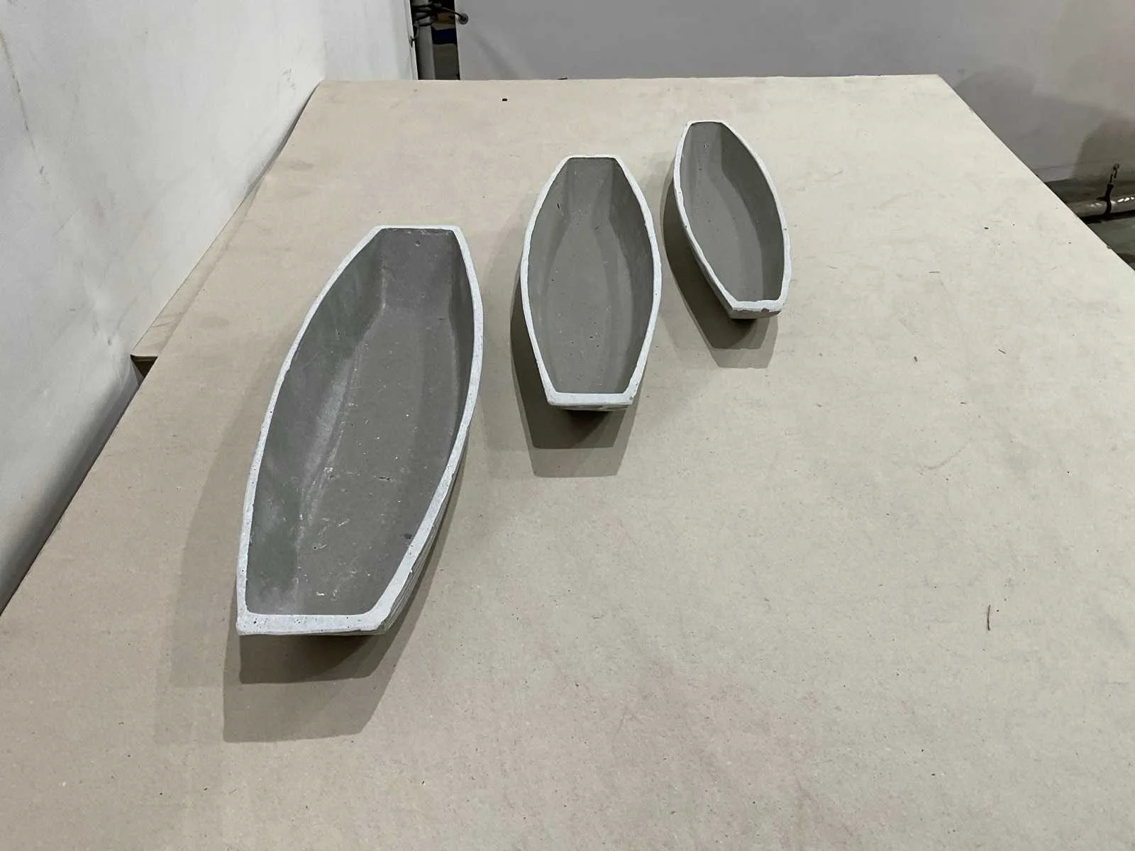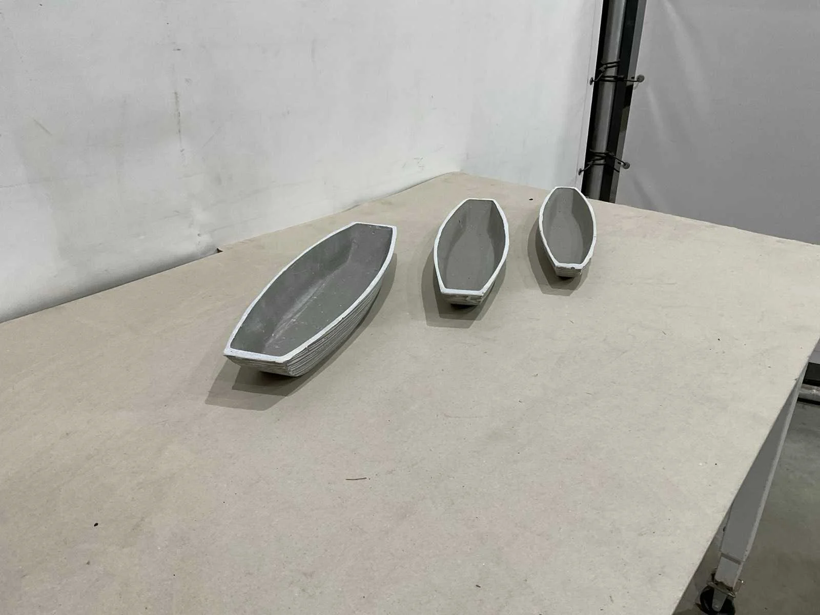 Kavel bestaat uit 1 doos met 12 sets; per set 3 schalen; 1 x circa 47 cm lang; 14 cm breed ; 6 cm hoog; 1x circa 44 cm lang ; 11 cm breed; 5 cm hoog; 1x circa 43 cm lang; 10 cm breed; 5 cm hoog; ongebruikt