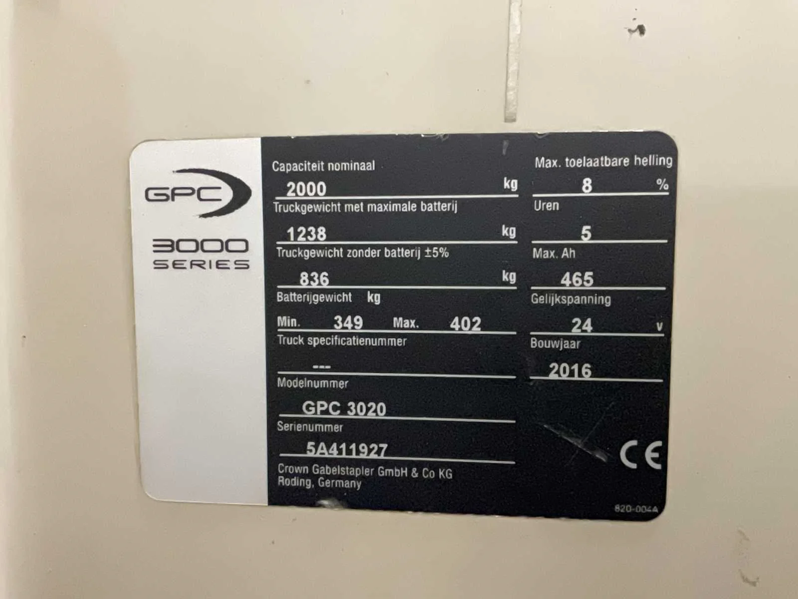 Werkend Merk: Crown Type: CPC 3020 Bouwjaar: 2016 Serienummer: 5A411927 Hefvermogen: 2000kg Lepellengte: 2400mm Meerij palletwagen: true Accu lader: true Totale afmeting L: 3900mm Totale afmeting Breedte: 860mm Totale afmeting Hoogte: 2350mm