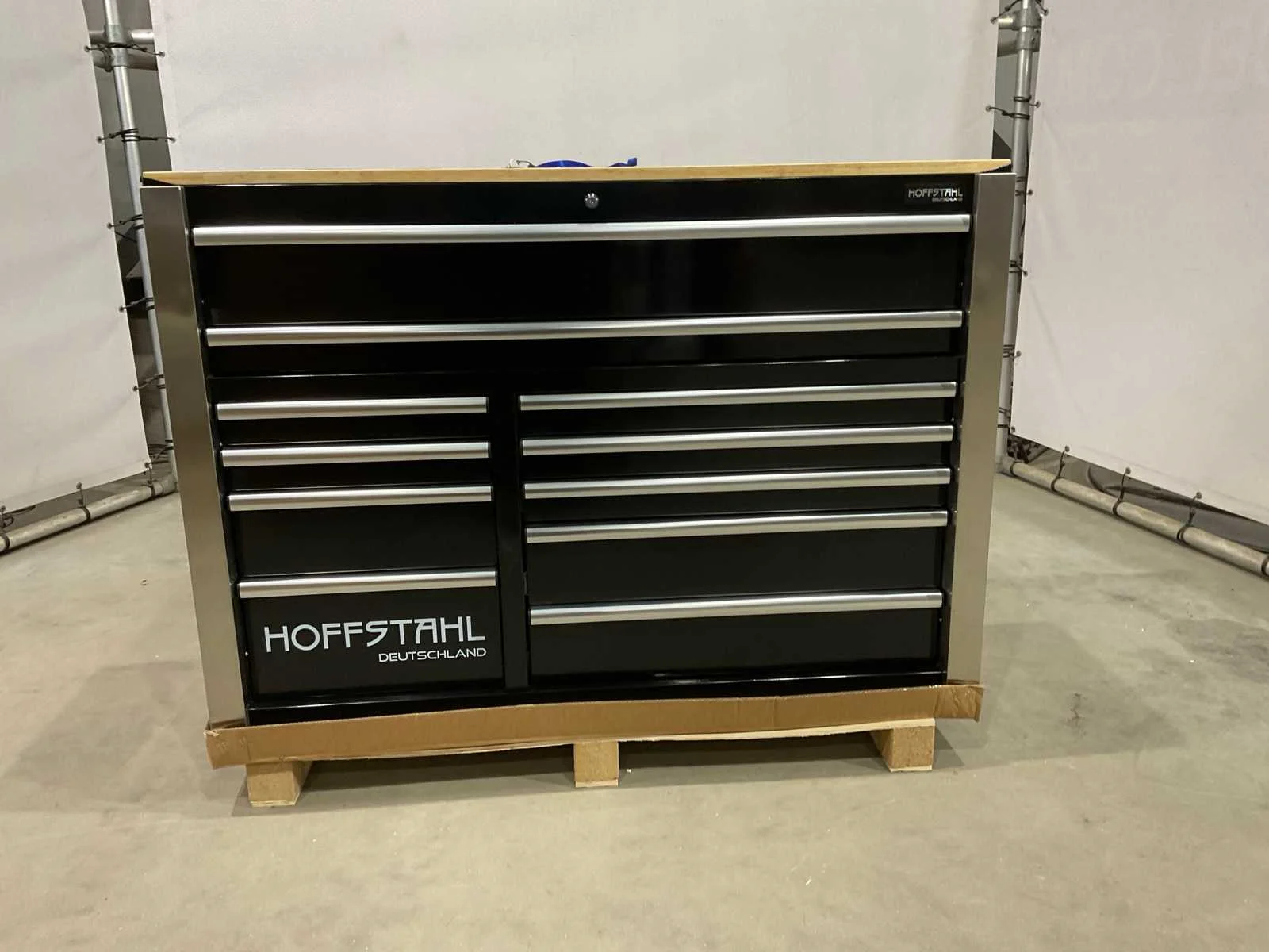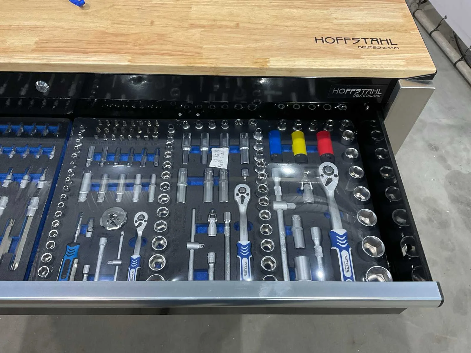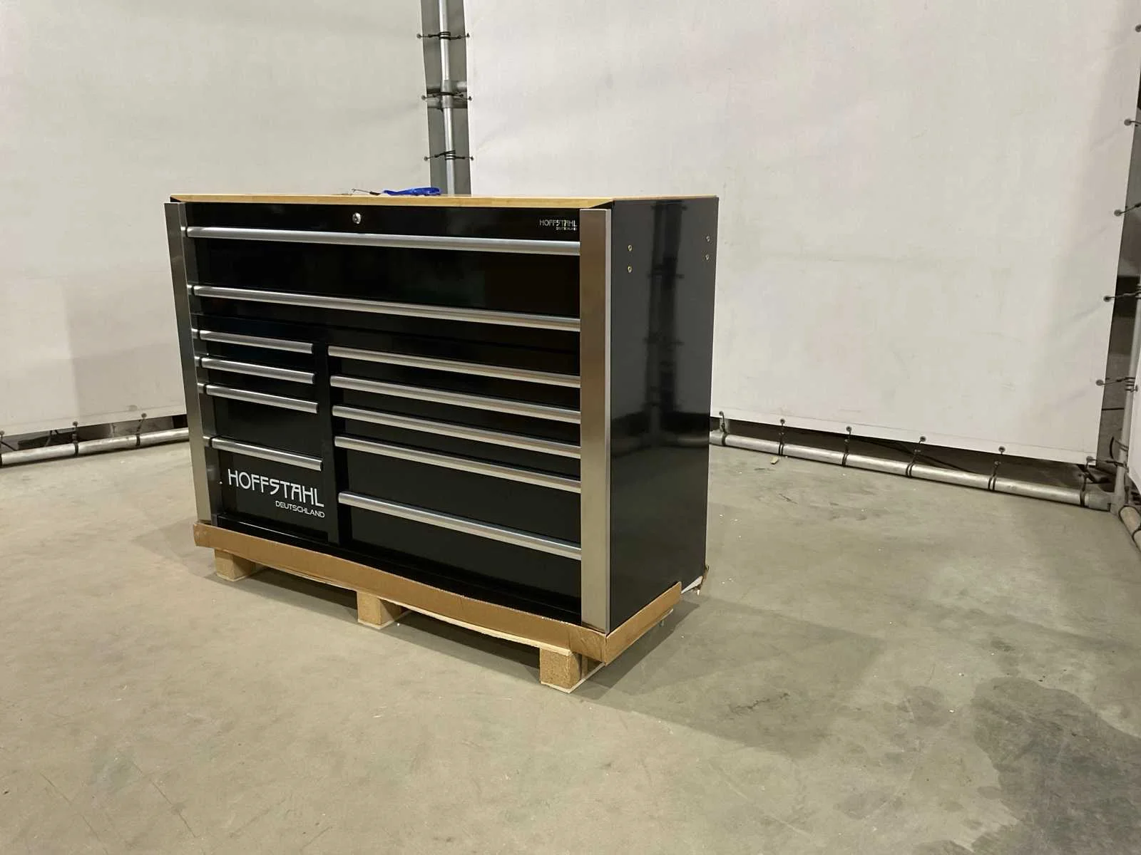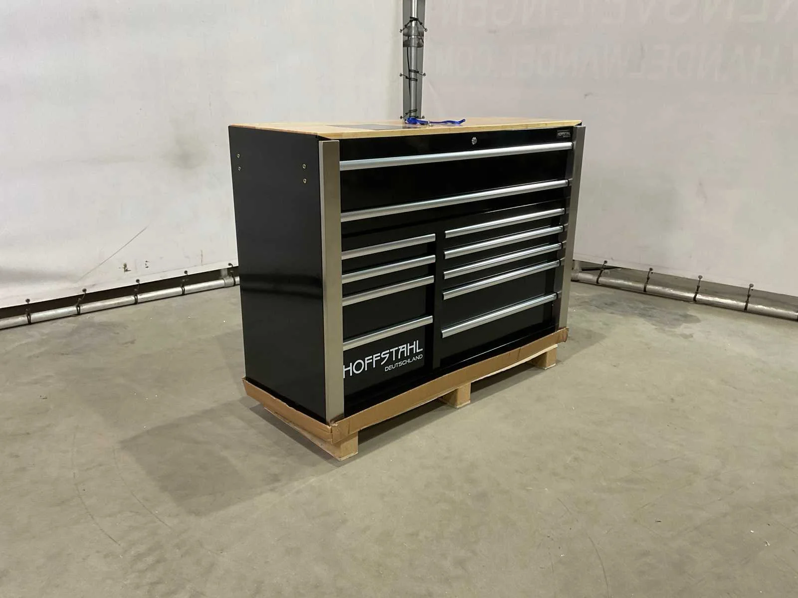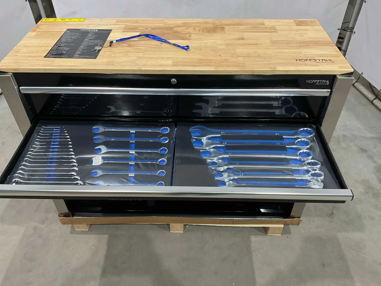 9 lades met professioneel gereedschap; ingelegd in foam; houten werkblad; afsluitbaar; ongebruikt Merk: Hoffstahl Model: XXXL-Edition Lengte: 135cm Breedte: 52cm Hoogte: 108cm