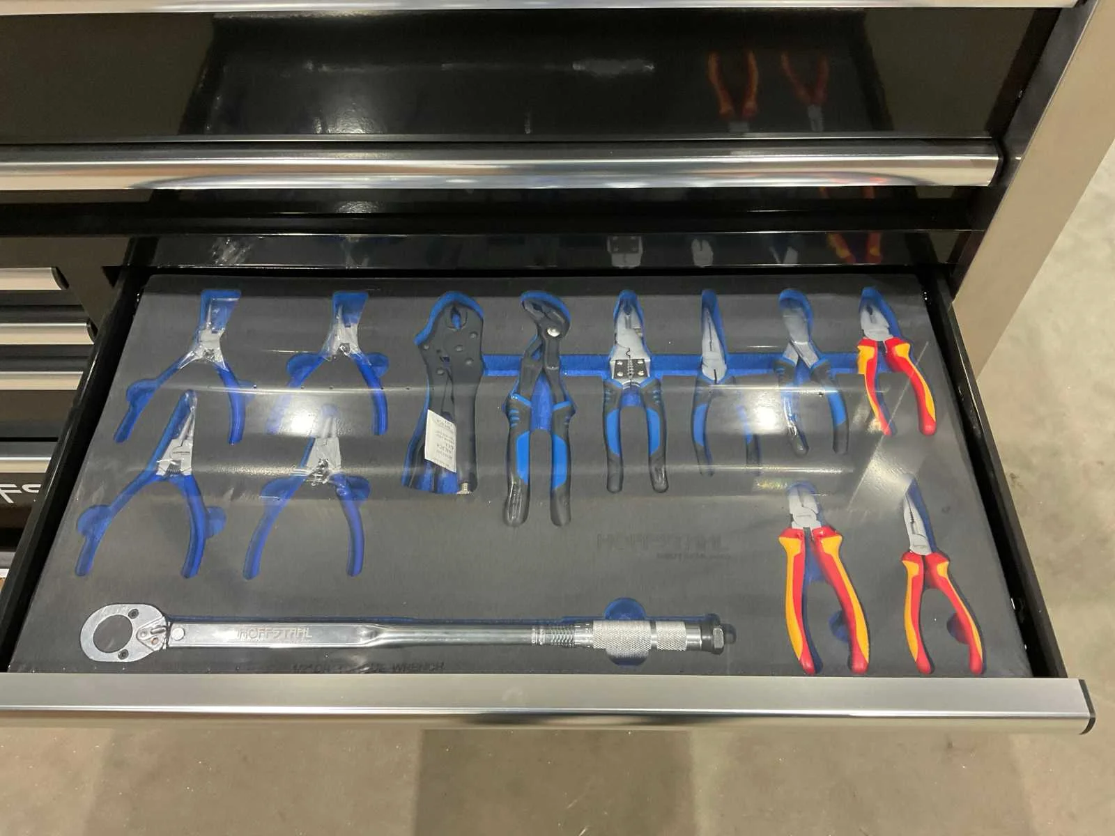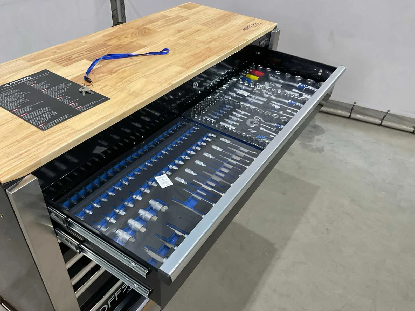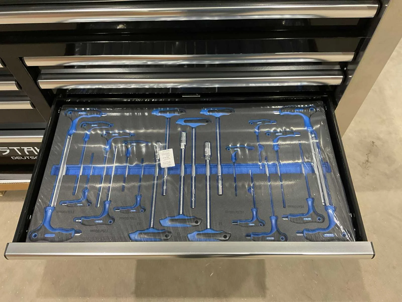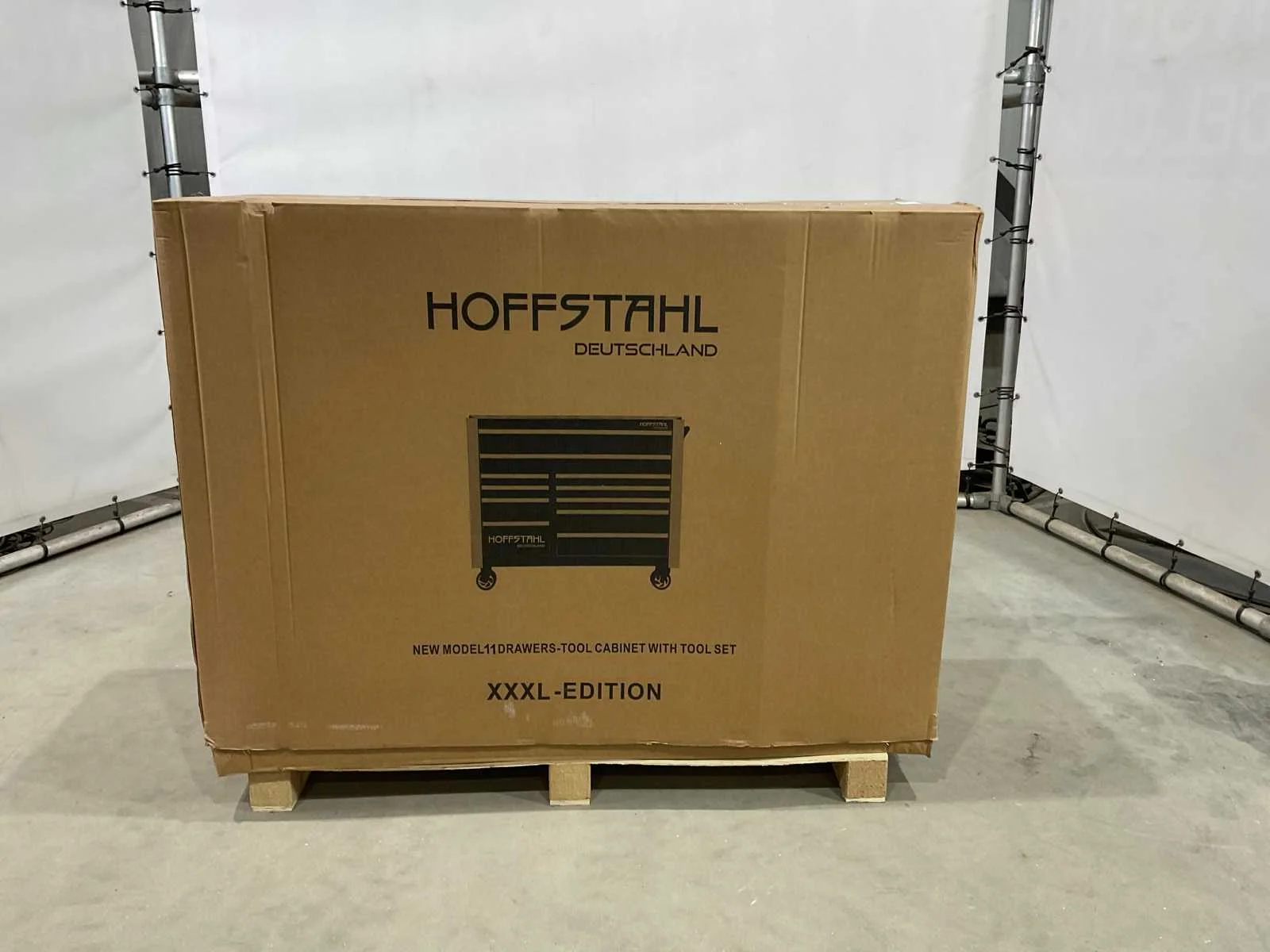 9 lades met professioneel gereedschap; ingelegd in foam; houten werkblad; afsluitbaar; ongebruikt Merk: Hoffstahl Model: XXXL-Edition Lengte: 135cm Breedte: 52cm Hoogte: 108cm