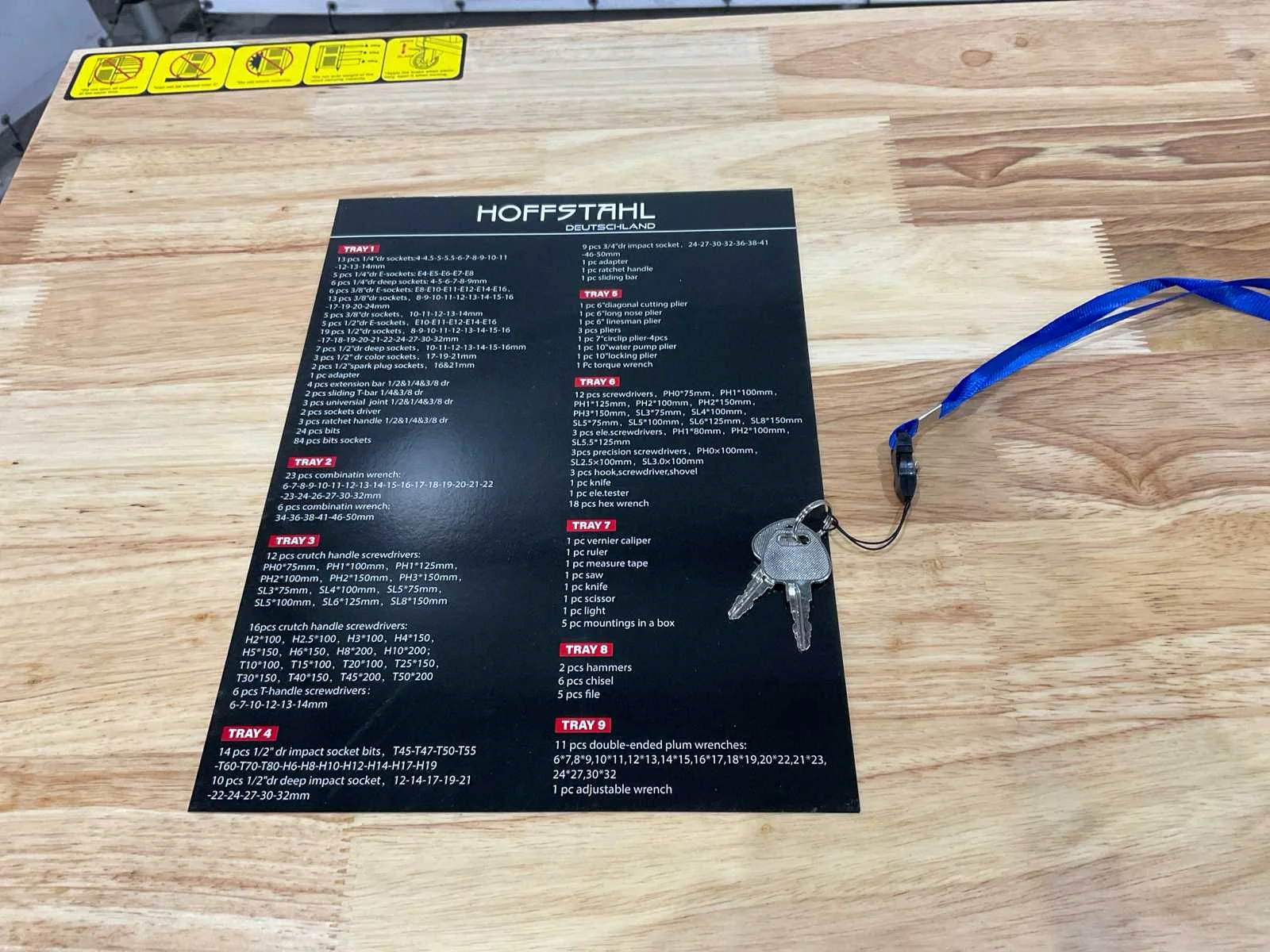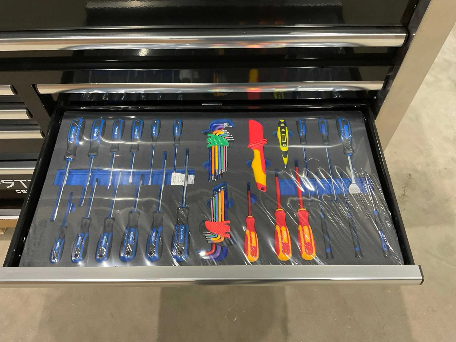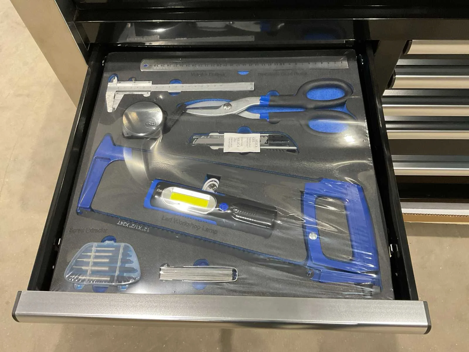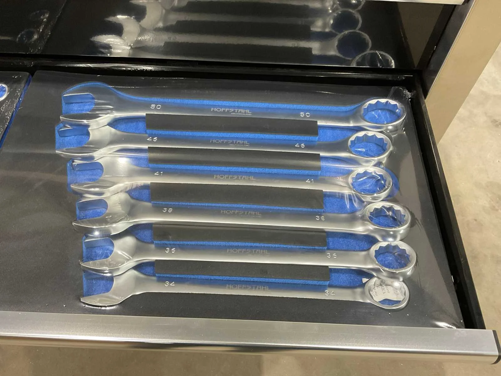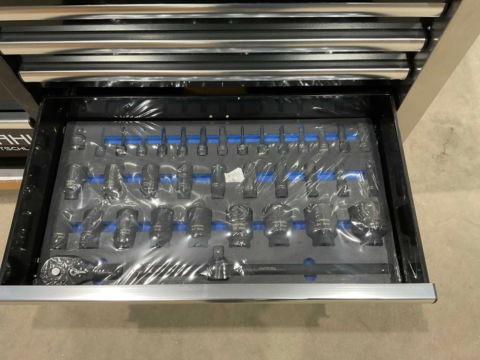 9 lades met professioneel gereedschap; ingelegd in foam; houten werkblad; afsluitbaar; ongebruikt Merk: Hoffstahl Model: XXXL-Edition Lengte: 135cm Breedte: 52cm Hoogte: 108cm