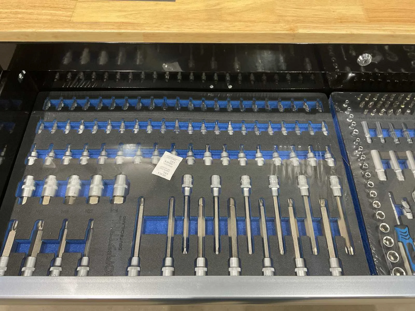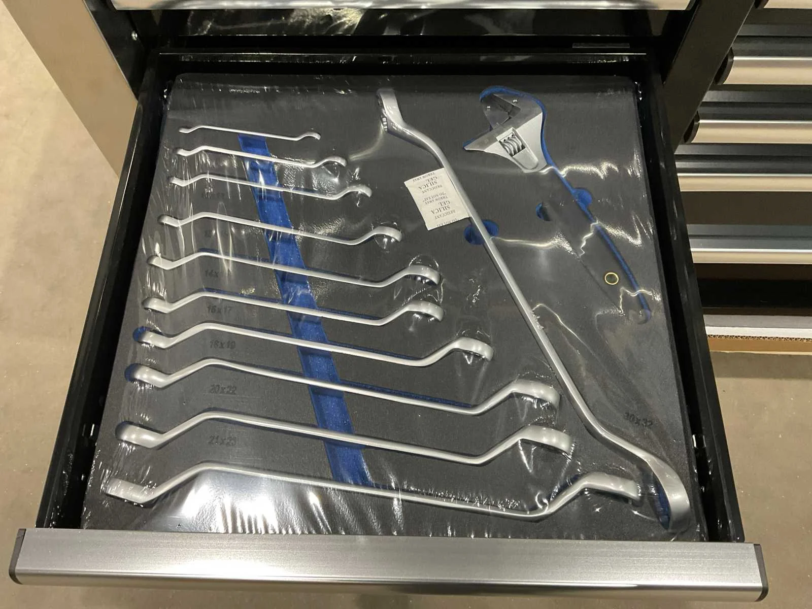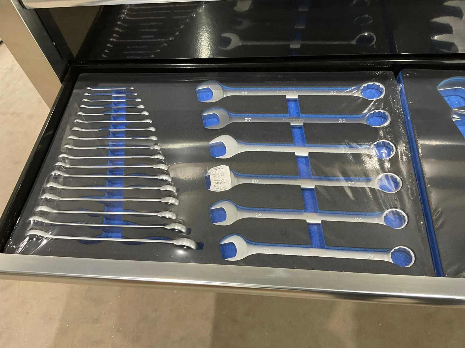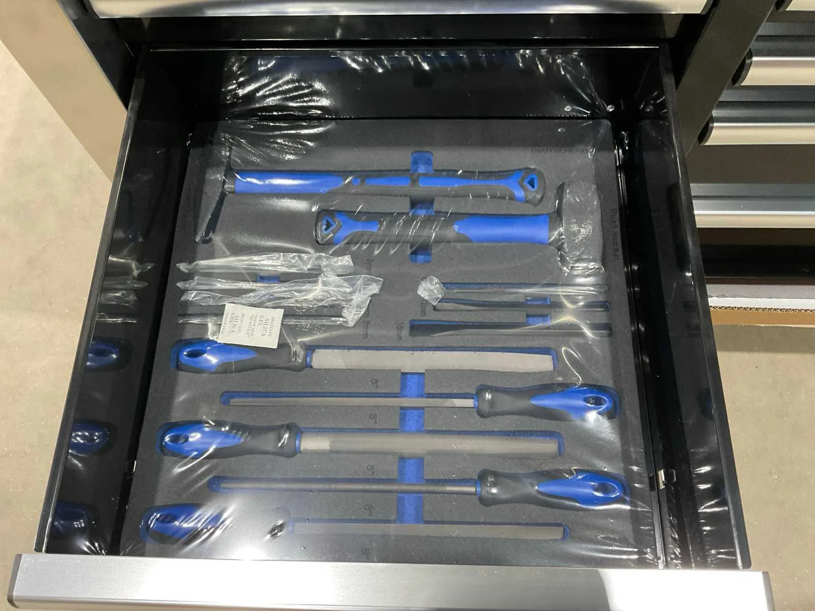 9 lades met professioneel gereedschap; ingelegd in foam; houten werkblad; afsluitbaar; ongebruikt Merk: Hoffstahl Model: XXXL-Edition Lengte: 135cm Breedte: 52cm Hoogte: 108cm