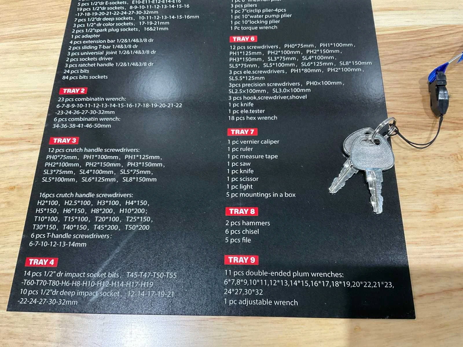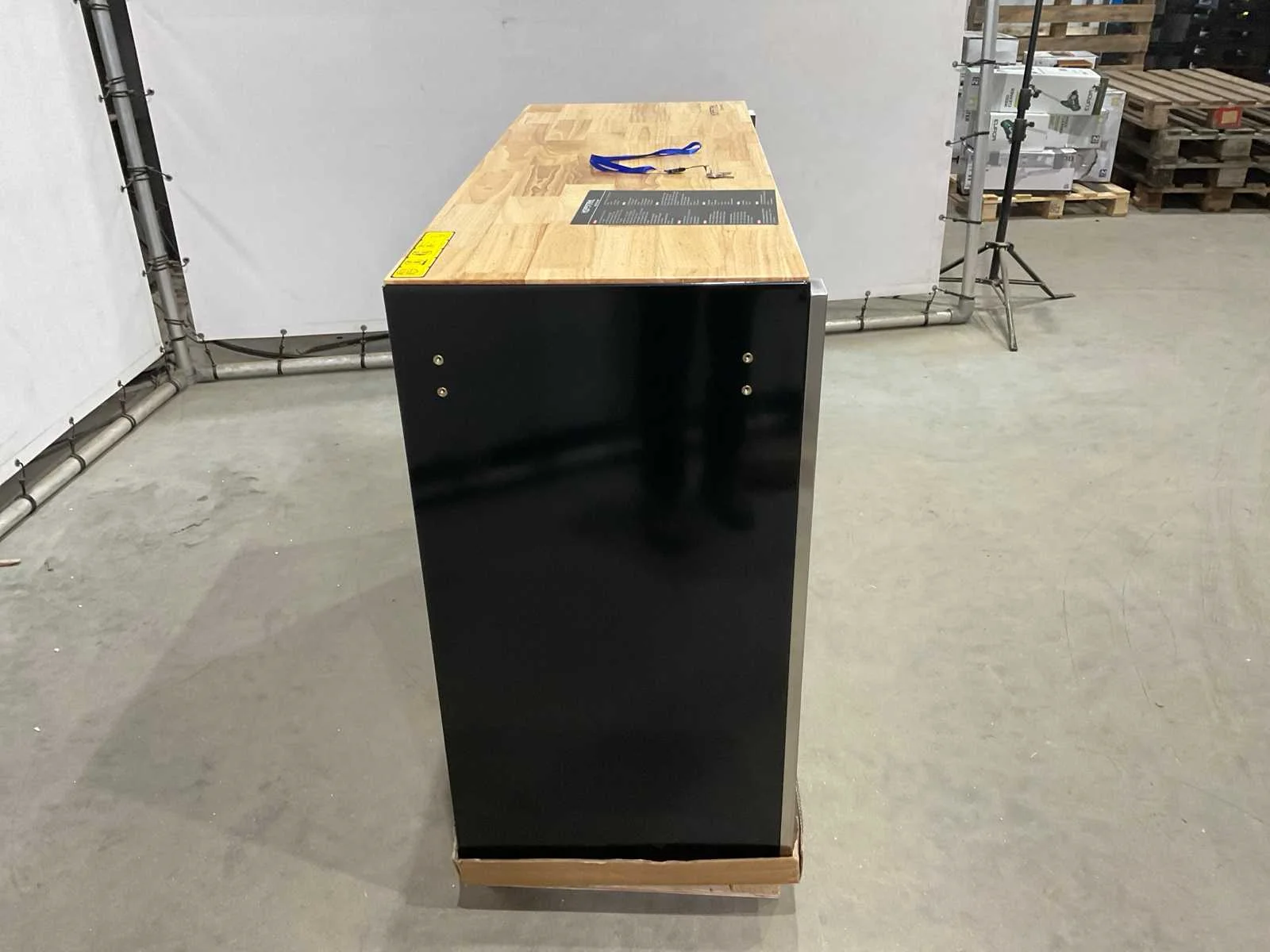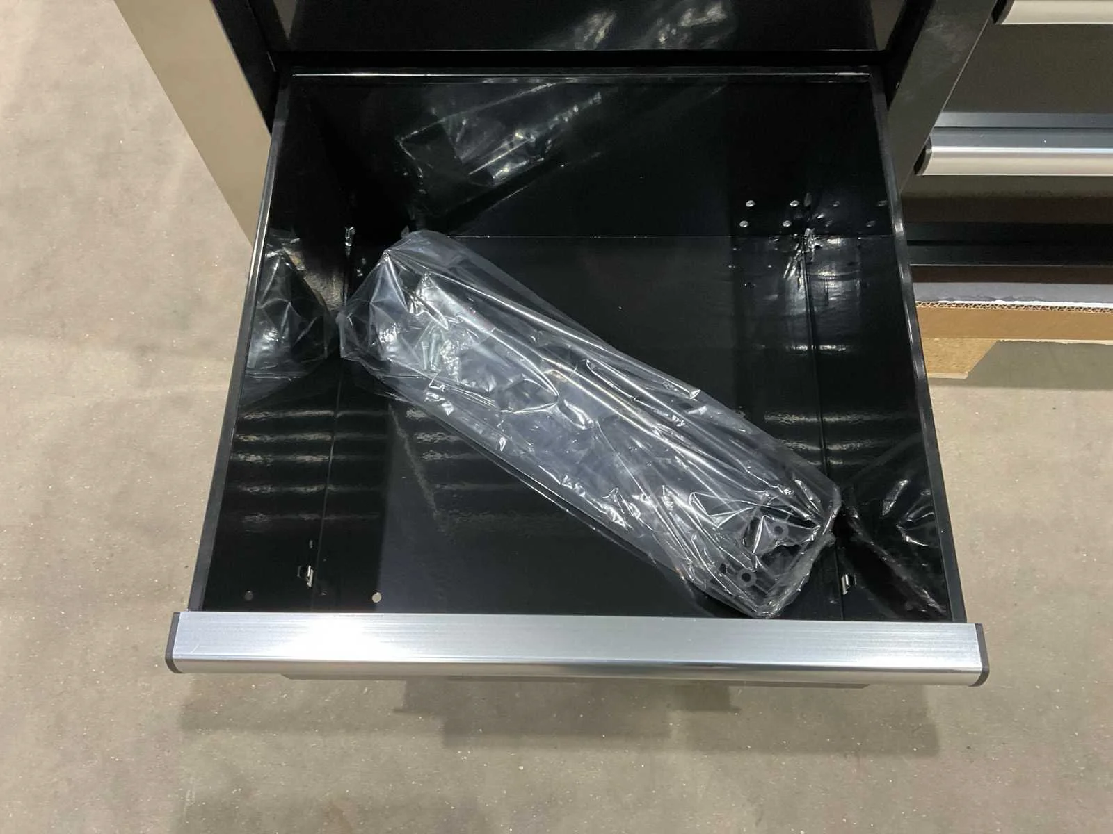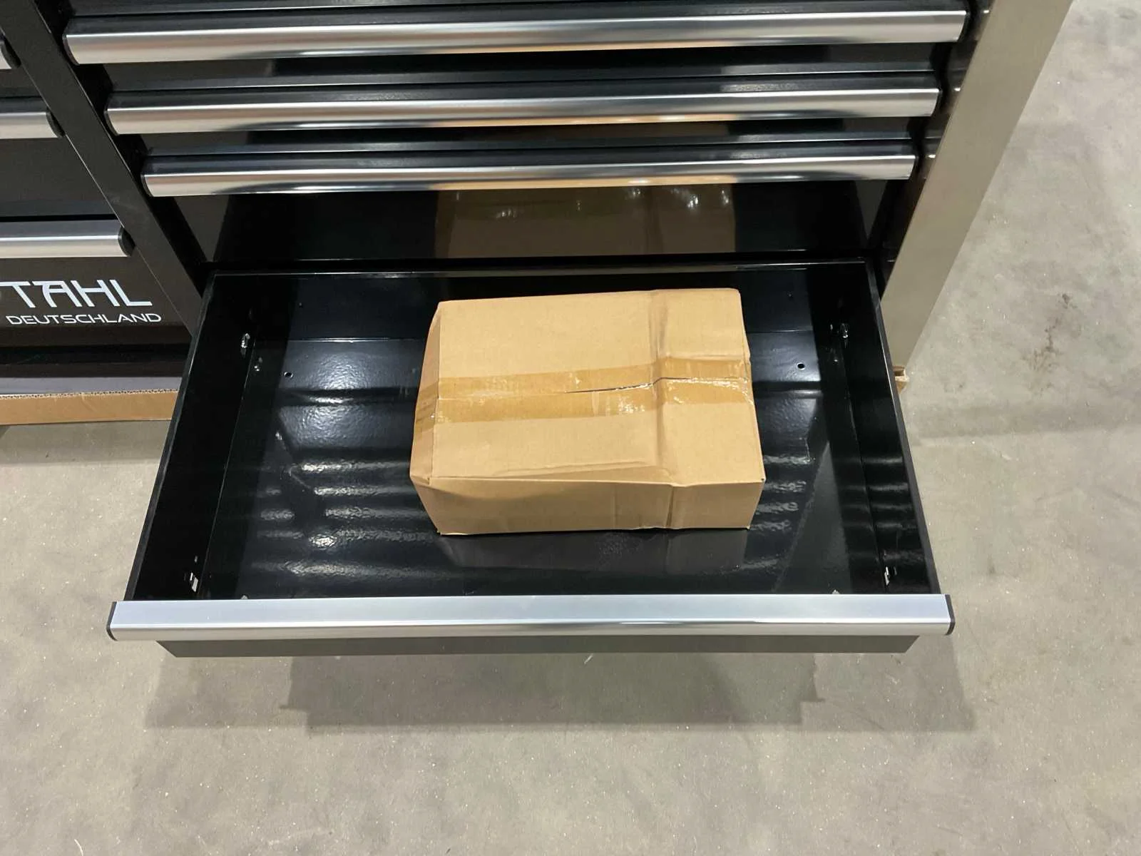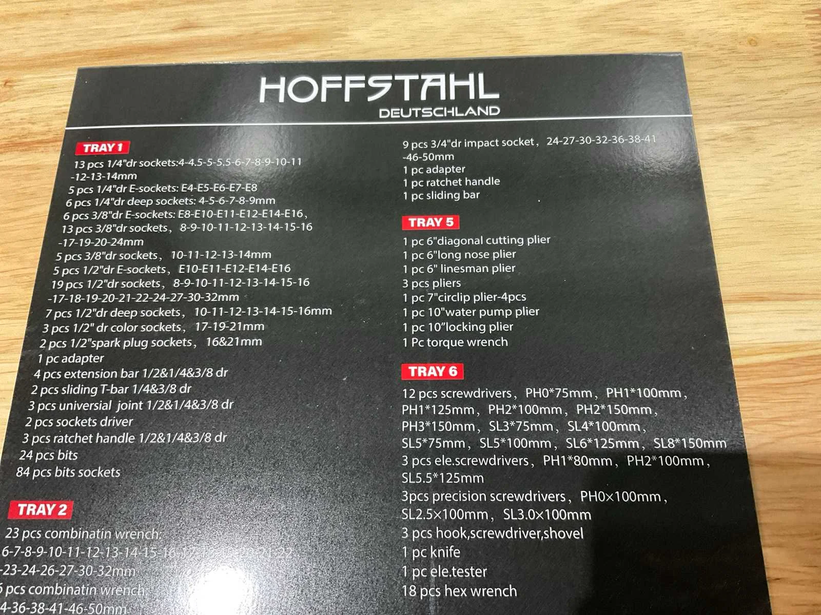 9 lades met professioneel gereedschap; ingelegd in foam; houten werkblad; afsluitbaar; ongebruikt Merk: Hoffstahl Model: XXXL-Edition Lengte: 135cm Breedte: 52cm Hoogte: 108cm
