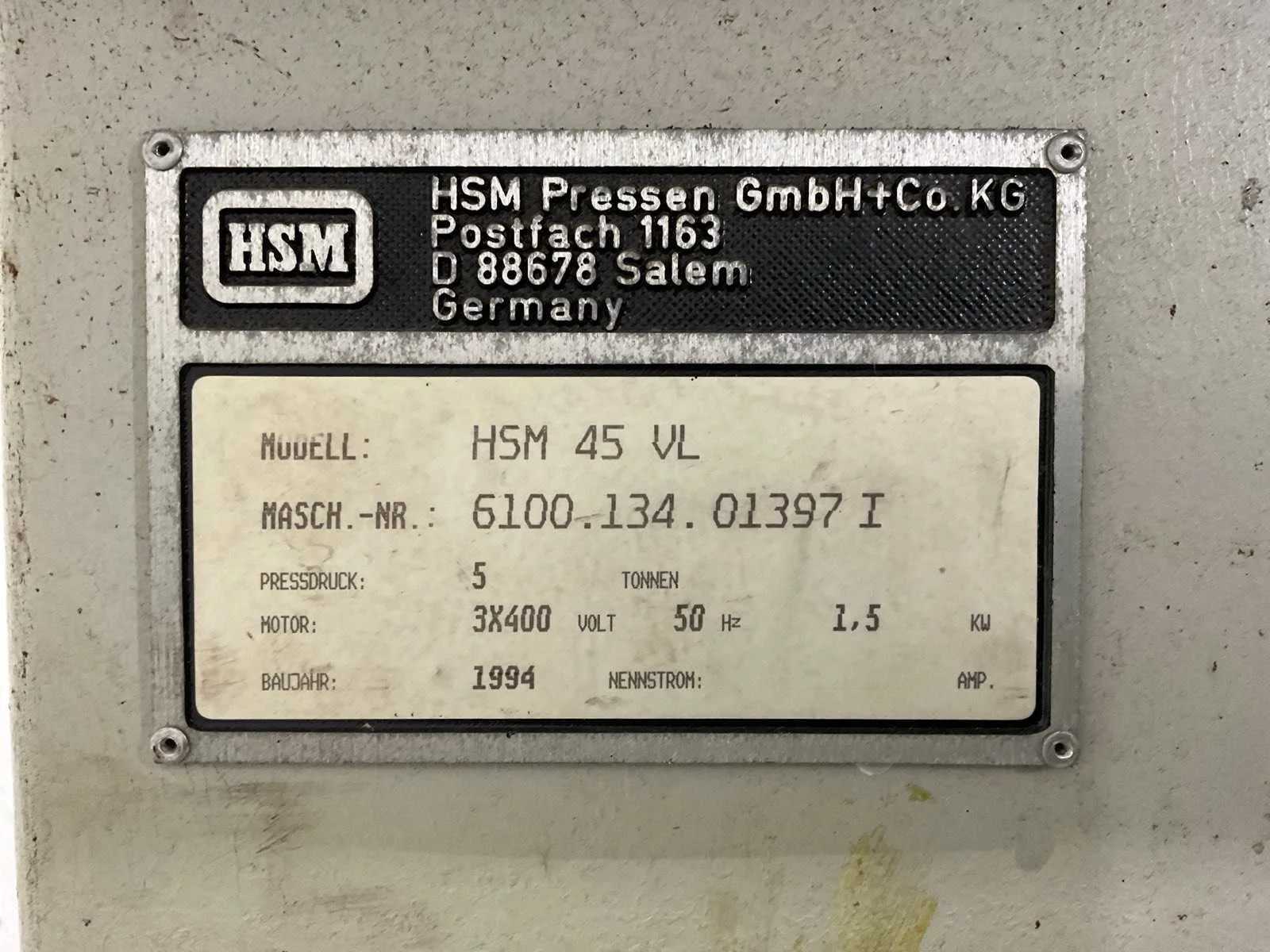 Merk: HSM Type: 45 VL Bouwjaar: 1994 Totale afmeting L: 800mm Totale afmeting Breedte: 1050mm Totale afmeting Hoogte: 2150mm