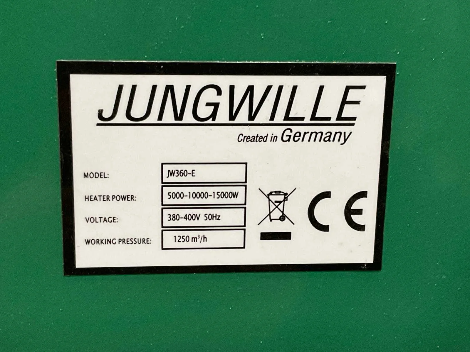 Werkend Merk: Jungwille Type: JW360-E Ventilator: true Totale afmeting L: 500mm Totale afmeting Breedte: 420mm Totale afmeting Hoogte: 870mm Aansluiting: 380V