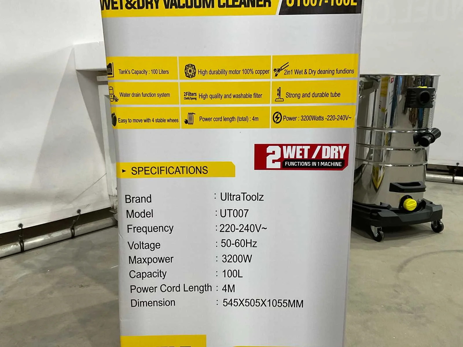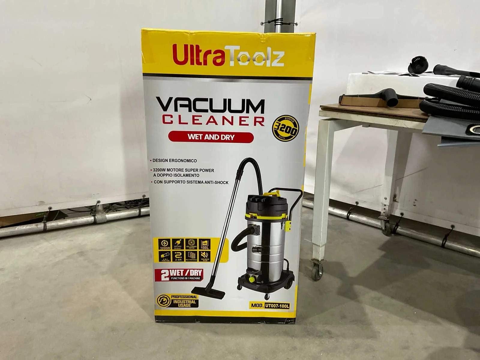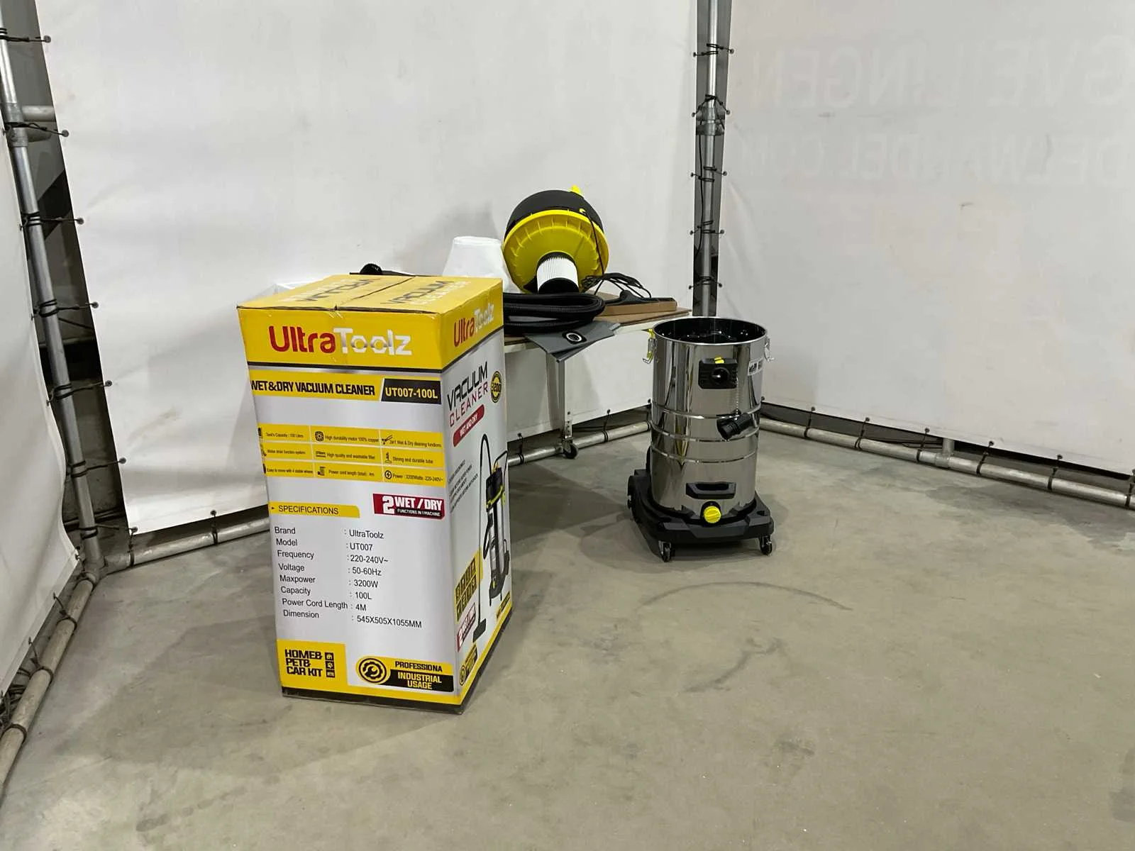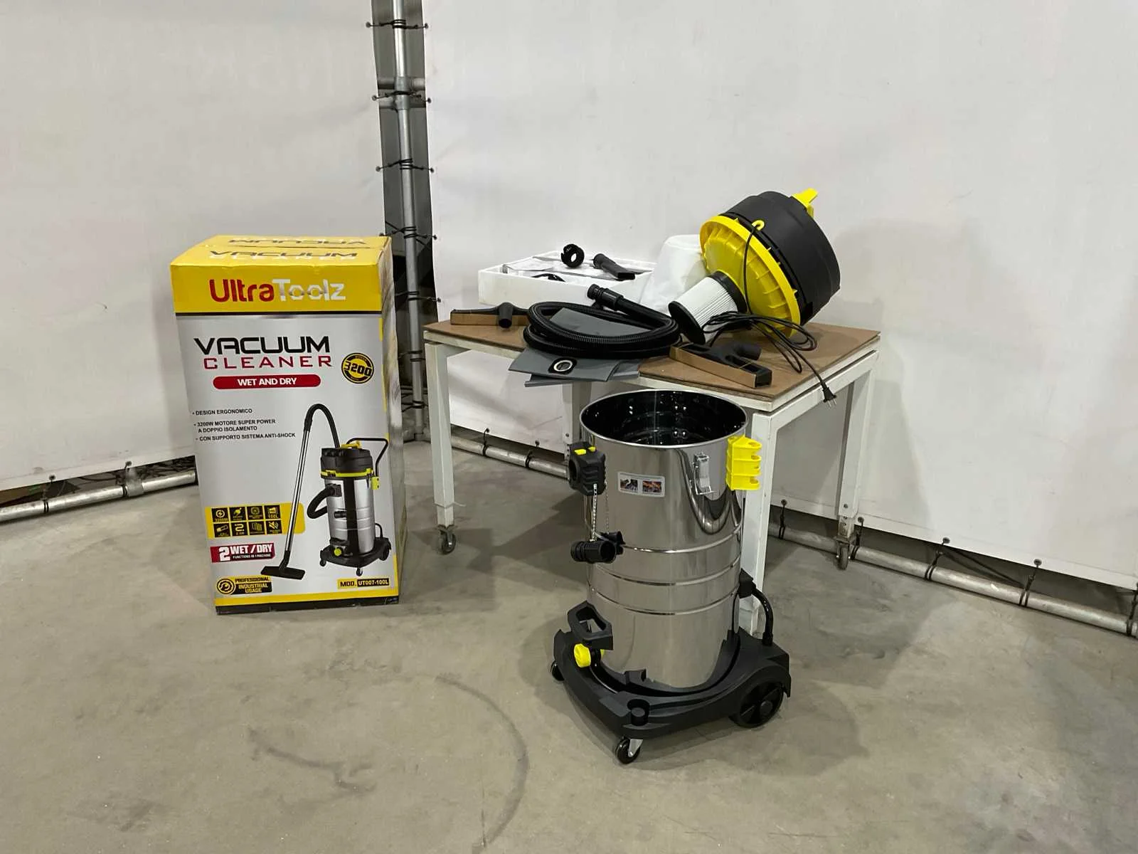 Nat en droog stofzuiger; ongebruikt Merk: UltraToolz Model: UT007-100L Vermogen: 3200W Spanning: 220V