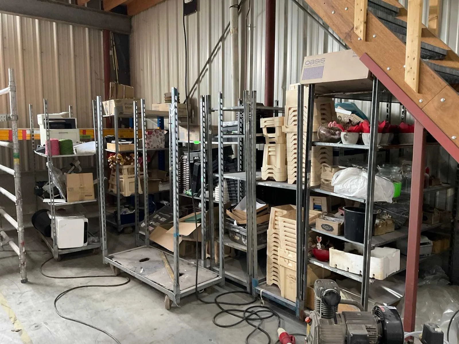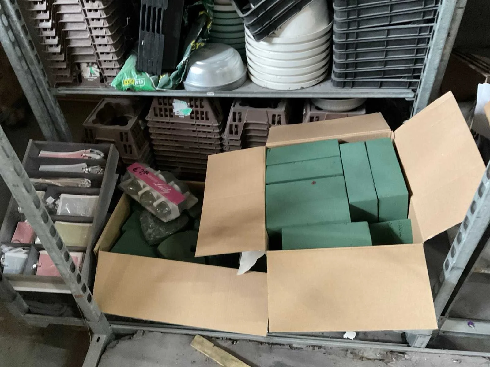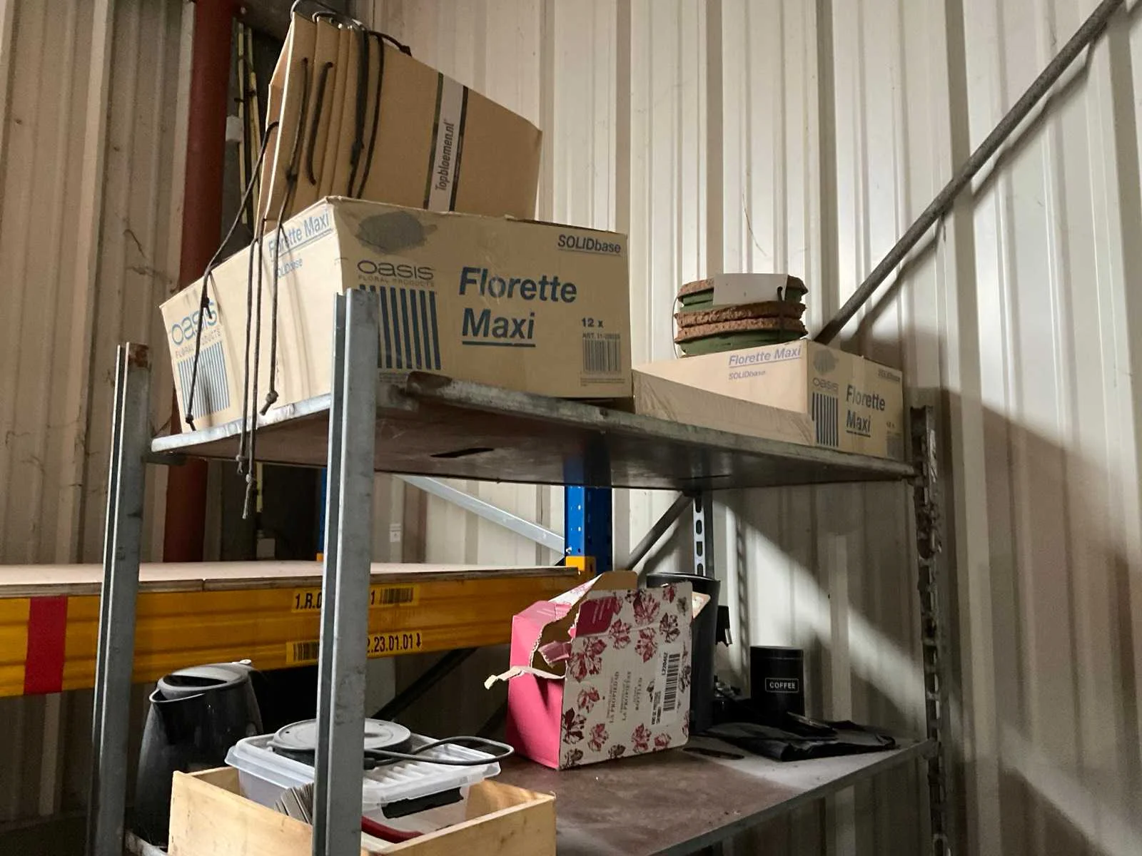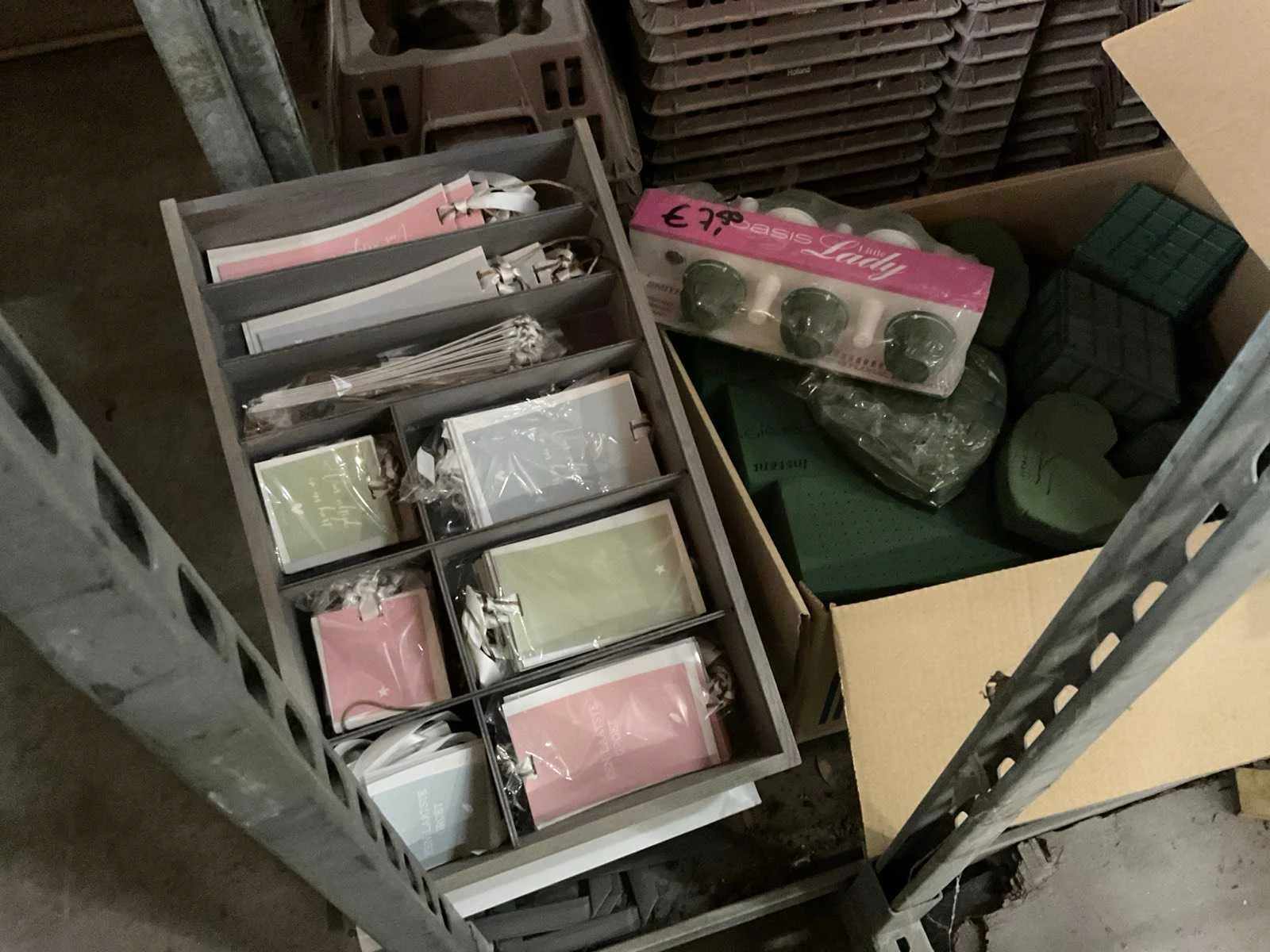 7 rekken met allerlei decoratie materiaal; kantoor inventaris; afkomstig uit bloemen winkel