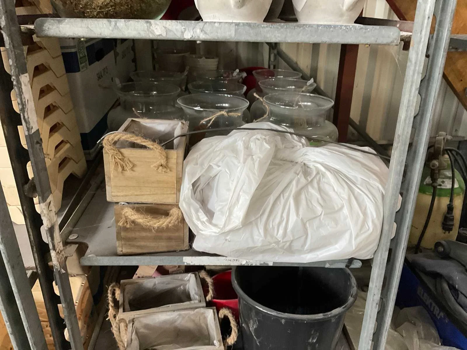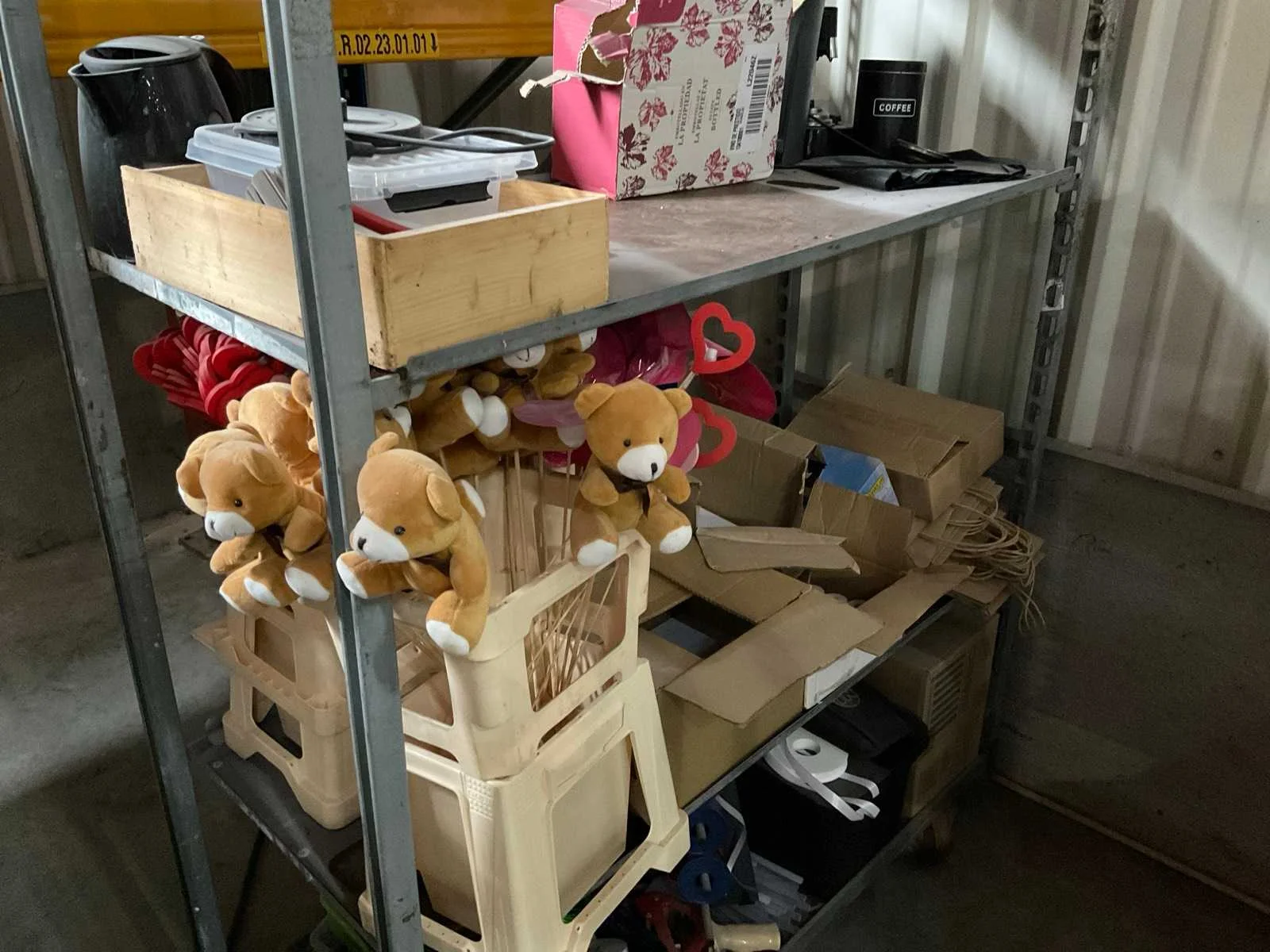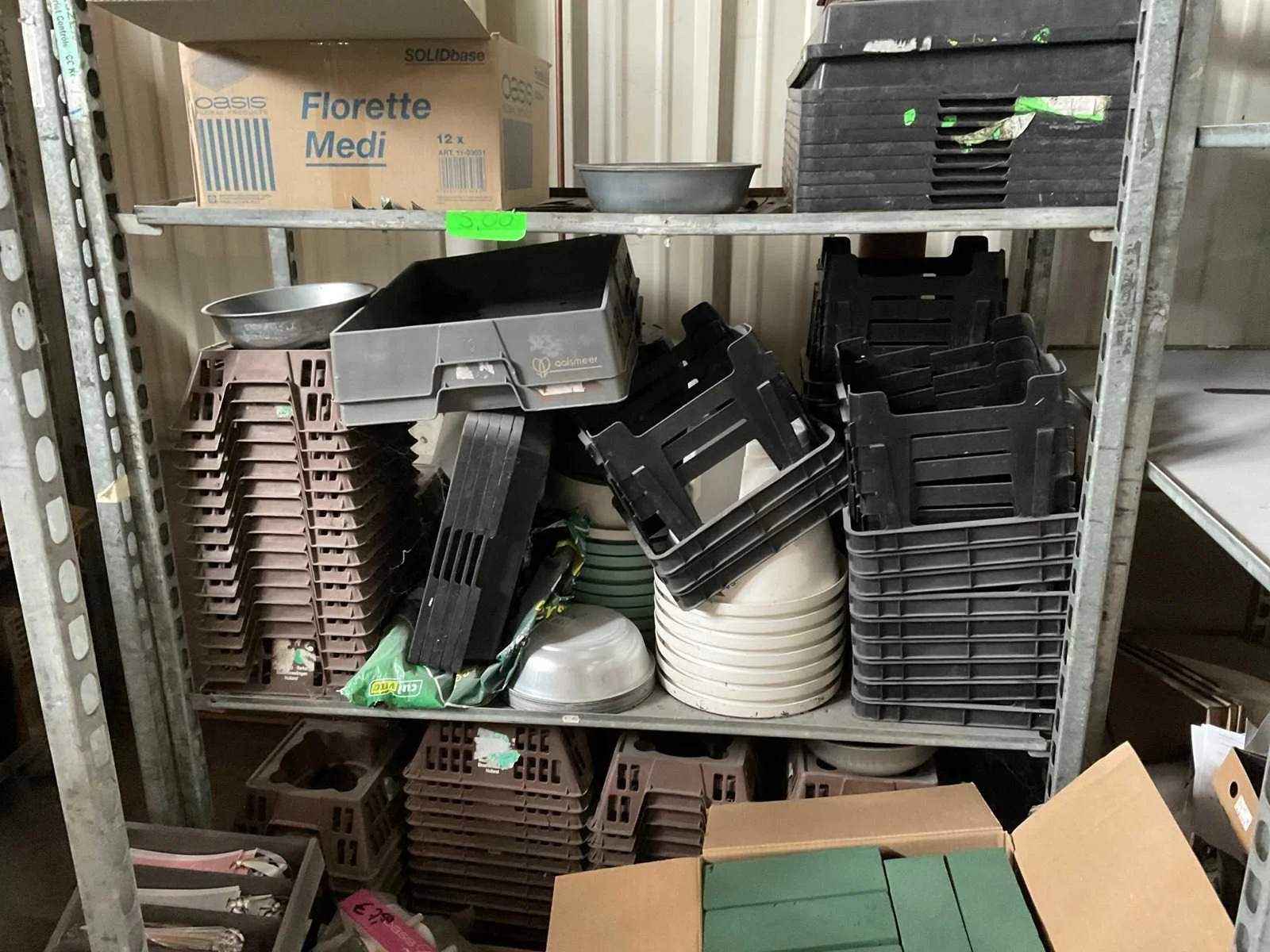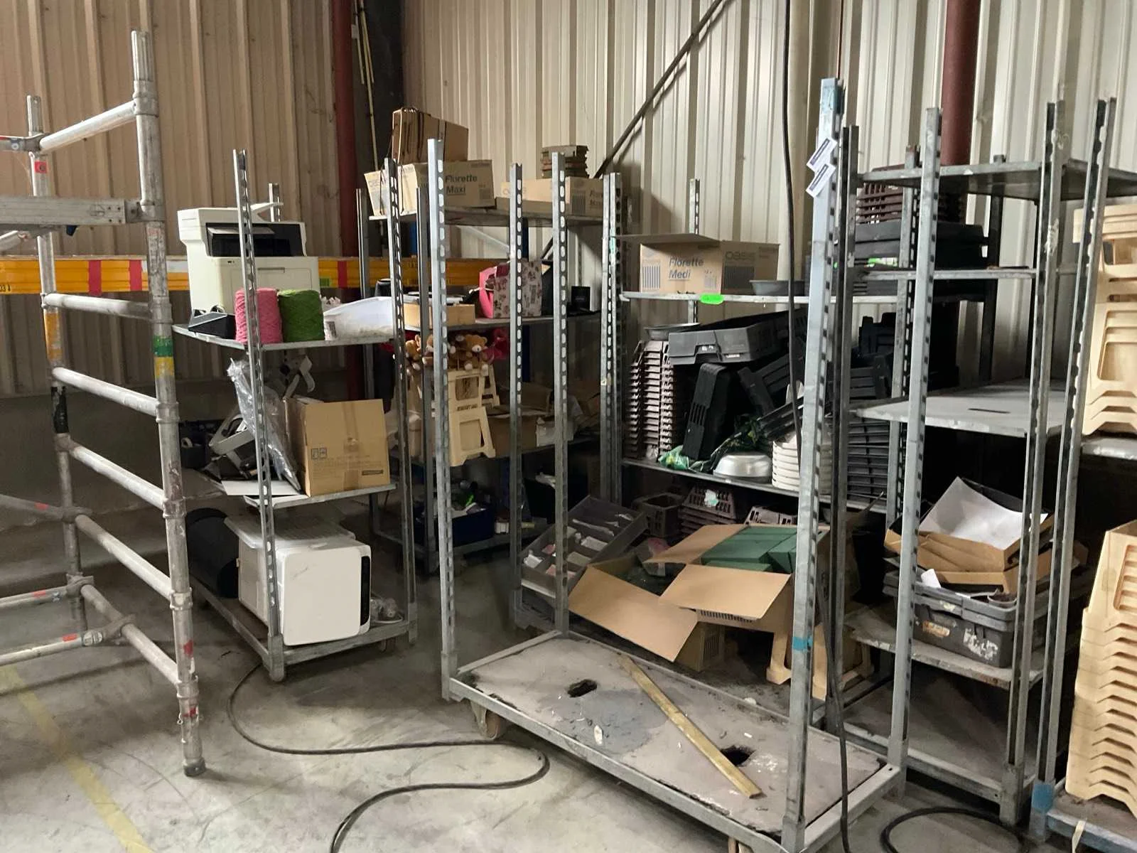 7 rekken met allerlei decoratie materiaal; kantoor inventaris; afkomstig uit bloemen winkel