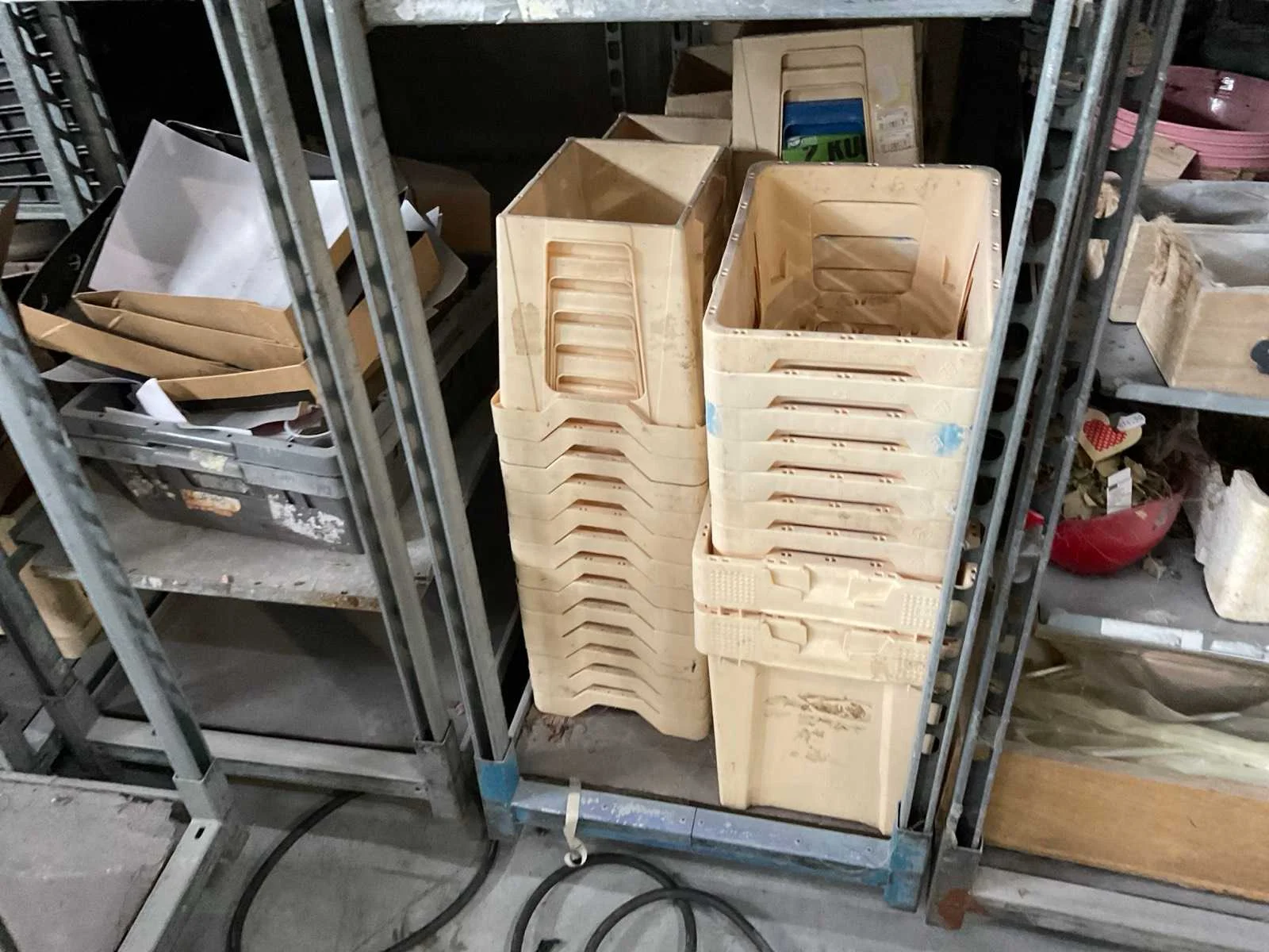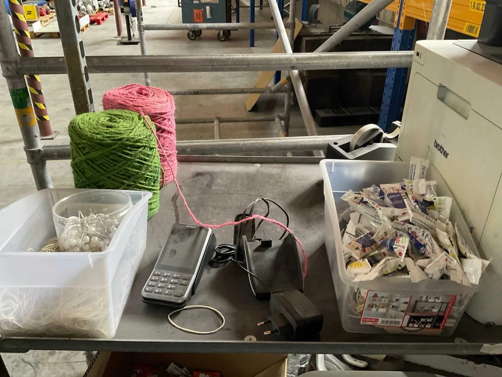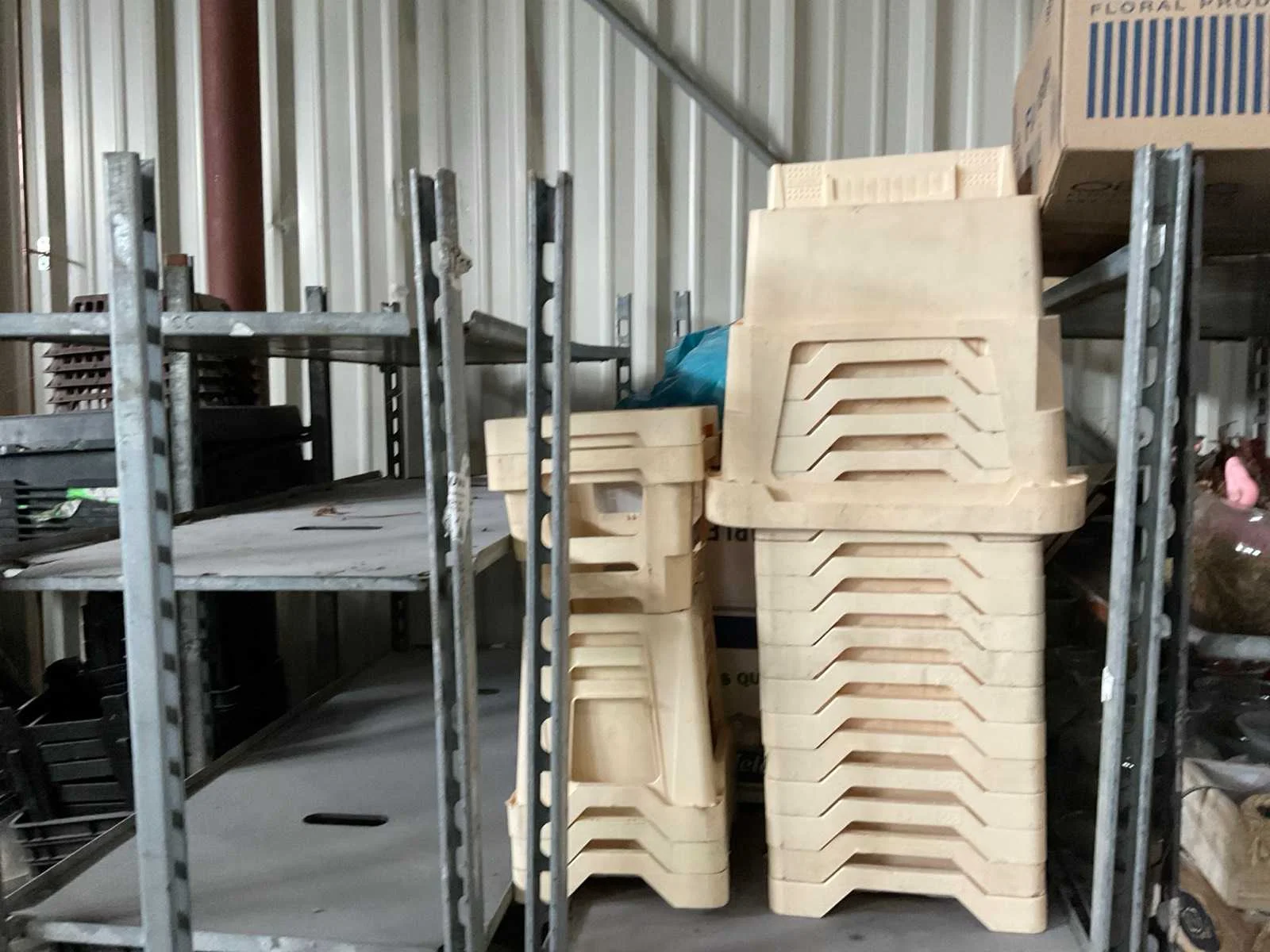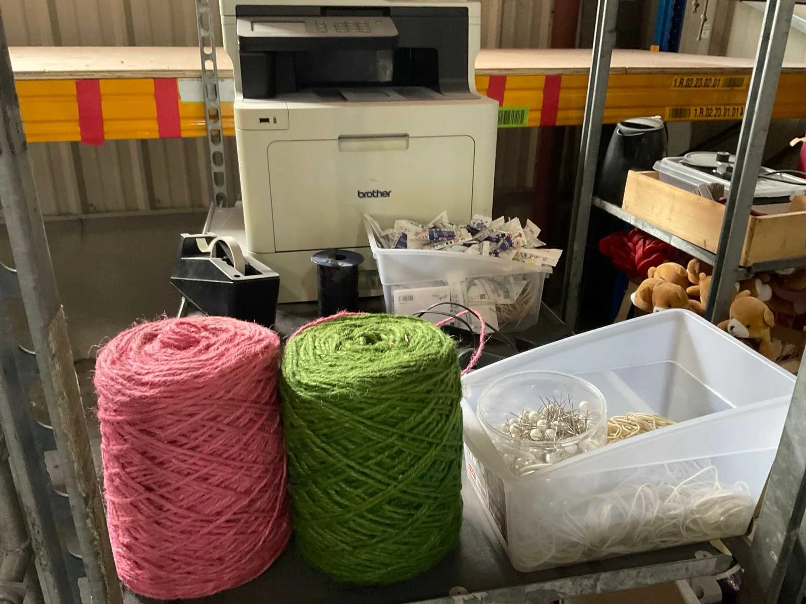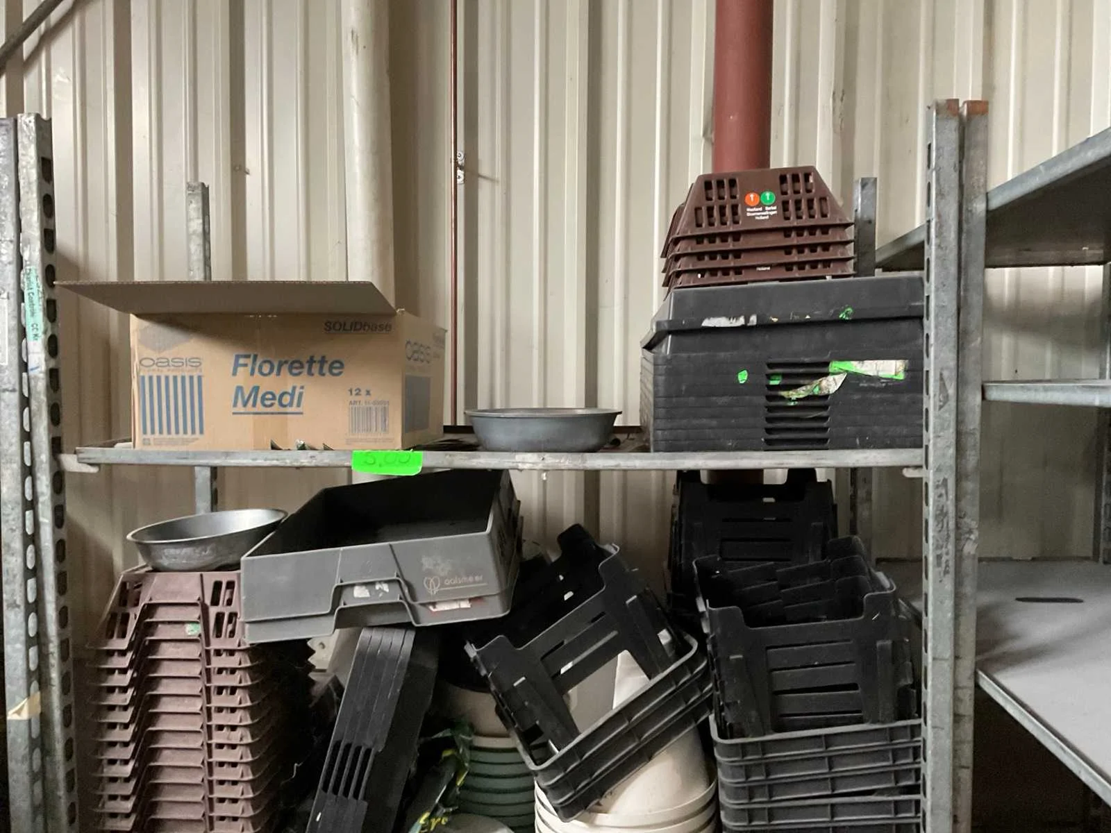7 rekken met allerlei decoratie materiaal; kantoor inventaris; afkomstig uit bloemen winkel