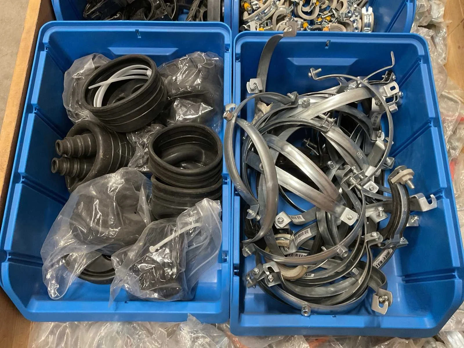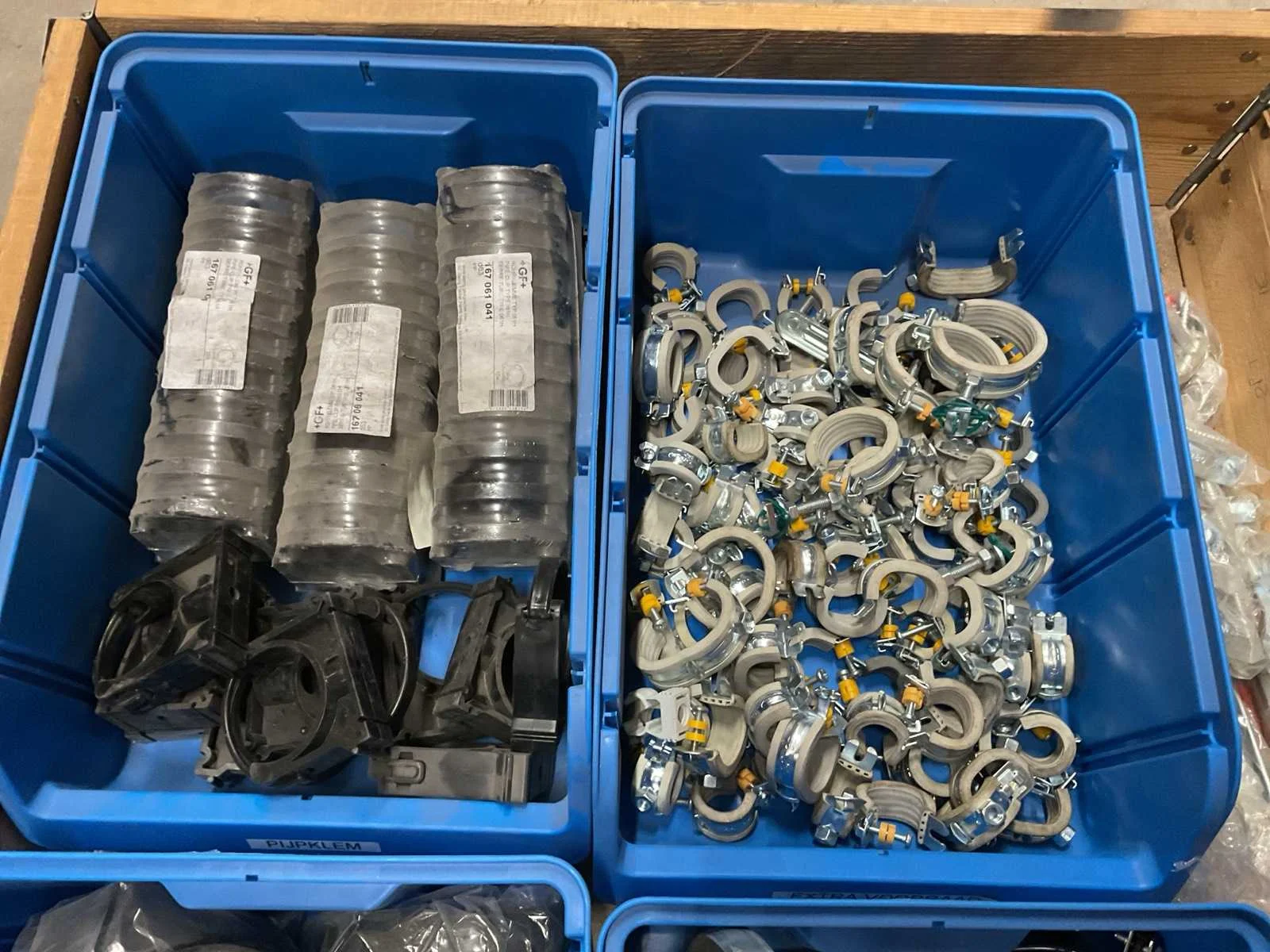 Incl. 4x kunststof magazijnbak. Bestaande uit: o.a. leidingbeugels, rubberen manchetten, buisklemmen, etc.