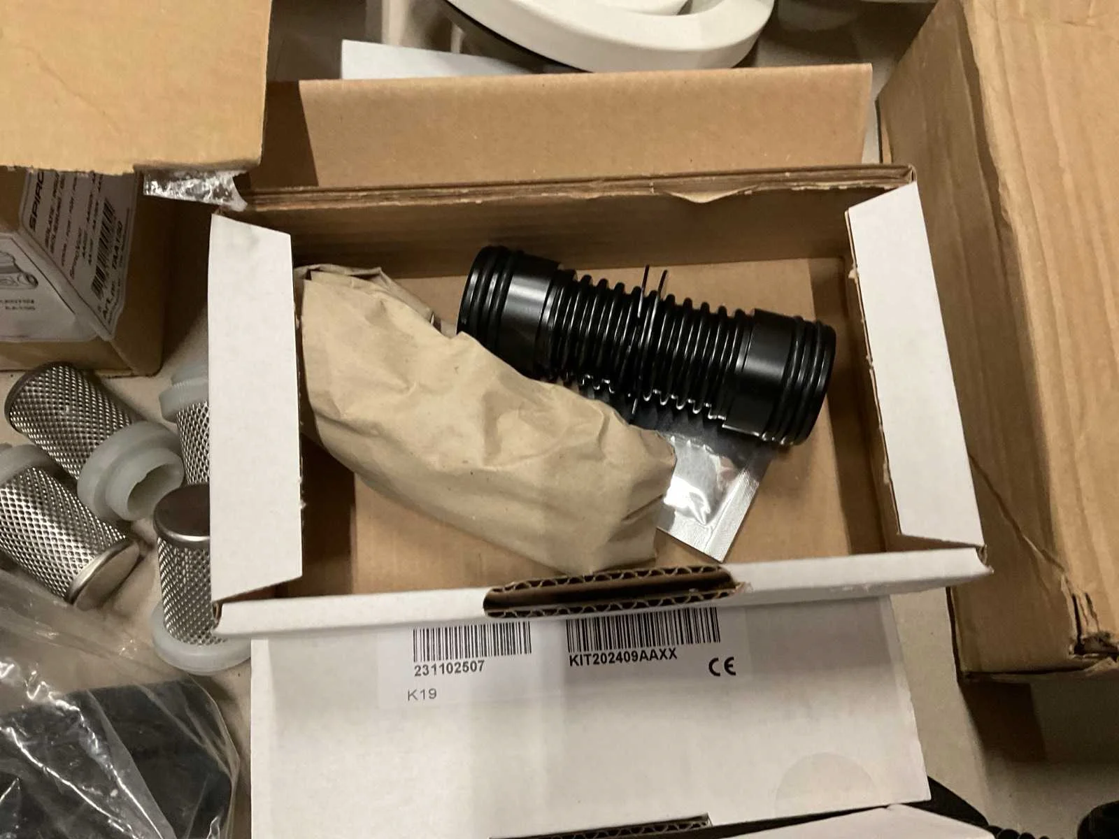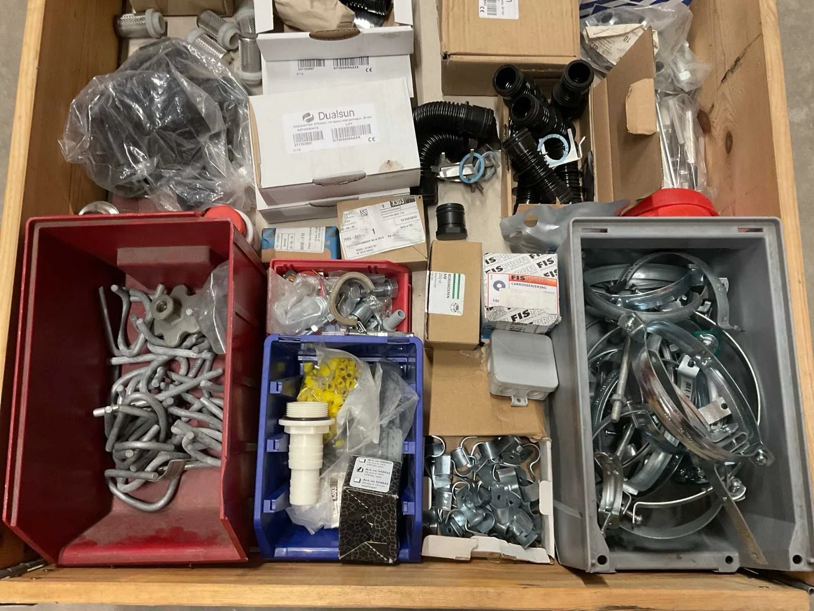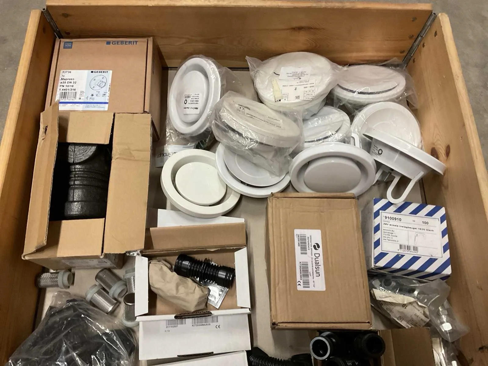 Incl. kunststof magazijnbakken. Bestaande uit: o.a. toevoerventielen, leidingbeugels, koppelstukken, filters, bevestigingsmaterialen, etc.